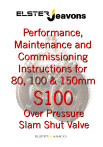 Slam Shut Valve Catalogue G maattiioonn Geenneerraall IInnffoorrm Commissioning Instructions H w ttoo iinnssttaallll tthhee uunniitt Hoow C D CSS11000011D E F ESS11000011F General Arrangements B wiinnggss Drraaw mbbllyy D Asssseem Booddyy A LLoow mbbllyy Asssseem OA PSSO OP Prreessssuurree O mP Meeddiiuum w // M H mbbllyy Asssseem OA PSSO OP Prreessssuurree O Hiigghh P Parts List B mbbllyy Asssseem Booddyy A LLoow mbbllyy Asssseem OA PSSO OP Prreessssuurree O mP Meeddiiuum w // M H mbbllyy Asssseem OA PSSO OP Prreessssuurree O Hiigghh P O Oppttiioonnss aanndd SSppaarreess S Taabbllee Spprriinngg T LLooaaddiinngg SSpprriinnggss A Avvaaiillaabbllee M Maaiinntteennaannccee IInnssttrruuccttiioonnss B mbbllyy Asssseem Booddyy A LLoow mbbllyy Asssseem OA PSSO OP Prreessssuurree O mP Meeddiiuum w // M H mbbllyy Asssseem OA PSSO OP Prreessssuurree O Hiigghh P B1001.A July 2002 SLAM SHUT VALVE INLET PRESSURES UP TO 19 BAR (275PSIG) APPLICATION The S100 Slam Shut Valve protects gas installations against dangerous overpressure conditions and is normally fitted on the inlet side of the regulator. An impulse pipe connects the diaphragm chamber to the outlet side of the regulator. When the pressure increases above a predetermined value the trigger mechanism actuates and the valve slams shut. The S100 incorporates a visual valve position indicator. Resetting can only be achieved manually and an automatic integral vent valve ensures safe resetting procedures and eliminates costly by-pass systems. The S100 can be mounted in any orientation. The unit can be specified with the reset mechanism on either side of the body. The Series 100 Slam Shut Valve has been designed to meet the requirements of BGES/V9 and DIN3381. SIZES 50mm, 80mm & 100mm (For sizes 150mm and 200mm see J98) NORMAL OPERATING TEMPERATURE -20°C to +80°C. CONNECTIONS Flanged connections to BS4504 NP16 and impulse tapping connection Rc¼ unless otherwise requested. APPROVAL The S100 has been approved to modules B + D of the PED 97/23/EC by BSI (Notified body No. 0086). It is classified as Category IV equipment and a safety accessory. TRIP OFF PRESSURES LOW PRESSURE Part No. mbar "wg / PSIG Colour Code 18 - 35 7 - 14"wg J10009-012 36 - 70 14 - 28"wg J10009-013 71 - 140 1 - 2 PSIG J10009-014 141 - 200 2 - 3 PSIG J10009-015 201 - 350 3 - 5 PSIG J10009-016 351 - 560 5 - 8 PSIG Light Blue Red / Brown Purple Orange / Yellow Orange / Green Part No. mbar HIGH PRESSURE PSIG Colour Code J10009-011 - MEDIUM PRESSURE DATASHEET CS1001 ISSUE D JUNE 2002 J10009-015 561 - 975 8 - 14 J10009-016 976 - 1400 14 - 20 Orange / Yellow Orange / Green Part No. Bar PSIG J10009-014 1 - 1.8 14 - 26 J10009-015 1.7 - 3.5 24 - 51 J10009-016 2.5 - 6 36 - 87 Colour Code Purple Orange / Yellow Orange / Green Page 1 of 4 SLAM SHUT VALVE 1. INTRODUCTION The Series 100 SLAM SHUT VALVE is an extremely high integrity device ensuring positive operation to the closed position in the event of control equipment failure. At the heart of the system is the ball bearing latch mechanism which has been well proven over the last two decades and is now the accepted standard against which other pressure operated security devices are judged. This mechanism provides predictable repeatability set point for any pressure within extremely close tolerances and is unaffected by the mounting position of the valve. In service the valve disc assembly is retained in the open position well away from the main gas flow. The bore of the valve is therefore completely uninterrupted resulting in low pressure losses and equally as important, minimal affect from gas turbulence on the valve assembly. Among its innovative design features are automatic pressure equalising valve, valve position indicator and in line servicing of all components including the valve seat. The Series 100 valve is preset to a desired safe pressure limit which will safeguard the down stream system or equipment and is automatically operated whenever this pressure limit is sensed. Re-arming is carried out manually. Remote indication of operation - The Series 100 Slam Shut can be provided with a switching device which will give remote indication of operation. 2. TRIP MECHANISM H MECHANISM - VALVE OPEN E As all operating components are spring loaded and latching mechanisms positively located the Series 100 Slam Shut is completely unaffected by vibration or external forces. Actuation can only be achieved via sensed pressure reaching the set point. In the trip mechanism a spring loaded shaft (A) acts downwards on a series of ball bearings (B) tending to force them radially outwards. The bearings are held against the shaft by the bearing cage (C) which is connected to the pressure sensing diaphragm (D). Diaphragm and bearing cage are spring loaded via the pressure setting spring (E). The valve disc assembly (F) is retained in the open position via the spring clip (G) which locates in a recess in the shaft (A). The valve disc assembly is spring loaded to the closed position thus forcing the spring clip against the recess. D A C B G VALVE OPERATION As the sense pressure rises to the desired trip point it acts against the pressure sensing diaphragm and pressure setting spring. The bearing cage is lifted allowing the ball bearings to move radially outwards against the bearing cage taper to a point where the shoulder diameter on the spring loaded shaft is free to pass through the bearings (TRIP POINT). As the shaft moves through the bearings it releases the spring clip (G) thereby allowing the valve disc assembly to operate to the closed position. A valve position indicator (H) indicates that the valve has moved to the closed position. DATASHEET CS1001 ISSUE D JUNE 2002 F Page 2 of 4 SLAM SHUT VALVE 3. INTEGRAL PRESSURE EQUALISING VALVE CAPACITY 1.0 9 8 7 6 5 PRESSURE DROP (D P)bar In the closed position pressure acts upon the valve ensuring positive lock-up forces. In order to re-arm the valve this pressure must first be equalised across the valve i