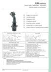 HG series Hand grip Hall effect joysticks Distinctive features and specifications Rugged, hand operation Hall effect sensing Sealed up to IP68 10 million life cycles Redundant outputs available Analog, USB and custom outputs CANbus J1939 and CANopen options available MECHANICAL (FOR X AND Y AXIS) ELECTRICAL • Break Out Force: 7.7N (1.70lbf) • Operating Force: 14.0N (3.10lbf) • Maximum Applied Force: 1000.0N (225.00lbf) • Mechanical Angle of Movement: 38º • Expected Life: 10 million cycles • Lever Action (Centering): Spring centering • Material: Glass reinforced nylon • Sensor: Hall effect • Supply Voltage Operating: 5.00VDC • Reverse Polarity Max: -14.5VDC • Overvoltage Max: 18VDC • Output Impedance: 6Ω • Current Consumption Max: 10mA max per axis • Return to Center Voltage (No Load): ±200mV STANDARD SWITCH CHARACTERISTICS/RATINGS MECHANICAL (FOR Z AXIS) • Break Out Torque: 0.6N·m (5.31lbf·in) • Operating Torque: 1.1N·m (9.74lbf·in) • Maximum Allowable Torque: 24.5N·m (216.84lbf·in) • Hand Mechanical Angle: 42º • Expected Life: 10 million cycles ENVIRONMENTAL¹ • Operating Temperature: -25ºC to 70ºC (-13ºF to 158ºF) • Storage Temperature: -40ºC to 70ºC (-40ºF to 158ºF) • Sealing: To IP65² • EMC Immunity Level (V/M): IEC 61000-4-8:2009 • EMC Emissions Level: IEC 61000-4-3:2006 • ESD: IEC 61000-4-2:2008 NOTES: – – – 1 2 • Electrical Resistive Load: 5A (depending on the chosen switch) • Electrical Inductive Load: 3A (depending on the chosen switch) • Low Level: 10mA @ 30mV (depending on the chosen switch) • Electrical Life: 1 million cycles 5A @ 28 VDC resistive snap-action (depending on the chosen switch) • Mechanical Life: 1million cycles • Environmental Seal: IP67 • Action: Momentary, snap-action • Operating Force: 7.5N±2.0N (1.69lbf±0.45lbf) • Total Travel: 0.080 inches max All values are nominal. Exact specifications may be subject to configuration. Contact Technical Support for the performance of your specific configuration. Environmental specifications are for joysticks configured with analog output voltage. Specifications may vary for other outputs. Excludes some handle options. Note: The company reserves the right to change specifications without notice. APEM www.apem.com HG series Hand grip Hall effect joysticks Overview HG SERIES Limiter Plate S R X Y P G H Handle¹ 10 21 22 33 43 34 44 Ball Tip (2 axis) Stock Grip (2 axis) Short Stock Grip (2 axis) Multifunction Square (2 axis) Multifunction Square (3 axis) Multifunction Oval (2 axis) Multifunction Oval (3 axis) 0 1 2 3 4 5 6 M Square Round Slotted Slotted Plus Guided Feel – Square Guided Feel – Round 0 U L T D I P H None One, Red Two, Red One, White Two, White One, Black Two, Black Multifunction* None One - Upper Position One - Lower Position Two Deadman Index Trigger Proximity Sensor Deadman & Index trigger8 Spring Tension5 * - Multifunction handle will be specified in an extension 00 10 20 NOTES: 1. 2. 3. 4. 5. 6. 7. 8. 0 1 2 3 4 Side Buttons Top Buttons Additional Options Output Options Standard Light6 Heavy 0V to 5V 0.5V to 4.5V 0.25V to 4.75V 1V to 4V 0V to 5V – Sensor 1 0V to 5V – Sensor 2 5 0.5V to 4.5V – Sensor 1 0.5V to 4.5V – Sensor 2 6 0.25V to 4.75V – Sensor 1 0.25V to 4.75V – Sensor 2 7 1V to 4V – Sensor 1 1V to 4V – Sensor 2 8 0V to 5V – Sensor 1 5V to 0V – Sensor 2 9 0.5V to 4.5V – Sensor 1 4.5V to 0.5V – Sensor 2 10 0.25V to 4.75V – Sensor 1 4.75V to 0.25V – Sensor 2 11 1V to 4V – Sensor 1 4V to 1V – Sensor 2 0-U USB 1-J Cursor Emulation 2-C CANbus J1939 3-C CANopen V E Voltage Regulator Environmental Sealing* Refer to previous page for information on standard configurations for joysticks with Stock Grip, Short Stock Grip, and Multifunction handles. Multifunction Oval may be configured with an index trigger and/or deadman paddle. Multifunction handle orders should be accompanied by drawing of button/component placement. Multifunction handle requires Drop-in mounting. X/Y axis spring tension. Contact Technical Support for information on best possible spring for your chosen configuration. Not recommended for use with multifunction handles. CANbus, USB and Voltage Regulator are mutually exclusive. Multifunction Oval only. *Environmental sealing level available up to IP68. Dependent upon handle configuration. Mounting accessories. Standard hardware includes: 1 gasket, 4 nuts (1/4-20), 4 washers (1/4), 4 hex head screws (1/4-20x1 1/4). STOCK GRIP HANDLE¹ SHORT STOCK GRIP HANDLE² AVAILABLE BUTTON COLORS White Top and Side buttons Deadman MULTIFUNCTION HANDLE SQUARE FACEPLATE³ Gray Black Red4 Orange Yellow Green Blue Purple Top buttons MULTIFUNCTION HANDLE OVAL FACEPLATE³ MULTIFUNCTION OVAL WITH DEADMAN PADDLE8 NOTES: 1. The maximum possible configuration for the Stock Grip handle is up to 2 Top Buttons and 2 Side Buttons. A handle with a Deadman can have 2 Top Buttons, but no Side Buttons. 2. The maximum possible configuration for the Short Stock Grip handle is up to 2 Top Buttons. OR 3. For non-standard configurations contact Technical Support. We can customize the faceplate according to your exact needs. 4. Top buttons and LEDs Index trigger Top buttons and LEDs If unspecified, the pushbuttons will have snap action momentary switches with red button caps. Index trigger Deadman paddle 5. Starting from the strain relief, the cable is 406mm (16in) long, Note: The company reserves the right to change specifications without notice. www.apem.com APEM HG series Hand grip Hall effect joysticks Overview 10 83.80 (3.30) Ø50.80 (2.00) Top View 83.80 (3.30) 11.20 (0.44) 210.80 (8.30) Ø6.70 (.265) Bottom View 88.90 (3.50) 61.00 (2.40) Strain Relief 20.30 (0.80) 71.10 (2.80) 61.00 (2.40) 21 83.80 (3.30) Top View 83.80 (3.30) Ø38.10 (1.50) 259.00 (10.20) 11.20 (0.44) Bottom View 61.00 (2.40) 71.10 (2.80) Strain Relief 20.30 (0.80) 88.90 (3.50) 61.00 (2.40) 22 83.80 (3.30) Top View 83.80 (3.30) 1