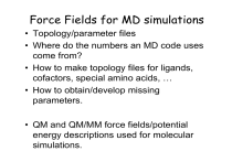 Force Fields for MD simulations • Topology/parameter files • Where do the numbers an MD code uses come from? • How to make topology files for ligands, cofactors, special amino acids, … • How to obtain/develop missing parameters. • QM and QM/MM force fields/potential energy descriptions used for molecular simulations. The Potential Energy Function Ubond = oscillations about the equilibrium bond length Uangle = oscillations of 3 atoms about an equilibrium bond angle Udihedral = torsional rotation of 4 atoms about a central bond Unonbond = non-bonded energy terms (electrostatics and Lenard-Jones) Energy Terms Described in the CHARMm Force Field Bond Dihedral Angle Improper Classical Molecular Dynamics r (t + !t ) = r (t ) + v (t )!t v (t + !t ) = v (t ) + a (t )!t a (t ) = F(t) / m d F = ! U (r ) dr Classical Molecular Dynamics 1 qi q j U (r ) = 4!" 0 rij Coulomb interaction 12 6 &, R # ) , ) R U (r ) = . ij $* min,ij ' - 2* min,ij ' ! * r ' ! $*+ rij '( + ij ( " % van der Waals interaction Classical Molecular Dynamics Classical Molecular Dynamics Bond definitions, atom types, atom names, parameters, …. What is a Force Field? In molecular dynamics a molecule is described as a series of charged points (atoms) linked by springs (bonds). To describe the time evolution of bond lengths, bond angles and torsions, also the non-bonding van der Waals and elecrostatic interactions between atoms, one uses a force field. The force field is a collection of equations and associated constants designed to reproduce molecular geometry and selected properties of tested structures. Energy Functions Ubond = oscillations about the equilibrium bond length Uangle = oscillations of 3 atoms about an equilibrium bond angle Udihedral = torsional rotation of 4 atoms about a central bond Unonbond = non-bonded energy terms (electrostatics and Lenard-Jones) Parameter optimization of the CHARMM Force Field Based on the protocol established by Alexander D. MacKerell, Jr , U. Maryland See references: www.pharmacy.umaryland.edu/faculty/amackere/force_fields.htm Especially Sanibel Conference 2003, JCC v21, 86,105 (2000) Interactions between bonded atoms Vangle = K" (" # " o ) 2 ! Vbond = K b (b " bo ) 2 Vdihedral = K" (1 + cos(n" # ! )) 2 Vbond = K b (b ! bo ) Chemical type Kbond bo C-C 100 kcal/mole/Å 2 1.5 Å C=C 200 kcal/mole/Å 2 1.3 Å C=C 400 kcal/mole/Å 2 1.2 Å Bond Energy versus Bond length Potential Energy, kcal/mol 400 300 Single Bond 200 Double Bond Triple Bond 100 0 0.5 1 1.5 2 2.5 Bond length, Å Bond angles and improper terms have similar quadratic forms, but with softer spring constants. The force constants can be obtained from vibrational analysis of the molecule (experimentally or theoretically). Dihedral Potential Vdihedral = K" (1 + cos(n" # ! )) Dihedral energy versus dihedral angle Potential Energy, kcal/mol 20 15 K=10, n=1 10 K=5, n=2 K=2.5, N=3 5 0 0 60 120 180 240 Dihedral Angle, degrees δ = 0˚ 300 360 Nonbonded Parameters 12 6 & , Rmin,ij ) , Rmin,ij ) # qi q j ' - 2* ' ! + / ij $* . * r ' ! $*+ rij '( nonbonded 40Drij + ij ( " % qi: partial atomic charge D: dielectric constant ε: Lennard-Jones (LJ, vdW) well-depth Rmin: LJ radius (Rmin/2 in CHARMM) Combining rules (CHARMM, Amber) Rmin i,j = Rmin i + Rmin j εi,j = SQRT(εi * εj ) From MacKerell Electrostatic Energy versus Distance 100 Interaction energy, kcal/mol 80 60 40 20 q1=1, q2=1 0 -20 0 1 2 3 4 5 6 7 8 q1=-1, q2=1 -40 -60 -80 -100 Distance, Å Note that the effect is long range. From MacKerell Charge Fitting Strategy CHARMM- Mulliken* AMBER(ESP/RESP) Partial atomic charges 0.5 C -0.5 0.35 O H N -0.45 *Modifications based on interactions with TIP3 water van der Waals interaction Lennard-Jones Energy versus Distance Interaction Energy, kcal/mol 0.9 0.7 0.5 0.3 e=0.2,Rmin=2.5 0.1 -0.1 1 eps,i,j 2 3 4 5 6 7 8 -0.3 -0.5 Rmin,i,j From MacKerell Distance, Å 12 6*# & # & Rmin,ij Rmin,ij / , "ij %% (( ) 2%% (( ,$ rij ' $ rij ' /. + Short range CHARMM Potential Function PDB file Topology PSF file geometry parameters Parameter file File Format/Structure • • • • • The structure of a pdb file The structure of a psf file The topology file The parameter file Connection to potential energy terms Structure of a PDB file index resname name chain resid X Y Z segname ATOM 22 N ALA B 3 -4.073 -7.587 -2.708 1.00 0.00 BH ATOM 23 HN ALA B 3 -3.813 -6.675 -3.125 1.00 0.00 BH ATOM 24 CA ALA B 3 -4.615 -7.557 -1.309 1.00 0.00 BH ATOM 25 HA ALA B 3 -4.323 -8.453 -0.704 1.00 0.00 BH ATOM 26 CB ALA B 3 -4.137 -6.277 -0.676 1.00 0.00 BH ATOM 27 HB1 ALA B 3 -3.128 -5.950 -0.907 1.00 0.00 BH ATOM 28 HB2 ALA B 3 -4.724 -5.439 -1.015 1.00 0.00 BH ATOM 29 HB3 ALA B 3 -4.360 -6.338 0.393 1.00 0.00 BH ATOM 30 C ALA B 3 -6.187 -7.538 -1.357 1.00 0.00 BH ATOM 31 O ALA B 3 -6.854 -6.553 -1.264 1.00 0.00 BH ATOM 32 N ALA B 4 -6.697 -8.715 -1.643 1.00 0.00 BH ATOM 33 HN ALA B 4 -6.023 -9.463 -1.751 1.00 0.00 BH ATOM 34 CA ALA B 4 -8.105 -9.096 -1.934 1.00 0.00 BH ATOM 35 HA ALA B 4 -8.287 -8.878 -3.003 1.00 0.00 BH ATOM 36 CB ALA B 4 -8.214 -10.604 -1.704 1.00 0.00 BH ATOM 37 HB1 ALA B 4 -7.493 -11.205 -2.379 1.00 0.00 BH ATOM 38 HB2 ALA B 4 -8.016 -10.861 -0.665 1.00 0.00 BH ATOM 39 HB3 ALA B 4 -9.245 -10.914 -1.986 1.00 0.00 BH ATOM 40 C ALA B 4 -9.226 -8.438 -1.091 1.00 0.00 BH ATOM 41 O ALA B 4 -10.207 -7.958 -1.667 1.00 0.00 BH 00000000000000000000000000000000000000000000000000000000000000000000000000 10 20 30 40 50 60 70 >>> It is an ascii, fixed-format file <<< “No connectivity information” VMD Atom Selection Commands index ATOM ATOM resname name 22 23 chain N HN ALA B ALA B 3 3 resid -4.073 -3.813 X Y -7.587 -6.675 segname Z -2.708 -3.125 1.00 1.00 0.00 0.00 BH BH (name CA CB) and (resid 1 to 4) and (segname BH) protein and resname LYS ARG GLU ASP water and within 5 of (protein and resid 62 and name CA) water and within 3 of (protein and name O and z < 10) Checking file structures • PDB file • Topology file • PSF file • Parameter file
