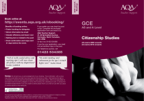 Book online at: http://events.aqa.org.uk/ebooking/ Benefits of booking online: • Faster booking for delegates • Direct information by email • Greater efficiency and lower cost • Nothing lost or mislaid in the post • Final confirmation and maps sent 21 days before the event. If you prefer you may book by post or fax. Complete the enclosed application form and send it to: AQA Teacher Support, 31-33 Springfield Avenue, Harrogate, North Yorkshire, HG1 2HW Or fax it to: 01423 534360 If you fax your application, you need not put another copy in the post. For telephone queries, call 01423 534385 “Full of really useful advice and teaching tips! I will now share all of these with my department” “My understanding (and enthusiasm for the spec) is much higher now!” Teacher, Bristol Teacher, Guildford Terms: We will send you an acknowledgement of your booking. Final confirmation, with a venue map will be sent either by email if you have opted for this service or letter. AQA reserves the right to re-schedule or cancel an event and will endeavour to give adequate notice. AQA is not responsible for associated costs incurred by delegate or centre when booking onto, attending an event, or arising from cancellation/postponement. If you are unable to attend please inform us so that we can offer your place to another teacher on the waiting list. The Assessment and Qualifications Alliance (AQA) is a company limited by guarantee registered in England and Wales (company number 3644723) and a registered charity (registered charity number 1073334). Registered address: AQA, Devas Street, Manchester M15 6EX. Dr Michael Cresswell Director General. GCE Launch Meetings GCE Launch Meetings Teacher Support Teacher Support GCE AS and A Level Citizenship Studies AS exams 2009 onwards A2 exams 2010 onwards AQA brings Citizenship Studies to life. an informed citizen; At AS Level the specification enables students to develop a range of skills which can be applied far beyond the study of Citizenship. Candidates will address the relationship between the individual, the law and the state and the nature of identities. a participating citizen; and Unit 1 covers: an active citizen. • What does it mean to be British? Introducing AQA’s new course specification for Citizenship Studies for AS and A Level. This new specification builds on AQA’s Citizenship expertise and has been designed to enable students to move through the three stages of Citizenship development to become: • • • AS • Are we all equal citizens? The following information and specification outline will enable both practising Teachers and Subject Heads to be better informed and supported in the teaching of this subject, particularly if attending one of AQA’s Teacher Support meetings. Full details of AQA’s invaluable Teacher Support meetings can be found at the end of this leaflet. • What are my rights and responsibilities? • How are my rights protected? Unit 2 covers: • Who can make a difference? • How can I make a difference? • Active Citizenship Skills and Participation. A2 At A2 Level the specification continues to require students to be actively involved in a range of citizenship activities. Candidates will study the principles and characteristics of justice systems, the nature of representative democracy, the role of parliament in the UK, and global citizenship issues. Unit 3 covers: • What is Crime? • What is Justice? • Who speaks on our behalf? • How is the UK governed? Unit 4 covers: • Universal Human Rights • Global Issues • Active Citizenship: Making a Difference. Assessment Objectives 2 AO1 • demonstrate knowledge and understanding of specific citizenship issues (problems, events, concepts, ideas, processes and opinions) • relate subject knowledge and understanding to citizenship issues using a range of real and topical examples. AO2 • analyse issues, problems and events in relation to the citizenship concepts and topics studied • evaluate information, views, opinions, ideas and arguments and assess their validity. AO3 • select, organise and present relevant information and arguments clearly and logically, using specialist terminology • construct and advocate reasoned, coherent arguments with conclusions, drawing on evidence of their own participation and actions within the study of citizenship. AO4 • synthesise knowledge, ideas and concepts from different areas of the subject in order to generalise, argue a case or propose alternative solutions. AQA’s GCE in Citizenship Studies Among the many benefits, this new specification is designed to encourage candidates to: See the end of this leaflet for full meeting details and how to book a free place. • communicate and articulate different views, ideas and perspectives; • advocate, negotiate, plan, make decisions and take action on citizenship issues; • select, interpret, analyse and evaluate information to construct reasoned and coherent arguments, make decisions, propose alternative solutions and form conclusions; • work with others, using problem solving and critical approaches to the issues, problems and events. 3 Draft (Feb 07) Specification Outline - Details of FREE meetings overleaf AS Unit 1 Identity and Democracy Unit 3 Power and Justice Written Paper: 1 hour 15 minutes Weighting: 40% of total AS Level marks 20% of total A Level marks Written Paper: 1 hour 30 minutes Weighting: 50% of total A2 Level marks 25% of total A Level marks The question paper consists of two sections: The question paper consists of two sections: • Identity • Rights and Responsibilities A2 • Crime, Justice and Punishment • Power, Politics and Participation Each section contains one compulsory source-based question followed by two mini-essay questions. Each section contains three questions with two parts (15 marks, 25 marks). Candidates must answer the compulsory question followed by one mini-essay question in each section. Candidates answer 