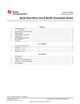 User's Guide SCAU040 – March 2010 Quad Sine-Wave Clock Buffer Evaluation Board 1 2 3 4 5 6 7 8 Contents General Description ......................................................................................................... 1.1 Features ............................................................................................................. Signal Path and Control Circuitry ......................................................................................... Getting Started .............................................................................................................. Power-Supply Connections ................................................................................................ Output Clock ................................................................................................................. Enabling/Disabling Outputs ................................................................................................ Bill of Materials .............................................................................................................. Schematic .................................................................................................................... 2 2 2 3 3 3 3 4 6 List of Figures 1 CDC3S04 Evaluation Board ............................................................................................... 2 2 Schematic – (1 of 3) ........................................................................................................ 6 3 Schematic – (2 of 3) ........................................................................................................ 7 4 Schematic – (3 of 3) ........................................................................................................ 8 1 Clock Source List of Tables 2 3 4 5 ................................................................................................................ Supply source ............................................................................................................... Outputs on the CDC3S04EVM ............................................................................................ Jumpers to Control the CDC3S04 ........................................................................................ Bill of Materials .............................................................................................................. 3 3 3 3 4 I2C is a trademark of NXP B.V Corporation. SCAU040 – March 2010 Submit Documentation Feedback Quad Sine-Wave Clock Buffer Evaluation Board Copyright © 2010, Texas Instruments Incorporated 1 General Description www.ti.com Figure 1. CDC3S04 Evaluation Board 1 General Description The CDC3S04 is a four-channel low-power sine-wave clock buffer. It can be used to buffer a single master clock to multiple peripherals. The four sine-wave outputs (CLK1–CLK4) are designed for minimal channel-to-channel skew and ultralow additive output jitter. Each output has its own clock request input which enables the dedicated clock output. These clock requests are active-high (can also be changed to be active-low via I2C™), and an output signal is generated that can be sent back to the master clock to request the clock (MCLK_REQ). MCKL_REQ is an open-source output and supports the wired-OR function (default mode). It needs an external pulldown resistor. MCKL_REQ can be changed to wired-AND or push-pull functionality via I2C. This evaluation module (EVM) is designed to demonstrate the electrical performance of the CDC3S04.Throughout this document, the acronym EVM and the phrases evaluation module and evaluation board are synonymous with the CDC3S04 EVM. Figure 1 illustrates the CDC3S04 EVM. For optimum performance, the board is equipped with 50Ω SMA connectors and well controlled 50Ω impedance microstrip transmission lines. 1.1 Features • • • • 2 Easy-to-use evaluation board to fan out low phase noise Easy device setup Control pins configurable though jumpers Board powered using USB or external supply Signal Path and Control Circuitry The CDC3S04 EVM has a TCXO soldered. If the customer wants to try out a different source then the EVM allows routing the external signal to the CDC3S04. Resistors must be solder or desolder. See Table 1 for each configuration. 2 Quad Sine-Wave Clock Buffer Evaluation Board Copyright © 2010, Texas Instruments Incorporated SCAU040 – March 2010 Submit Documentation Feedback Getting Started www.ti.com Table 1. Clock Source 3 Component TCXO on board External input R80 Not mounted Not mounted R74 Not mounted Not mounted R98 0R0 Not mounted R97 Not mounted 0R0 C8 15 pF 15 pF Getting Started The CDC3S04EVM has self-explanatory labeling and uses similar naming conventions as the CDC3S04 product data sheet (SCAS883). In this user’s guide, all words in boldface and italic print reflect the actual labeling on the EVM. 4 Power-Supply Connections The CDC3S04EVM has three pins that require external supply. Those pins are VDD_ANA, VDD_DIG and VBAT. These supplies can come from the USB or using an external power supply. See Table 2 for further information. Table 2. Supply source USB External Power Supply R113 = 0R0 J50 OFF R112 = Not mounted J51 OFF J50 ON P3 = VDD_ANA J51 ON P1 = VDD_DIG Also the CDC3S04 has an LDO build in that generates the supply for the TCXO. This voltage can be generated using the TPS71219 on board or the P2 connector. 5 Output Clock The outputs of the CDC3S04 are available on any of the SMA connectors Table 3. Outputs on the CDC3S04EVM 6 SMA Output J17 CLK1 J68 CLK2 J21 CLK3 J20 CLK4 Enabling/Disabling Outputs The CDC3S04EVM has several jumpers that can control the output enable of the CDC3S04. Table 4. Jumpers to Control the CDC3S04 SCAU040 – March 2010 Submit Documentation Feedback Jumper Function J66 REQ1 J67 REQ2 J68 REQ3 J69 REQ4 J74 RESET Quad Sine-Wave Clock Buffer Evaluation Board Copyright © 2010, Texas Instruments Incorporated 3 Bill of Mater