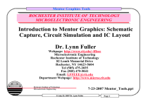 Mentor Graphics Tools ROCHESTER INSTITUTE OF TECHNOLOGY MICROELECTRONIC ENGINEERING Introduction to Mentor Graphics: Schematic Capture, Circuit Simulation and IC Layout Dr. Lynn Fuller Webpage: http://www.rit.edu/~lffeee Microelectronic Engineering Rochester Institute of Technology 82 Lomb Memorial Drive Rochester, NY 14623-5604 Tel (585) 475-2035 Fax (585) 475-5041 Email: LFFEEE@rit.edu Department Webpage: http://www.microe.rit.edu Rochester Institute of Technology Microelectronic Engineering © July 23, 2007 Dr. Lynn Fuller 7-23-2007 Mentor_Tools.ppt Page 1 Mentor Graphics Tools OUTLINE Introduction VLSI Design Center at RIT Basics Design Manager - Organizer Design Architect – Schematic Capture Quick Sim II – Digital Simulation Accusim – Analog Simulation IC – Layout Editor References Rochester Institute of Technology Microelectronic Engineering © July 23, 2007 Dr. Lynn Fuller Page 2 Mentor Graphics Tools INTRODUCTION This document is intended to help students get started in using the mentor graphics tools on the computers in the VLSI laboratory at RIT. Rochester Institute of Technology Microelectronic Engineering © July 23, 2007 Dr. Lynn Fuller Page 3 Mentor Graphics Tools VLSI DESIGN CENTER AT RIT The VLSI Design Center (room 17-2500) consists of AMD Athlon 64 FX-51 Gentoo LINUX workstations, file servers and printers. The workstations are primarily PC’s running LINIX operating system. The PC’s are fast, have lots of RAM and disk space. There are two file servers for user accounts and application software. The two main print devices are a HP laser printer and a HP 36 inch color plotter. There devices are connected through an Ethernet based network. The primary application software, on this network, is the very sophisticated and tightly integrated Mentor Graphics suite of EDA (Electronic Design Automation) tools. Accounts on the computers and access to the room are controlled by the computer engineering department. Currently Charles Gruener for computer accounts and Rick Tolleson for card swipe room access. Rochester Institute of Technology Microelectronic Engineering © July 23, 2007 Dr. Lynn Fuller Page 4 Mentor Graphics Tools BASICS - DESKTOP A graphical interface that provides workspaces, windows, menus, controls, and a front panel to help you organize and manage your software applications. The Front Panel has a tool bar (usually at the bottom of the screen). The tool bar has a K-Gear icon which allows access to editors, graphics programs and the open office software package. The open office package has calculators, drawing programs, equation editor and word processing. You can change the settings for the look and feel of the desktop and the windows that are running. I suggest that you do not go too wild changing things , instead stick to getting the job done. There are four “desk tops” available to run programs on. The toolbar tells you which desktop you are looking at and what is running in each window on the desktop. Rochester Institute of Technology Microelectronic Engineering © July 23, 2007 Dr. Lynn Fuller Page 5 Mentor Graphics Tools BASICS CONTINUED The Mouse: is a three button mouse. The left mouse button is used to select or “click” on something. The right mouse button is used for popup menus. The middle mouse button is typically defined for each application and does not have a common function. For example in the layout software “IC” the middle mouse button shifts the layout so that the clicked location is centered in the workspace. Log Out: click on K Gear icon, select Log Out…, Select End Current Session Restore Session: If there is no activity for several minutes the screen will be locked and require the user to type his password to restore the session. Rochester Institute of Technology Microelectronic Engineering © July 23, 2007 Dr. Lynn Fuller Page 6 Mentor Graphics Tools BASIC COMMANDS Command ls cd cd .. mv rm pwd mkdir rmdir yppasswd Description list the files and directories in the current directory change directory go up one directory move a file (rename a file) remove a file (delete a file) display path of current directory create a new directory remove a directory change your password It is important to remember that since this is a UNIX operating system, the commands are case sensitive. Rochester Institute of Technology Microelectronic Engineering © July 23, 2007 Dr. Lynn Fuller Page 7 Mentor Graphics Tools LOGIN Usually the workstation screen will be blank, press any key to view a login window. Login: -----------Password: ************ The screen background will change and the control panel will appear. [ ] Click the left mouse button on the terminal icon. A window will appear that says ShellKonsole on the top and has a Unix prompt inside. [ ] At the Unix prompt, change your password. Type password and follow instructions [ ] then type pwd <RET>to view the path to your directory and write it down exactly as shown. [ ] Type the command ls <RET> at the :prompt to see a list of directories and files, the account may be empty. [ ] Make a subdirectory mkdir directory_name <RET> [ ] then change to that directory cd directory_name <RET>, the directory should be empty. Type ls to see. Rochester Institute of Technology Microelectronic Engineering © July 23, 2007 Dr. Lynn Fuller Page 8 Mentor Graphics Tools DESIGN MANAGER The design manager is a software package used to organize a design and the many software tools that can be used with the design. It can be started by [ ] typing dmgr <RET> or type dmgr_ic for additional tools including layout software IC The left side of the window is the Tools window, the middle section is the Navigator window which allows you to see (navigate) the files and folders in your directory . The session palette on the right allows you to open another series of windows within the design manager. Maximize the design manager window. Highlight the tools window and click on VIEW>UPDATE WINDOW repeat for navigato