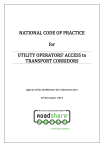 NATIONAL CODE OF PRACTICE for UTILITY OPERATORS’ ACCESS to TRANSPORT CORRIDORS Approved by theMinister for Infrastructure 10 November 2011 Contents Definitions v Abbreviations Used ...................................................................................................................................... xii 1. Introduction ........................................................................................................................................... 13 1.1 Scope .................................................................................................................................................................................... 13 1.2 Legal Framework ............................................................................................................................................................ 13 1.2.1 Legislative Scope of Code ............................................................................................................................... 13 1.2.2 Legislation Governing Railway Access ..................................................................................................... 14 1.3 Code Limitations ............................................................................................................................................................. 14 1.4 General Principles .......................................................................................................................................................... 16 1.5 Rights of Access to Transport Corridors .............................................................................................................. 16 2. General Requirements ........................................................................................................................ 17 2.1 Rules for Interpreting the Code ................................................................................................................................ 17 2.2 Role and Responsibilities ............................................................................................................................................ 18 2.2.1 All Parties .............................................................................................................................................................. 18 2.2.2 Road and Motorway Corridor Managers ................................................................................................ 18 2.2.3 Railway Corridor Manager ............................................................................................................................ 19 2.2.4 Utility Operator .................................................................................................................................................. 19 2.2.5 Compliance by Suppliers and Agents ....................................................................................................... 19 2.3 Legislative and Regulatory Duties........................................................................................................................... 20 2.4 Quality Management ..................................................................................................................................................... 20 2.4.1 Quality Plan .......................................................................................................................................................... 20 2.4.2 Audit Process ....................................................................................................................................................... 21 2.4.3 Use of Forms and Templates ........................................................................................................................ 21 2.5 Health and Safety ............................................................................................................................................................ 21 2.6 Conflicts of Interest ........................................................................................................................................................ 22 2.6.1 Deemed Conflict of Interest .......................................................................................................................... 22 2.6.2 Identification and Disclosure of Conflict of Interest .......................................................................... 22 2.6.3 A Conflicted Person’s obligations ............................................................................................................... 22 2.6.4 Disputes Relating to Conflicts of Interest ............................................................................................... 23 2.6.5 Guidance on Managing Conflicts of Interest .......................................................................................... 23 2.7 Coordination ..................................................................................................................................................................... 24 2.7.1 Sharing Planned Works Programmes ...................................................................................................... 24 2.7.2 Participation in Liaison Meetings ............................................................................................................... 24 2.8 Sharing Information ...................................................................................................................................................... 25 2.8.1 Maintaining and Providing Information on Utility Structures ...................................................... 25 2.8.2 Verifying Asset Information during Works............................................................................................ 26 2.8.3 Maintaining Information Confidentiality ......................................................................................