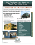 INC® Pre-Assembled Structures “Drop-In-Place” Noise Control Pre-Engineered ● Factory Finished ● High Performance ● Rugged Durability Take Advantage of These Benefits √ √ √ √ √ √ √ √ √ Demanding Design Possibilities Controlled Fit & Finish Details Shorter Overall Project Lead Times Minimal Site Down Time and Expense No Construction Mess or Disruption Crane or Fork Lift Portability Typical Applications Fixed Total Project Cost High Acoustical & Structural Performance Guaranteed Finished Results The design parameters of an INC pre-assembled structure is limited only by shipping and handling restrictions that may exist. Ideal applications include: • • • • • • • • • • • • • • • • • • Operator Control Rooms Pulpits Crane Cabs Quiet Rooms Security Rooms Genset Enclosures Test Chambers Factory Offices QC Rooms Construction Site Offices Speech Isolation Booths Outdoor Equipment Enclosures Broadcast / Communication Center Test Cells Military SCIF Mechanical / Electrical Equipment Housing Computer Rooms Power Plant Control Rooms …. and many more ® 401 Airport Road • North Aurora, IL 60542 800-954-1998 INC Bulletin # 003-1001 www.industrialnoisecontrol.com Let INC Design a System That Fits Your Needs and Budget INC pre-assembled structures offer a high performance, cost-effective alternative to field built designs based on either conventional construction materials or modular acoustical components. Our pre-assembled structures are the ideal solution for projects facing limited time, space or funding. By controlling every aspect of the design and assembly in our factory, we can guarantee levels of mechanical, structural and acoustical performance that are difficult to INC® Pre-Assembled Structures Construction Basics Our general construction method will depend largely upon the design and performance criteria specified for any given project. For medium duty industrial and commercial applications we will typically base the design around using our modular acoustical panel system called PanlWall® and incorporate unitized assembly methods and floors when required. This can be as simple as assembling a modular panel enclosure for example, on to a unitized base frame or floor with fork-lift capability. For more robust structures requiring greater portability, high acoustical performance and resistance to severe environments, we may begin with a complete, fully welded structural sub-frame upon which we will construct walls and ceiling with either preengineered modular components or built-up insulated construction with steel skins. Doors & Access Points Single and double leaf acoustical hinged doors as well as manual and automated sliding doors are available to provide personnel and parts entry and exit wherever needed. In addition we offer a full compliment of access plugs and removable panels for local access. Viewing Windows High performance double glazed window units are available in a wide range of sizes and glazing materials to suit the most critical requirements. Our windows can be sized and arranged to provide unlimited viewing access. Silenced Ventilation Fully silenced acoustically compatible ventilation systems are available to integrate with any Panl-Wall® structure. We offer a variety of ventilating fans and air conditioners along with acoustically and aerodynamically designed silencers, baffles and vent panels. Lighting & Electric For general lighting and convenience electrics we offer basic components for either surface or concealed mounting. Portability & Handling Our structures can be designed for handling by fork lifts or overhead cranes either lifting from either top or base mounted lifting points. Severe Service Option For use in extremely harsh environments such as steel mills, pulp & paper plants, mines, rolling mills, etc., INC has developed our Severe Service Option which includes cladding all exposed outside corners and edges with ⅜” thick structural angle, fully welded corners and joints, heavy lifting plates and brackets and heavily reinforced floors and bases. Heavy gauge exterior surfaces up to ¼” thick steel. Load Bearing Ceilings INC can provide a load bearing ceiling to allow storage or equipment placement on top of your pre-assembled structure or to allow for two-story stacking of structures. INC® Pre-Assembled Structures Construction Styles & Options To provide solutions for the widest variety of applications, INC Pre-Assembled Structures feature an array of related components providing high performance acoustical characteristics combined with rugged structural integrity and design flexibility. A range of basic panel constructions and joining methods are offered each providing a unique combination of acoustical and mechanical features to best meet your specific requirements. Design Choices INC offers these distinct construction designs to meet any application: H-Member Joint Tongue-and-Groove Plenum Style Outdoor Interlock Construction Options • Wall construction up to 8” thick” • Sound transmission loss ratings up to STC-52 and NRC=1.05 • Interior sound absorption ratings up to NRC=1.05 • Fully insulated and vibration isolated floors • Standard material is electro-galvanized steel, available in G90 galvanized steel, cold rolled steel, aluminum and stainless steel • Standard construction material gauges from 22 gauge to 18 gauge • Heavy duty construction material gauges up to ¼” steel plate • All panels meet ASTM E84 Class I fire rating … fire resistive panel construction available in 60 and 90 minute designs based on ASTM E119 criteria Performance Enhancements • RFI / EMI Shielding • X-ray Shielding • Ballistic Impact Resistance • Outdoor Weather Resistance Portability / Handling Options • Fork liftable from base using dedicated fork tubes • Crane liftable from base using fixed or detachable lifting brackets • Crane liftable from top using lift eye and plat