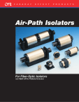 OFR F A R A D A Y E F F E C T P R O D U C T S Air-Path Isolators For Fiber-Optic Isolators see FIBER-OPTIC PRODUCTS Section Table of Contents CONTENTS OFR and Isolators Page IO-1 Laser Power Limitations Page IO-3 Narrowband Adjustable Isolators Page IO-6 Broadband Adjustable Isolators Page IO-6 Fixed Narrowband Isolators (Aspirin Tablet) Page IO-7 Fixed Broadband Isolators Page IO-8 244-505 nm Isolators Page IO-9 505-700 nm Isolators Page IO-10 700-925 nm Isolators Page IO-11 Fixed Broadband Isolators 748-851 Page IO-12 925-1100 nm Isolators Page IO-13 1260-1650 nm Isolators Page IO-14 1950-2200 nm Isolators Page IO-14 Polarization Independent Isolators Page IO-15 Polarization Rotators (1/2-Wave Retarders) Page IO-15 Isolators Body Dimensions Page IO-16 (nm) IO-(244-505) IO-(505-700) IO-(700-925) Page IO-9 IO-10 IO-11 IO-(925-1100) IO-(1260-1650) IO-(1950-2200) IO-13 IO-14 IO-14 OFR and Optical Isolators OFR has been in optical isolators from the beginning. In fact, OFR introduced the optical isolator to the world's photonics market. Having designed more than 100 models in response to customers' requirements since the early 1980s, OFR now produces more isolator models than any other manufacturer. Faraday Rotator crystal rods are optically ground and polished in the OFR optical shop using OFR-designed tooling. End faces of the rotator rods are ground and polished to <5 arc seconds parallel. Thus, end-face specifications are maintained under OFR control. This, along with internal inspection (for inclusions and strainbirefringence) of 100% of all Faraday Rotator crystal rods used, insures that all Isolators meet OFR's discriminating specifications. OFR manufactures Optical Isolators for virtually all lasers from 193 nm to 10.6 µm and beyond. Most models are available with low-power or high-power polarizers. All are permanent magnet, single-pass type Isolators. IO-1 Among the many "firsts" introduced by OFR: ❏ Wideband Tunable Isolator for Visible (1985) ❏ Wideband Tunable Isolator for Near-IR (1985) ❏ Tunable, Pigtailed Isolator (1986) ❏ “Aspirin Tablet" Micro Isolator (1988) ❏ CO₂ Laser Isolator (1991) ❏ Ti:Sapphire Isolator (1991) ❏ “Grain-of-Rice" Micro-Isolator (1991) ❏ HoYAG Isolator (1991) ❏ Near-UV Isolator (1991) ❏ 980 nm Isolator (1993) ❏ Mini-package VIS, NIR designs (1994) ❏ Utility Grade (economically-priced) designs (1995) ❏ Tunable IR designs (1995) ❏ Deep-UV Isolator (1996) ❏ Faraday Rotators using a Movable Optical Element US Patent 4,804,256 ❏ Optical Isolator employing a Ge-As-Se Composition US Patent 4,840,464 ❏ Magnetic Configuration for Faraday Rotators US Patent 4,856,878 ❏ Optical Isolators employing Oppositely Signed Materials US Patent 5,087,984 ❏ Optical Isolators employing Wavelength Tuning US Patent 5,111,330 ❏ Optical Circulator having Simplified Construction US Patent 5,212,586 ❏ Optical Isolator employing Cd-Zn-Te Composition US Patent 5,790,299 ❏ Devices for holding optical components fixed positions US Patent 6,061,190 Optics for Research: 973-228-4480 / FAX 973-228-0915 / www.ofr.com / info@ofr.com Function of an Isolator Purpose of an Isolator OFR isolators are used to reduce or eliminate the effects of optical feedback...reflections of the laser's own energy back into itself. The effects of optical feedback are well known: amplitude fluctuation, frequency shift, limitation of modulation bandwidth, noise and even damage. Much like a diode in an electrical circuit, the isolator transmits light in one direction only. An isolator consists of a Faraday rotator, two polarizers and a body to house the parts. The Faraday rotator consists of a magnetooptic material contained in a magnetic field. The Faraday Effect In 1842, Michael Faraday discovered that the plane of polarized light rotates while transmitting through glass (or other material) that is contained in a magnetic field. The direction of rotation is dependent on the direction of the magnetic field, and not on the direction of light propagation (non-reciprocal). The amount of rotation, , equals VLH, where V is the Verdet Constant, a property of the optical material, in minutes/Oersted-cm. L is the path length through the optical material in cm. H is the magnetic field strength in Oersted. rotator rod, designed to rotate the plane of polarization (POP) by 45°, say in the ccw sense. It then exits through the Output Polarizer whose axis is at 45°. The light leaves the Isolator, and reflections occur. This reflected light constitutes feedback. 0° H INPUT POLARIZER The Faraday Effect is non-reciprocal, meaning that the direction of rotation is independent of the direction of light propogation, and only dependent upon the direction of the magnetic field. 45° FARADAY ROTATOR 45° OUTPUT POLARIZER FORWARD MODE The reverse mode This feedback re-enters the Isolator, back through the Output Polarizer where it is repolarized at 45°. It then passes back through the rotator rod and is further rotated by another 45°, still in the ccw sense, making a total of 90° with respect to the Input Polarizer (0°). It is seen that the light is extinguished here. Thus, we have succeeded in isolating the laser from its own reflections. 0° 45° 90° INPUT POLARIZER X ➤ OPERATION OF AN ISOLATOR The forward mode Laser light, whether or not polarized, enters the Input Polarizer and becomes linearly polarized, say in the vertical plane (0°). It then enters the Faraday ➛ FARADAY ROTATOR 90° OUTPUT POLARIZER REVERSE MODE Horizontal or Vertical Polarization? Unless otherwise specified at time of order, OFR Isolators are set for horizontal input polarization. However, most models can be easily reset for vertical input merely by rotating each polarizer 90°. Whether horizontal or vertical input, the output plane of polarization will be at 45°, the specific quadrant depending upon the model. An alternate means of rotating the output is the Polarization Rotator (1/2-Wave Retarder