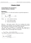 POWER SYSTEM ANALYSIS MISSAN UNIVERSITY\ COLLEGE OF ENGINEERING Chapter Eight Transmission Line parameters Resistance, Inductance , Capacitance Resistance :The resistance of a solid round conductor at specified temperature is given by :(36) Where is the conductor resistivity Is the conductor length Is the cross-section area When ac ( alter native current ) flow in an conductor the current distribution is not uniformly over the conductor cross-sectional area and the current density is greatest at the surface of the conductor. This causes the ac resistance to be somewhat high. Than the d.c resistance. This behavior is known as skin effect. At 60 HZ the a.c resistance is about 2 percent higher than dc resistance. *The conductor resistance increase as temper due increase. POWER SYSTEM ANALYSIS MISSAN UNIVERSITY\ COLLEGE OF ENGINEERING Where are conductor resistance at respectively. T is the temperature constant that depend on the conductor material . for example T for the aluminum is T=228. Inductance (L) Any conductor carrying a current will be surrounded by a magnetic field change with the change of the current. Where is the magnetic linkage flux and this will be change as the changing of the current ( and this lead to make the permeability constant for all flux level as in the air. Henery (H) (1) Where is the flux linkage of the conductor ( web.turn). I is the current flow in the conductor *In any conductor carrying a current there is :1- Internal flux This will be as a concentric circles inside the conductor and caused by the current that flow in the same conductor. 2- External flux This will be as a concentric circles outside or around the conductor and caused by the same current . POWER SYSTEM ANALYSIS MISSAN UNIVERSITY\ COLLEGE OF ENGINEERING Inductance of conductor to external flux :After the derivative of external linkage flux between The inductance between the Two point that location outside Or external the conductor. r X H/m Flux outside the conductor Due to the current I that Flow in the same conductor *Inductance between two single- phase conductor :- = D POWER SYSTEM ANALYSIS MISSAN UNIVERSITY\ COLLEGE OF ENGINEERING H/m where (3) And in the same manner H/m where (4) And the inductance of the Total system is And if Also we can write eq. (3) and (4) by this form (5) POWER SYSTEM ANALYSIS MISSAN UNIVERSITY\ COLLEGE OF ENGINEERING *Flux linkage in term of self and Mutual inductance As in eq. (1) (6) Where is the Total linkage flux in the conductor 1 is the Total linkage flux in the conductor 2 is the self inductance due to is the Mutual inductance due to is the mutual inductance due to is the self inductance due to Since (7) By comparing eq.(7) with eq. (5) } Self inductance } Mutual inductance (8) POWER SYSTEM ANALYSIS MISSAN UNIVERSITY\ COLLEGE OF ENGINEERING The concept of self and Mutual inductance can be extended to a group of n conductors. Consider n conductors carrying phase currents Such that (9) Generalizing eq. (6), the linkage of conductor are (10) And from eq. (8) (11) POWER SYSTEM ANALYSIS MISSAN UNIVERSITY\ COLLEGE OF ENGINEERING *Inductance of composite conductor :The current in each Su b conductor of Group A is b c a And the current in each Sub conductor of Group B is Due to eq. (11) and Its application d m n Conductor A Has acurrent +I (12) Conductor A Has acurrent -I +1n +1n The inductance of sub conductor a is (12) POWER SYSTEM ANALYSIS MISSAN UNIVERSITY\ COLLEGE OF ENGINEERING As so on The average conductor in any sub conductor in group A Since all the sub conductor of conductor A are electrically parallel, so that the inductance o A will be (13) (13) (14) (14) …( …( (15) (15) POWER SYSTEM ANALYSIS MISSAN UNIVERSITY\ COLLEGE OF ENGINEERING Where GMD is the Geometric mean Distance And it is equal for A and B GMR is the Geometric Mean radius And it is not equal for A and B in any time POWER SYSTEM ANALYSIS MISSAN UNIVERSITY\ COLLEGE OF ENGINEERING Ex1) A single phase has two group of conductor A and B where A consists of 3- wires (sub conductors) a ,b, c each of its have a radius of 0.25 cm ,and the group B consists of two wires d ,e each of its have a radius of 0.5cm. calculate the inductance of the Total system where the distance between the sub conductor is as follow :. So1) d 6 m b 6 m e c Group A Where =0.4 m Group B POWER SYSTEM ANALYSIS MISSAN UNIVERSITY\ COLLEGE OF ENGINEERING POWER SYSTEM ANALYSIS *Inductance of MISSAN UNIVERSITY\ COLLEGE OF ENGINEERING Transmission Line :- a- Symmetrical spacing :consider one meter length of line with three conductors, each with radius r , symmetrically spacing in a triangle (as example ) configuration as shown in the Fig. below Assume we have a balanced D D Current (16) D From eq. (11). The Total flux linkage of phase a is (17) (17) Since Since we have a symmetrical spacing H/m (18) (18) POWER SYSTEM ANALYSIS MISSAN UNIVERSITY\ COLLEGE OF ENGINEERING b) A symmetrical spacing :with a symmetrical spacing even with balance currents, the voltage drop due to line inductance with be unbalanced, because the inductance of each phase will be not equal. Consider one meter length of of line with three conductor each of radius r as shown in the fig. below . The application of eq. (11) 1 2 3 POWER SYSTEM ANALYSIS MISSAN UNIVERSITY\ COLLEGE OF ENGINEERING since we have a balance system If we have the parameter a Which is 120 120 120 The equations of inductance a symmetrical spacing as in the Fig above are :- POWER SYSTEM ANALYSIS MISSAN UNIVERSITY\ COLLEGE OF ENGINEERING (18) *Transpose System :One way to solve the problem of a symmetrical spacing and the different inductance for each phase is :Transpose system which it is :Interchanging the phase configuration every one – third the length so that each conductor is moved to occupy the next physical in regular sequence. And by this method the inductance for each phase will be equal. Such a transposition arrangement is shown in the Fig. below :a a c b b a c 3 c -1First Transpose