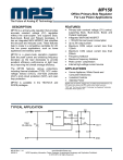 MP150 Offline Primary-Side Regulator For Low Power Applications The Future of Analog IC Technology DESCRIPTION MP150 is a primary-side regulator that provides accurate constant voltage (CV) regulation without the opto-coupler, and supports Buck, Buck-boost, Boost and Flyback topologies. It has an integrated 500V MOSFET that simplifies the structure and reduces costs. These features help to make it a competitive candidate for offline low power applications, such as home appliances and standby power. MP150 is a green-mode operation regulator. Both the peak current and switching frequency decrease as the load decreases to provide excellent efficiency performance at light load, thus improving the overall average efficiency. The MP150 features various protections, including thermal shutdown (TSD), VCC undervoltage lockout (UVLO), over-load protection (OLP), short-circuit protection (SCP), and open loop protection. MP150 is available in the TSOT23-5 and SOIC8 packages. FEATURES • • • • • • • • • • Primary-side constant voltage (CV) control, supporting Buck, Buck-boost, Boost and Flyback topologies Integrated 500V/30Ω MOSFET < 150mW No-load power consumption Up to 2W output power Maximum DCM output current less than 120mA Maximum CCM output current less than 200mA Frequency foldback Maximum frequency limitation Peak current compression Internal high-voltage current source APPLICATIONS • • • Home Appliance, White Goods and Consumer Electronics Industrial Controls Standby Power All MPS parts are lead-free, halogen free, and adhere to the RoHS directive. For MPS green status, please visit MPS website under Quality Assurance. “MPS” and “The Future of Analog IC Technology” are Registered Trademarks of Monolithic Power Systems, Inc. TYPICAL APPLICATION MP150 Rev. 1.14 5/6/2015 www.MonolithicPower.com MPS Proprietary Information. Patent Protected. Unauthorized Photocopy and Duplication Prohibited. © 2015 MPS. All Rights Reserved. 1 MP150 – OFFLINE PRIMARY-SIDE REGULATOR ORDERING INFORMATION Part Number* Package Top Marking MP150GJ MP150GS TSOT23-5 SOIC8 ADG MP150 * For Tape & Reel, add suffix –Z (e.g. MP150GJ–Z); * For Tape & Reel, add suffix –Z (e.g. MP150GS–Z); PACKAGE REFERENCE TOP VIEW VCC 1 FB 2 SOURCE 3 TOP VIEW 5 4 DRAIN SOURCE TSOT23-5 VCC 1 8 N/C FB 2 7 DRAIN SOURCE 3 6 N/C SOURCE 4 5 N/C SOIC8 ABSOLUTE MAXIMUM RATINGS (1) Thermal Resistance Drain to SOURCE ........................ -0.7V to 500V All Other Pins ................................ -0.7V to 6.5V (2) Continuous Power Dissipation (TA = +25°C) TSOT23-5 .....................................................1W SOIC8...........................................................1W Junction Temperature .............................. 150°C Lead Temperature ................................... 260°C Storage Temperature ............... -60°C to +150°C ESD Capability Human Body Mode .......... 4.0kV ESD Capability Machine Mode ..................200V TSOT23-5 ............................. 100 ..... 55 ... °C/W SOIC8 .................................... 96 ...... 45 ... °C/W Recommended Operating Conditions (3) Operating Junction Temp. (TJ) . -40°C to +125°C Operating VCC range .................... 5.3V to 5.6V MP150 Rev. 1.14 5/6/2015 (4) θJA θJC Notes: 1) Exceeding these ratings may damage the device. 2) The maximum allowable power dissipation is a function of the maximum junction temperature TJ(MAX), the junction-toambient thermal resistance θJA, and the ambient temperature TA. The maximum allowance continuous power dissipation at any ambient temperature is calculated by PD(MAX)=(TJ(MAX)-TA)/θJA. Exceeding the maximum allowance power dissipation will cause excessive die temperature, and the regulator will go into thermal shutdown. Internal thermal shutdown circuit protects the device from permanent damage. 3) The device is not guaranteed to function outside of its operating conditions. 4) Measured on JESD51-7, 4-layer PCB. www.MonolithicPower.com MPS Proprietary Information. Patent Protected. Unauthorized Photocopy and Duplication Prohibited. © 2015 MPS. All Rights Reserved. 2 MP150 – OFFLINE PRIMARY-SIDE REGULATOR ELECTRICAL CHARACTERISTICS VCC = 5.8V, TA = 25°C, unless otherwise noted. Parameter Symbol Condition Min Typ Max Units VCC=4V;VDrain=100V VCC=5.8V;VDarin=400V 2.5 3.5 10 4.5 12 mA μA Start-up Current Source (Drain Pin) Internal regulator supply current Drain pin leakage current Iregulator ILeak Breakdown voltage V(BR)DSS Supply Voltage Management (VCC Pin) VCC level (increasing) where the internal regulator stops VCC level (decreasing) where the internal regulator turns on VCC regulator on and off hysteresis VCC level (decreasing) where the IC stops working VCC level (decreasing) where the protection phase ends Internal IC consumption Internal IC consumption (no switching) Internal IC Consumption, Latch off Phase Internal MOSFET (Drain Pin) Breakdown voltage ON resistance 500 V VCCOFF 5.4 5.6 5.8 V VCCON 5.1 5.3 5.6 V 250 mV VCCstop 3.4 V VCCpro 2.4 V ICC VCC=5.8V, D= 40% fs=37kHz, ICC ICCLATCH VCC=5.3V VBRDSS 430 μA 300 μA 16 μA 500 Ron V 30 Ω Internal Current Sense Peak current limit ILimit 260 290 345 mA Leading-edge blanking τLEB1 350 ns SCP point ISCP 450 mA Leading-edge blanking for SCP τLEB2 180 ns Feedback input (FB Pin) Minimum off time Primary MOSFET feedback turn-on threshold OLP feedback trigger threshold τminoff 15 18 21 μs VFB 2.45 2.55 2.65 V VFB OLP OLP delay time τOLP Open-loop detection Thermal Shutdown VOLD Thermal shutdown threshold MP150 Rev. 1.14 5/6/2015 fs=37kHz 1.7 V 170 ms 60 mV 150 ºC www.MonolithicPower.com MPS Proprietary Information. Patent Protected. Unauthorized Photocopy and Duplication Prohibited. © 2015 MPS. All Rights Reserved. 3 MP150 – OFFLINE PRIMARY-SIDE REGULATOR TYPICAL CHARACTERISTICS Breakdown Voltage vs. Junction Temperature 640 620 2 On-State Resistance vs. Junction Temperature Feedback Voltage vs. Junction Temperat