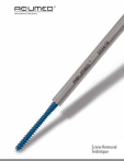 Innovative Solutions Screw Removal Technique Screw Removal Introduction Acumed® is an industry leader in innovations for extremities and trauma. We are dedicated to pioneering solutions that benefit the patient and drive the industry forward. CONTENTS Screw Removal Introduction Features and Benefits Screw Removal Usage Chart Acutrak® Screw Removal Technique Plate Screw Removal Surgical Technique Acutrak® Screw Removal Ordering Information Plate Screw Removal Ordering Information 2 3 4 5-6 8-9 10 11 The Acumed® Screw Removal system allows you to remove any Acumed® bone Plate or Acutrak® Headless Compression Screw with ease. The system is a complement to our innovative Acumed® bone plates and Acutrak® Headless Compression Screws. Each component of the extensive system is designed specifically for our bone plates and Acutrak® Screws, with customized geometry to exactly match our products. The versatility of the system allows you to use the instrumentation in any screw removal situation you are presented with in the operating room. The Acumed® Screw Removal system is part of our ongoing commitment to support all your orthopaedic cases, whether it’s insertion or removal. Solid Hex Driver Easyout Left-Handed Drills • Designed with stronger material for reduced stripping • Cutting flutes to grasp stripped hex • Tip specifically designed for drilling titanium implants • Cannulation removed to increase strength 2 • Ideal geometry for screw removal Features and Benefits Customized for Optimal Performance The distinct geometry of Acumed® Screw system is tailored to match our product line to enable efficient removal in any situation. Ease of Use All of our removal instrumentation is easy to assemble and use. AO quick releases are provided on all instrumentation to help shorten the case. Trephine Screw Removal Tip Impact Driver • Thin wall to remove less bone • Force fit on threads to lock the screw • For use with Acutrak® Plus, Acutrak® 6/7 and Acutrak 2® - 5.5 Headless Compression Screws • Tapered interior to encapsulate proximal portion of screw 3 Screw Removal Tool Usage Chart 80-0404 (4.0 mm) 80-0403 (3.5 mm) 80-0402 (3.0 mm) 80-0401 (2.5 mm) 80-0400 (2.0 mm) 80-0399 (1.5 mm) 80-0604 (4.0 mm) 80-0602 (3.5 mm) 80-0601 (3.0 mm) Left-Handed Drills 80-0600 (2.5 mm) 80-0599 (2.0 mm) 80-0598 (1.5 mm) 80-0636 (Cruciform) 80-0635 (4.0 mm) 80-0634 (3.5 mm) 80-0633 (3.0 mm) Easyouts HPC0025 (2.5 mm) 80-0632 (2.0 mm) Screw 80-0583 (1.5 mm) Solid Drivers Acutrak® Mini Acutrak® Standard< 20 mm Acutrak® Standard > 20 mm Acutrak® 4/5 Acutrak® Plus Acutrak® 6/7 Acutrak 2® Micro Acutrak 2® Mini Acutrak 2® Standard Acutrak 2® - 5.5 2.3 CO Screws 2.7 CO, COL andTap-Loc® Screws 3.5 CO, COL andTap-Loc® Screws Cruciform Screws Acutrak® Mini Acutrak® Standard< 20 mm Acutrak® Standard > 20 mm Acutrak® 4/5 Acutrak® Plus Acutrak® 6/7 Acutrak 2® Micro Acutrak 2® Mini Acutrak 2® Standard Acutrak 2® 5.5 2.3 CO Screws 2.7 CO, COL andTap-Loc® Screws 3.5 CO, COL andTap-Loc® Screws Cruciform Screws 4 80-0606 (4.0 mm) 80-0605 (3.0 mm) 80-0616 80-0615 Impact Drivers 80-0614 80-0613 80-0612 80-0217 80-0216 80-0214 80-0213 80-0212 80-0211 80-0210 80-0209 80-0208 Removal Tips 80-0207 80-0206 Screws 80-0205 Trephines Acutrak Screw Removal Steps Screw is not broken Solid Drivers Easyouts Trephines Removal Tips Impact Drivers 3.0 and 4.0 Hex sizes only Solid Drivers Easyouts Trephines Removal Tips Impact Drivers 3.0 and 4.0 Hex sizes only Hex is stripped Screw is broken Proximal Distal Left-Handed Drills 5 Acutrak® Screw Removal Technique The Acumed® Screw Removal system is designed for easy and efficient screw removal. The following pages detail proper removal techniques, including simple tips and guidelines for removing screws when there is resistance or other difficulties. 1 2 3 Using the Driver • Clean out the hex in the screw. • Using the solid hex driver, try to remove the screw. It may help to advance the screw approximately a quarter turn to break the bond between the titanium and the bone. • Turn the driver slowly and firmly making sure to keep the driver in line with the screw. • If there is resistance or a risk of breakage, proceed to the next step. Using the Easyouts • Make sure the hex is clear. • The easyouts should be turned by hand. • Turn the easyout counter-clockwise with firm constant pressure in line with the screw. It may help to offset the easyout by a couple of degrees so it wedges into the head of the screw. • If the easyout is spinning, tap it with a mallet to move it further inside the hex. • If the easyout doesn’t engage the hex or strips the hex, proceed to the next step. Using the Trephines • The trephines are designed for specific screws and for coring small amounts of bone away from the screw while internally engaging on the threads of the screw. • The trephines need to be used under power, at low rpm’s, high pressure and in reverse. • A guide wire may be used to help line up the trephine, which is cannulated, but it is not required. • If using a guide wire, insert the guide wire into the screw’s cannulation and then place the trephine over the guide wire and push down until it contacts the bone around the screw. • If not using a guide wire just place the trephine over the end of the screw. • If the trephine engages the screw, the screw will start to back out of the hole. Keep rotating until the screw is completely out of the hole. If the trephine doesn’t engage the screw, stop and proceed to the next step. The removal tip is designed to fit in the core created by the trephine. 6 Acutrak® Screw Removal Technique 4 Using the Removal Tip • Thread the removal tip on the end of the supplied quick release shaft and place over the screw. • The screw removal tip should be used by hand. • Firmly tap the tip onto the end of the screw. • A mallet may be used to make sure the tip is firmly attached to the screw
