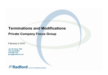 Terminations and Modifications Private Company Focus Group February 9, 2010 Jon W. Burg, FSA Vice President 415.486.7137 jburg@radford.com Types of Modifications A modification is a change in any of the terms or conditions of an award, including: > Acceleration of vesting > Extension of post-vesting exercise term > Reclassification of an award (from equity to a liability or vice versa) > Re-pricings or exchange program > A modification in connection with an equity restructuring (e.g., spin-off or stock split) > Exchange of awards in a business combination > A modification to add an anti-dilution provision in anticipation of an equity restructuring First three are fairly common with private companies 1 Accounting for Modifications under Topic 718: General Principle A modification of the terms or conditions of an equity award shall be treated as an exchange of the original award for a new award Two-step process to account for the modification of an equity-classified award: 1. Reassess probability of vesting immediately before and immediately after the modification 2. Calculate the difference between the fair value immediately before and immediately after the modification (incremental fair value) 2 Identifying the Type of Modification > For awards with service and/or performance conditions, assessment of the probability of vesting results in one of four types of modifications - Type I: Probable-to-Probable - Type II: Probable-to-Improbable - Type III: Improbable-to-Probable - Type IV: Improbable-to-Improbable Before ↓ Probable After → Improbable Modification Probable Improbable Type I: Probable to Probable Type II: Probable to Improbable Example 13(a) Example 13(b) Expense = at least equal the fair value of the award at the [original] grant date Expense = at least equal the fair value of the award at the [original] grant date + Incremental Expense, if any + Incremental Expense, if any Type III: Improbable to Probable Type IV: Improbable to Improbable Example 13(c) & (e) Example 13(d) Fair value of new grant only Fair value of new grant only 3 Type I: Probable to Probable > Modification does not affect the probability of vesting > Accounting for a Type I modification: > - Recognize original grant-date fair value plus incremental fair value (if any) - Recognize compensation cost immediately if vested, or over remaining requisite service period if unvested - Original grant-date fair value represents the “floor” for the amount of compensation cost to be recognized if either the original or modified vesting conditions are satisfied Example: - On January 1, 20X6, a company grants 1,000 restricted stock units with a grant-date fair value of $10 - The awards vest only if cumulative net income over the succeeding four year period is greater than $10 million - On January 1, 20X9, the company believes it is probable the original performance target will be achieved - On January 1, 20X9, the company modifies the award to change the performance target to an EBITDA target - After the modification, the company continues to believe the performance target is probable of being achieved - The fair value of the award before and after the modification is the same (the type of performance target does not impact fair value) 4 Type I: Probable to Probable (continued) > Example (continued): - How much total compensation cost should the company record over the service period, if the modified performance target is achieved? > If the modified performance target is achieved, the company would record compensation cost ($10,000) based on the number of awards that vest (1,000) and the grant-date fair value ($10), since there is no incremental fair value conveyed as a result of the modification - If the original performance target is achieved? > If the original performance target is achieved, the company would record compensation cost of $10,000 calculated based on the grant-date fair value even if the modified performance target is not achieved (the “floor” requirement) - If neither of the targets are achieved? > If neither the modified or the original performance target is achieved, the company will record no cumulative compensation cost for this award 5 Type II: Probable to Improbable > Modification negatively affects the probability of vesting - > Accounting for a Type II modification: - > Not expected to be common because the employee is expected to vest under the original conditions, but not the modified conditions Same as Type I, except no incremental compensation cost would be recognized until vesting is probable Example: - Same as before except the modified EBITDA target is not expected to vest - No additional expense is recognized after the modification, but the company continues to recognize the original grant date expense since the company continues to believe the original performance target is probable of being achieved - The fair value of the award before and after the modification is the same (the type of performance target does not impact fair value) 6 Type III: Improbable to Probable > Award is not probable of vesting prior to the modification, but is probable of vesting under the modified conditions > Accounting for a Type III modification: > - Recognize fair value of modified award only - Any compensation cost recognized for original award is reversed (vesting is not probable at modification date) - Recognize compensation cost immediately if vested, or over remaining requisite service period if unvested - No “floor” for original grant-date fair value; only fair value of modified award is recognized Example: - On January 1, 20X6, a company grants 1,000 “at-the-money” employee share options, each with a grant-date fair value of $10 - The awards vest only if cumulative net income over the succeeding four year period is greater than $50 million - On December 31, 20X8 based on the financial performance of the company over the preceding three years, the company does not believe the awards ar