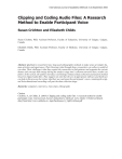 International Journal of Qualitative Methods 4 (3) September 2005 Clipping and Coding Audio Files: A Research Method to Enable Participant Voice Susan Crichton and Elizabeth Childs Susan Crichton, PhD, Assistant Professor, Faculty of Education, University of Calgary, Calgary, Canada Elizabeth Childs, PhD, Assistant Professor, Faculty of Medicine, University of Calgary, Calgary, Canada Abstract: Qualitative researchers have long used ethnographic methods to make sense of complex human activities and experiences. Their blessing is that through them, researchers can collect a wealth of raw data. Their challenge is that they require the researcher to find patterns and organize the various themes and concepts that emerge during the analysis stage into a coherent narrative that a reader can follow. In this article, the authors introduce a technology-enhanced data collection and analysis method based on clipped audio files. They suggest not only that the use of appropriate software and hardware can help in this process but, in fact, that their use can honor the participants’ voices, retaining the original three-dimensional recording well past the data collection stage. Keywords: computers, interviews, transcripts, ethnography Citation Crichton, S., & Childs, E. (2005). Clipping and coding audio files: A research method to enable participant voice. International Journal of Qualitative Methods, 4(3), Article 3. Retrieved [insert date] from http://www.ualberta.ca/~iiqm/backissues/4_3/pdf/crichton.pdf 2 Crichton, Childs CLIPPING AND CODING AUDIO FILES Introduction Qualitative researchers have been attempting to make sense of the world around them since armchair anthropologists and sociologists1 left the confines of their familiar environments and ventured into the field (Crichton, 1997). In this article, we suggest that today, little has changed in terms of the intent of that work; however, the tools and methods used have evolved in such a way that the voice of the participants under study has the potential to be stronger and more authentic when digital audio recordings are clipped and coded, as discussed in this article, rather than directly transcribed. Researchers (Crichton & Kinash, 2003) have suggested, “Ethnography is a qualitative field of research intended to construct in-depth depictions of the every day life events of people through active researcher participation and engagement” (p. 102). One of the challenges in this type of work is the sheer quantity of data captured and the need to develop an elastic yet rigorous structure in which to organize and analyze it. This structure allows the researcher to share findings, typically presented in a narrative form, in such a way that a reader, without the same firsthand experiences, can make personal sense from the rich description. It is this narrative that “allow[s] readers to understand fully the research setting and the thoughts of the people represented . . . [stopping] short, however, of becoming trivial and mundane” (Genzuk, 2004, p. 10). A further challenge for the researcher is determining a balance between the essential description required to set the context and the critical analysis and interpretation that is necessary to help the reader come to an understanding of the findings. When that balance is achieved, the reader is able to interpret and understand the work and make relevant links that might extend the work and generalize the findings. However, as Genzuk (2004) has cautioned, “Endless description becomes its own muddle. [The] . . . purpose of analysis is to organize the description in a way that makes it manageable” (p. 10). Typically, research findings that have been reached using qualitative methods will include thick descriptions of the experiences, contexts, and general environment of the site, individuals, and/or phenomenon under study. These descriptions are critical for the reader to understand the details of what has happened and the various viewpoints of the participants. They help to create a holistic picture, so that the findings do not lose their credibility and impact. Traditionally, these findings have been reached through the analysis of transcribed data or using qualitative analysis software such as NUD*IST. Our purpose in this article is to offer an alternative method for collecting and analyzing qualitative data: digital audio files. Ethnography as process Hammersley (1990) explained ethnography as social research that involves the study of people within their everyday situations rather than in experimental conditions. It is an attempt to collect data from a range of sources, including formal and informal conversations and observations as well as tangible and intangible artifacts. Although it might appear that the approach to the data collection is unstructured and at times chaotic and eclectic, it does not suggest that the collection of data has not been considered and planned. Ethnography simply encourages the ongoing collection of raw data from the widest and richest range of possible sources, continuing the collection until the field is either saturated or the data become repetitive. Merriam (1998) has suggested that the “emergence of regularities” serves as the indicator that a sufficient amount of data had been collected, noting further that “data collection in a case study is a recursive, interactive process in which engaging in one strategy incorporates or may lead to subsequent sources of data.” (p. 134) Put simply, ethnography is consistent with the way in which many of us make sense of events in our daily lives. Ethnography “literally means a portrait of a people . . . [as it is] a written description of a particular culture—the customs, beliefs, and behavior—based on information collected through fieldwork” (Harris & Johnson, 2000). Typically, data are collected from structured or semistructured interviews, formal and informal observation, and the analysis of various 