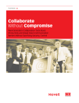 Playbook > Collaborate Without Compromise Next-Generation Collaboration Tools Boost Productivity and Break Down Communication Barriers Without Sacrificing Security, Control 2 playbook > Collaborate Without Compromise There’s no question that in today’s competitive marketplace, boosting employee productivity is a top priority for company executives. Technology leaders are no exception; they must constantly be on the lookout for innovative productivity tools and services to keep their companies one step ahead of the competition. In fact, according to The 2011 State of the CIO Survey conducted by CIO magazine, improving end-user productivity ranked as the top-expected accomplishment for IT in 2011, with 67 percent listing it as No. 1. @ There are today 2.9 billion active email accounts, and by 2014, that figure is predicted to reach 3.8 billion. “While last year’s [survey] data pointed to an increased emphasis on the external and commercial aspects of the business, perhaps fueled at least in part by the economic recession, 2011 survey results suggest that many CIOs are now focused on executing strategic and transformational IT initiatives that were on hold during the downturn,” reads the CIO magazine report, which surveyed 729 heads of IT. Executing a strategic IT initiative to improve end-user productivity requires a well thought-out plan that doesn’t stop at the boundaries of the corporate campus. As the economy improves and companies are looking to build customer bases in international markets, their employees must be able to communicate with far-flung co-workers and partners as if they sat in the next cubicle. Again CIOs are called upon to find the right technology to aid corporate expansion and allow employees to collaborate as easily as they could in person, but without the travel expenses. Technology leaders are aware of the strategic role their departments must play in keeping employees connected with one another and with corporate partners regardless of location. The 2011 CIO magazine survey indicated that 22 percent of respondents listed supporting global expansion as the most significant business accomplishment they expect to achieve in 2011. However, productivity-boosting technology initiatives can only succeed if end users embrace the tools that are available to them. It stands to reason that the tools poised to have the most success in empowering employees are based on products that users already use and rely upon to communicate with each other, such as email. These platforms already play a prominent role in helping employees share ideas and track interaction. The Continuing Role of Email Consider the following facts: Today there are 2.9 billion active email accounts, and by 2014, that figure is predicted to reach 3.8 billion, according to The Radicati Group. Most major Web sites require email addresses to sign on (Facebook), execute transactions (Amazon), and perform other tasks, rendering email an essential form of identifying individuals in the modern world. Despite the recent rise of social media, Americans still spend significantly more time using email (39%) than these newer forms of communication (11%), according to a September 2010 study published by market research firm The Nielsen Company. And, even though other forms of communication such as text messaging and social-networking posts may be more growing in popularity, email is still the most accepted and widely used form of electronic communications for professional users, with corporate email addresses serving as universal business cards. Leveraging existing email platforms to build productivity strategies also helps employees transition smoothly to next-generation technology—without sacrificing productivity or compromising adoption success. Such an approach offers flexibility and choice; email platforms with integrated social collaboration tools allow employees to choose which tool suits them or the situation best. 3 playbook > Collaborate Without Compromise For example, some employees may be more comfortable using email clients than social tools, but need to be able to interact without penalty with employees that live in their next-generation collaboration platforms. Email platforms that integrate features from the social networking world, such as the ability to synch email contacts with next-generation tools, will help an organization’s employees who might be resistant to new technology move more easily to new platforms. “A company may have some people who still like to use their email clients and will continue to do so for several more years,” says Wendy Steinle, Director of Product Marketing at Novell. “If the email client integrates so well with next-generation social tools that they are seamlessly sending messages back and forth, then it doesn’t matter which tool they use.” The Evolution of Email @ Despite the recent rise of social media, Americans still spend significantly more time using email (39%) than these newer forms of communication (11%). Not only must productivity-boosting technologies be familiar to users in order to be accepted, but they must also serve as a bridge to the future by embracing the latest work models. Today, users find themselves collaborating on projects with team members who might be working on the road or from home and need to be able to communicate effortlessly, in real time, to reach their goals and meet their deadlines. And many people have become accustomed to using social networking tools in their personal lives, be it to share photos, update their status, post commentary, or connect with friends. These users want to apply many of the same tools in the workplace to boost their productivity and lead them to greater levels of success. Next-generation social collaboration platforms are boosting both individual and team productivity by combining new social-networking features and reliable email communication to allow employees to share ideas, get questi