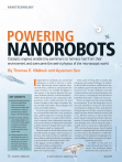 nanotechnology powering NANOROBOTS Catalytic engines enable tiny swimmers to harness fuel from their environment and overcome the weird physics of the microscopic world I Key Concepts ■■ ■■ ■■ Nanotechnology promises futuristic applications such as microscopic robots that assemble other machines or travel inside the body to deliver drugs or do microsurgery. These machines will face some unique physics. At small scales, fluids appear as viscous as molasses, and Brownian motion makes everything incessantly shake. Taking inspiration from the biological motors of living cells, chemists are learning how to power microsize and nanosize machines with catalytic reactions. —The Editors 72 S c i e n t i f i c A m e r i c a n magine that we could make cars, aircraft and submarines as small as bacteria or molecules. Microscopic robotic surgeons, injected in the body, could locate and neutralize the causes of disease — for example, the plaque inside arteries or the protein deposits that may cause Alzheimer’s disease. And nanomachines— robots having features and components at the nanometer scale — could penetrate the steel beams of bridges or the wings of airplanes, fixing invisible cracks before they propagate and cause catastrophic failures. In recent years chemists have created an array of remarkable molecular-scale structures that could become parts of minute machines. James Tour and his co-workers at Rice University, for instance, have synthesized a molecularscale car that features as wheels four buckyballs (carbon molecules shaped like soccer balls), 5,000 times as small as a human cell. But look under the hood of the nanocar, and you will not find an engine. Tour’s nanocars so far move only insofar as they are jostled by random collisions with the molecules around them, a process known as Brownian motion. This is the biggest current problem with molecular machines: we know how to build them, but we still do not know how to power them. At the scales of living cells or smaller, that task poses some unique challenges. Air and water feel as thick as molasses, and Brownian motion militates against forcing molecules to move in precise ways. In such conditions, nanoscale versions of motors such as those that power cars or hair dryers — assuming that we knew how to build them that small— could never even start. Nature, in contrast, provides many examples of nanomotors. To see the things they can do, one need only look at a living cell. The cell uses nanoengines to change its shape, push apart its chromosomes as it divides, construct proteins, engulf nutrients, shuttle chemicals around, and so on. All these motors, as well as those that power muscle contractions and the corkscrew motion of bacterial flagella, are based on the same principle: they convert chemical energy— usually stored as adenosine triphosphate, or ATP— into mechanical energy. And all exploit catalysts, compounds able to facilitate chemical reactions such as the breakdown of ATP. Researchers are now making exciting progress toward building arti­ficial nanomotors by applying similar principles. In 2004 we were part of a team at Pennsylvania State University that developed simple nanomotors that catalytically con- © 20 09 SCIENTIFIC AMERIC AN, INC. May 2009 Kenn Brown Mondolithic Studios (microscopic robots) By Thomas E. Mallouk and Ayusman Sen vert the energy stored in fuel molecules into motion. We took inspiration from a considerably larger catalytic motor reported in 2002 by Rustem Ismagilov and George Whitesides, both at Harvard University. The Harvard team had found that centimeter-scale “boats” with catalytic platinum strips on their stern would spontaneously move on the surface of a tank of water and hydrogen peroxide (H 2O2). The platinum promoted the breakup of H 2 O2 into oxygen and water, and bubbles of oxygen formed that seemed to push the boats ahead by recoil, the way the exhaust coming out the back of a rocket gives it forward thrust. Credible Shrinking Our miniaturized version of the Harvard engine was a gold-platinum rod about as long as a bacterial cell (two microns) and half as wide (350 nanometers). Our rods were mixed into the solution, rather than floating on the surface. Like the ATP-powered molecular motors inside the cell, these tiny catalytic cylinders were essentially immersed in their own fuel. And they did indeed move autonomously, at speeds of tens of microns per second, bearing an eerie resemblance under the microscope to live swimming bacteria [see video at www.SciAm.com/nanomotor]. As often happens in science, however, the hyw w w. S c i A m . c o m pothesis that led to the experiment was wrong. We had imagined our nanorods spewing tiny bubbles off their back and being pushed along by recoil. But what they actually do is more interesting, because it reminds nanotechnologists that we must think very differently about motion on small length scales. At the macroscale, the notion of recoil makes good sense. When someone swims or rows a boat, their arms, legs or oars push water backward, and the recoil force pushes the body or boat forward. In this way, a swimmer or boat can glide forward even after one stops pushing. How far an object glides is determined by the viscous force, or drag, and by the inertia, a body’s resistance to changes in its velocity. The drag is proportional to the object’s width, whereas the inertia is proportional to the object’s mass, which in turn is proportional to the width to the third power. For smaller objects, inertia scales down much faster than drag, becoming negligible, so that drag wins out. On the micron scale, any gliding ends in about one microsecond, and the glide distance is less than one 100th of a nanometer. Hence, for a micronsize body in water, swimming is a bit like wading through honey. A nanomotor has no memory of anything that pushed on it— no inertia— and inertial propulsion schemes (such as drifting © 20 09 SCIENT