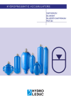 HY DRO PN EU M AT IC A CCUMULATORS DIAPHRAGM BLADDER BLADDER-DIAPHRAGM PISTON 2 Contents Operating principle, functions and characteristics. 4 ACS(L) Welded accumulators. . . . . . . . . . . . . . . . . . . 6 Technical description. . . . . . . . . . . . . . . . . . . . . . . . . . . . . . . . . . . . 6 Dimensions and characteristics. . . . . . . . . . . . . . . . . . . . . . . . . . . . 7 Order code system . . . . . . . . . . . . . . . . . . . . . . . . . . . . . . . . . . . . . 8 Hydraulic and gas connections. . . . . . . . . . . . . . . . . . . . . . . . . . . . 9 ACS(L) low temperature version. . . . . . . . . . . . . . . . . . . . . . . . . . 10 Accessories. . . . . . . . . . . . . . . . . . . . . . . . . . . . . . . . . . . . . . . . . . 11 HYDROPNEUMATIC ACCUMULATORS BLADDER, DIAPHRAGM BLADDER-DIAPHRAGM, PISTON AS Spherical accumulators . . . . . . . . . . . . . . . . . . . . 12 Technical description. . . . . . . . . . . . . . . . . . . . . . . . . . . . . . . . . . . 12 Characteristics, dimensions and accessories. . . . . . . . . . . . . . . . 13 ABVE Bladder accumulators. . . . . . . . . . . . . . . . . . . 14 Technical description. . . . . . . . . . . . . . . . . . . . . . . . . . . . . . . . . . . 14 Characteristics, dimensions and accessories. . . . . . . . . . . . . . . . 15 APL Piston accumulators . . . . . . . . . . . . . . . . . . . . . . 16 Technical description. . . . . . . . . . . . . . . . . . . . . . . . . . . . . . . . . . . Characteristics, dimensions and accessories. . . . . . . . . . . . . . . . Order code system . . . . . . . . . . . . . . . . . . . . . . . . . . . . . . . . . . . . Hydraulic and gas connections. . . . . . . . . . . . . . . . . . . . . . . . . . . Accessoires. . . . . . . . . . . . . . . . . . . . . . . . . . . . . . . . . . . . . . . . . . 16 17 18 19 19 Safety blocks . . . . . . . . . . . . . . . . . . . . . . . . . . . . . . . . . . . . . 20 Pressure relief valves. . . . . . . . . . . . . . . . . . . . . . . . . . . . . 22 Charging equipment. . . . . . . . . . . . . . . . . . . . . . . . . . . . . . 24 Safety precautions & maintenance recommendations.25 The complete LEDUC product range. . . . . . . . . . . . . . 26 AS ▪ Nitrogen capacities from 0.02 to 10 litres ▪ Maximum pressure 400 bar depending on model ▪ Extreme operating temperatures (standard): -20°C to +100°C ▪ Low temperature version: -40°C to +100°C ABVE ▪ Nitrogen capacities from 4 to 50 litres ▪ Maximum pressure 330 bar ▪ Extreme operating temperatures: -20°C to +80°C APL ▪ Nitrogen capacities from 0.5 to 4 litres ▪ Maximum pressure 250 bar ▪ Extreme operating temperatures: -20°C to +80°C ACS(L) series AS series ▪ Nitrogen capacities from 0.7 to 4 litres ▪ Maximum pressure 330 bar depending on model ▪ Extreme operating temperatures (standard): -20°C to +100°C ▪ Low temperature version: -40°C to +100°C ABVE series ACS(L) 3 APL series The LEDUC hydropneumatic accumulators range 4 Operating principle, functions and characteristics OPERATING PRINCIPLE ► A simple principle ► Energy storage If the very low compressibility of fluids makes it difficult to store their energy in small volumes, it does, however, enable them to transfer a significant force. Gas on the other hand is highly compressible, and can therefore store considerable amounts of energy in small volumes. The hydropneumatic accumulator makes use of these two properties. A hydro-pneumatic accumulator is a vessel which, in hydraulic circuits, is capable of storing a large amount of energy in a small volume. The hydropneumatic accumulator is a tank divided into two chambers by a flexible separator. One chamber is for fluid under pressure, the other for nitrogen gas. Gas Oil It is pre-charged with nitrogen to a pressure P0. When a fluid travels through the accumulator, and the pressure P1 of that fluid is higher than the pre-charge pressure P0 of the accumulator, then the gas compresses to P1, the separator changes shape, and the accumulator can take in the corresponding volume of fluid. Any pressure drop in the hydraulic circuit causes the accumulator to return fluid to the circuit, until pressure reverts to the initial P0. FUNCTIONS ► Surge control The accumulator takes in the cinetic energy produced by a moving column of fluid when the circuit is suddenly shut off (valve, solenoid etc.), or more generally, when there is a sudden change in circuit pressure. ► Th ermal expansion The increase in volume due to increased temperature will be absorbed by the LEDUC accumulator. ► Shock absorbing – suspension LEDUC accumulators, in a shock absorbing function, reduce fatigue of hydraulic and mechanical components. Examples: lifts, forklift trucks, agricultural machinery, construction equipment, etc. ► Energy recovery and restitution The energy supplied by a given load can be absorbed by the accumulator and put back into a hydraulic cylinder to produce a mechanical movement. Example: closing railcar hopper doors. ► Leak compensation A leak in a hydraulic circuit can lead to pressure drop. The LEDUC accumulator compensates the loss in volume and thus maintains circuit pressure virtually constant. P0 V0 P0 V0 P1 V1 P2 V2 P1 V1 P0 V0 Operating principle, functions and characteristics ► Pulsation dampening Adding a LEDUC accumulator to a hydraulic circuit smooths out any flow irregularities from the pumps. This leads to better operation of the system, protection of the components and thus increased service life, and reduced noise levels. Example: dosing pumps. ► Transfer of fluid The LEDUC accumulator makes it possible to transfer hydraulic pressure between two incompatible fluids, via the diaphragm which separates the two fluids. Examples: transfer between hydraulic fluid and sea water, test bench, etc. ► Energy storage In a circuit under pressure, the LEDUC accumulators mean a reserve of fluid may be kept permanently available. Thus a large amount of energy, accumulated by a lo