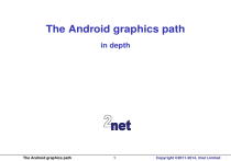 The Android graphics path in depth The Android graphics path 1 Copyright ©2011-2014, 2net Limited License These slides are available under a Creative Commons Attribution-ShareAlike 3.0 license. You can read the full text of the license here http://creativecommons.org/licenses/by-sa/3.0/legalcode You are free to • copy, distribute, display, and perform the work • make derivative works • make commercial use of the work Under the following conditions • Attribution: you must give the original author credit • Share Alike: if you alter, transform, or build upon this work, you may distribute the resulting work only under a license identical to this one (i.e. include this page exactly as it is) • For any reuse or distribution, you must make clear to others the license terms of this work The orginals are at http://2net.co.uk/slides/ The Android graphics path 2 Copyright ©2011-2014, 2net Limited About Chris Simmonds • • • • Consultant and trainer Working with embedded Linux since 1999 Android since 2009 Speaker at many conferences and workshops "Looking after the Inner Penguin" blog at http://2net.co.uk/ https://uk.linkedin.com/in/chrisdsimmonds/ https://google.com/+chrissimmonds The Android graphics path 3 Copyright ©2011-2014, 2net Limited Overview • The Android graphics stack changed a lot in Jelly Bean as a result of project Butter • This presentation describes the current (JB) graphics stack from top to bottom • Main topics covered • The application layer • SurfaceFlinger, interfaces and buffer queues • The hardware modules HWComposer and Gralloc • OpenGL ES and EGL The Android graphics path 4 Copyright ©2011-2014, 2net Limited The big picture Activity Activity BufferQueue Window Manager OpenGL ES HWComposer OpenGL vendor libraries GPU driver The Android graphics path Activity Manager SurfaceFlinger Android framework Gralloc FB Gralloc alloc FB driver ION Vendor HAL library 5 Kernel driver Copyright ©2011-2014, 2net Limited Inception of a pixel • Everything begins when an activity draws to a surface • 2D applications can use • drawing functions in Canvas to write to a Bitmap: android.graphics.Canvas.drawRect(), drawText(), etc • descendants of the View class to draw objects such as buttons and lists • a custom View class to implement your own appearance and behaviour • In all cases the drawing is rendered to a Surface which contains a GraphicBuffer The Android graphics path 6 Copyright ©2011-2014, 2net Limited 2D rendering path Activity Canvas HWUI Skia OpenGL ES Vendor Open GL GPU driver Surface The Android graphics path 7 Copyright ©2011-2014, 2net Limited Skia and hwui • For 2D drawing there are two rendering paths • hwui: (libwhui.so) hardware accelerated using OpenGL ES 2.0 • skia: (libskia.so) software render engine • hwui is the default • Hardware rendering can be disabled per view, window, activity, application or for the whole device • Maybe for comparability reasons: hwui produces results different to skia in some (rare) cases The Android graphics path 8 Copyright ©2011-2014, 2net Limited 3D rendering path • An activity can instead create a GLSurfaceView and use OpenGL ES bindings for Java (the android.opengl.* classes) • Using either the vendor GPU driver (which must support OpenGL ES 2.0 and optinally 3.0) • Or as a fall-back, using PixelFlinger, a software GPU that implements OpenGL ES 1.0 only • Once again, the drawing is rendered to a Surface The Android graphics path 9 Copyright ©2011-2014, 2net Limited 3D rendering path Activity OpenGL ES Android GL Vendor Open GL PixelFlinger GPU driver Surface The Android graphics path 10 Copyright ©2011-2014, 2net Limited Composition Status bar Navigation bar SurfaceFlinger Wallpaper Launcher The Android graphics path 11 Copyright ©2011-2014, 2net Limited SurfaceFlinger frameworks/native/services/surfaceflinger • A high-priority native (C++) daemon, started by init with UID=system • Services connections from activities via Binder interface ISurfaceComposer • Receives activity status from Activity Manager • Receives window status (visibility, Z-order) from Window Manager • Composits multiple Surfaces into a single image • Passes image to one or more displays • Manages buffer allocation, synchronisation The Android graphics path 12 Copyright ©2011-2014, 2net Limited SurfaceFlinger binder interfaces Client ISurfaceComposer e.g. activity ISurfaceComposerClient createConnection() createDisplayEventConnection() createSurface() destroySurface() IDisplayEventConnection getDataChannel() SurfaceFlinger The Android graphics path 13 Copyright ©2011-2014, 2net Limited ISurfaceComposer • ISurfaceComposer • Clients use this interface to set up a connection with SurfaceFlinger • Client begins by calling createConnection() which spawns an ISurfaceComposerClient • Client calls createGraphicBufferAlloc() to create an instance of IGraphicBufferAlloc (discussed later) • Client calls createDisplayEventConnection() to create an instance of IDisplayEventConnection • Other methods include captureScreen() and setTransactionState() The Android graphics path 14 Copyright ©2011-2014, 2net Limited ISurfaceComposerClient • ISurfaceComposerClient • This interface has two methods: • createSurface() asks SufraceFlinger to create a new Surface • destroySurface() destroys a Surface The Android graphics path 15 Copyright ©2011-2014, 2net Limited IDisplayEventConnection • IDisplayEventConnection • This interface passes vsync event information from SurfaceFlinger to the client • setVsyncRate() sets the vsync event delivery rate: value of 1 returns all events, 0 returns none • requestNextVsync() schedules the next vsync event: has no effect if the vsync rate is non zero • getDataChannel() returns a BitTube which can be used to receive events The Android graphics path 16 Copyright ©2011-2014, 2net Limited BufferQueue frameworks/native/include/gui/BufferQue