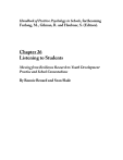 Handbook of Positive Psychology in Schools, forthcoming Furlong, M., Gilman, R. and Heubner, S. (Editors). Chapter 26 Listening to Students Moving from Resilience Research to Youth Development Practice and School Connectedness By Bonnie Benard and Sean Slade 26 Listening to Students Moving from Resilience Research to Youth Development Practice and School Connectedness BONNIE BENARD AND SEAN SLADE Last year a young man returned to the center for students with severe emotional and behavioral disorders where I work to talk with the principal. Mike had last seen this young man as he dove head first through a window into the waiting arms of police officers. He had been on a rampage in the school and had locked himself in Mike’s office. Mike had wondered over the years where the youth had gone aer his release from a juvenile justice program. Now, at age 23, the student returned to discuss the last incident he had had at the school and to express his gratitude to Mike for always taking time to listen. is young man just wanted Mike to know how much that had meant to him. He also told Mike that he was in college and doing well. (Rockwell, 1998, 16) is vignette is illustrative of a powerful body of evidence that undergirds and informs the field of positive psychology: research on human resilience in the face of risk, adversity, and challenge. ese prospective, longitudinal and developmental studies have followed children, oen from birth to adulthood, who were living in high-stress conditions such as poverty and community violence; family disruption and abuse; and parental alcoholism, mental illness, and incarceration (Clausen, 1993; Furstenberg, Cook, Eccles, Elder & Sameroff, 1999; Hetherington & Kelly, 2002; Masten & Coatsworth, 1998; Rutter & Sroufe, 2000 ; Sampson, Raudenbush, & Earls, 1997; Werner & Smith, 1992, 2001, 2005; Wilkes, 2002; Vaillant, 2002; Zucker, Wong, Puttler, & Fitzgerald, 2003). e consistent and amazing finding is that most - usually around 70%–75% of these young people - are able to experience life success. ese studies inform strengths-based movements such as positive psychology, strengths-based social work practice, youth development, health promotion, and multiple intelligences. e studies identify: (a) resilience as a natural capacity all youth have for healthy development and learning (Masten, 2001; Masten & Coatsworth, 1998; Werner & Smith, 1982, 1992); (b) the personal strengths that are the manifestations of engaging this innate resilience (Benard, 1991, 2004; Masten & Coatsworth, 1998; Werner & Smith 2001); (c) the characteristics or protective factors of families, schools, programs, and communities that engage innate resilience 353 Furlong_C026.indd 353 11/11/2008 10:52:24 AM 354 • Bonnie Benard and Sean Slade (Benard, 1991, 2004; Goldstein & Brooks, 2005 ; Eccles & Gootman, 2002; Masten & Coatsworth, 1998; Werner & Smith, 1982, 1992, 2001, 2005); and (d) adult/caregiver beliefs (Eccles & Gootman, 2002; Higgins, 1994 ; Luthar & Burak, 2000; Werner & Smith, 1992) as the locus of change. is chapter focuses on the role of schools in this turnaround process. It illustrates how we have facilitated schools moving from a deficit perspective to a position of resilience using youth development as a practice that partners with students in improving their schools. is approach makes optimal use of strengths-based survey data grounded in resilience theory and research, resilience and data-use training, and partnering with students for program improvement (Benard, 2004; Eccles & Gootman, 2002; Masten, 2001). We also highlight how the resiliency framework is effective in interactions with all students and not only those deemed by some to be “at-risk” (Luthar & Burak, 2000; Masten & Coatsworth, 1998; Werner, 2005; Benard, 1991; Masten, 2001; Masten & Coatsworth, 1998). e underlying theme is that everyone harbors resilience and is able to learn and develop the skills and understandings associated with resilience theory. When this approach is taken, everyone benefits—the individual, the school setting, and the community. Youth Development Process: Resilience in Action Resilience research supports a developmental theory of change (Bowlby, 1969; Bronfenbrenner, 1979; Erikson, 1963; Rogoff, 2003; see Figure 26.1). When young people experience home, school, and community environments rich in the proven developmental supports and opportunities (also called external assets or protective factors) of caring relationships, high expectations, and opportunities for meaningful participation and contribution, they are much more likely to meet their developmental needs or drives for love, belonging, respect, identity, power, mastery, challenge, and meaning (Benard, 2004; Masten & Coatsworth, 1998; Werner & Smith, 1992). Resilience can be viewed as a natural developmental wisdom that intrinsically motivates humans to meet their various needs (Masten, 2001; Masten & Coatsworth, 1998; Werner & Smith, 1982). In turn, the internal assets that define healthy development—social competence, problem solving, autonomy Youth Development Process: Resilience in Action Environmental Inputs Developmental Supports & Opportunities Caring Relationships High Expectations Meaningful Participation in Families Schools Communities Individual Inputs Developmental Needs Safety Love & Belonging Respect Power Challenge Mastery Meaning Individual O utputs Positive Developmental Outcomes Social Imp a cts Social Positive Emotional Prevention Cognitive Moral-Spiritual & Education Outcomes Caregiver’s BELIEF in Resilience Figure 26.1 Youth development framework. Furlong_C026.indd 354 11/11/2008 10:52:35 AM Listening to Students • 355 and identity, and sense of purpose and future—are tapped and nurtured in young people. ese internal assets are the natural developmental outcomes for youth who experience homes, schools, communities, and peer groups rich in the three basic developmental supports and opportunities.