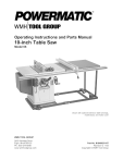 Operating Instructions and Parts Manual 10-inch Table Saw Model 66 shown with optional extension table and legs, mobile base, and motor cover WMH TOOL GROUP 2420 Vantage Drive Elgin, Illinois 60123 Ph.: 800-274-6848 www.wmhtoolgroup.com Part No. M-0460231NT Revision G 1/05 Copyright © WMH Tool Group This manual has been prepared for the owner and operators of a Powermatic 66 Table Saw. Its purpose, aside from machine operation, is to promote safety using accepted operating and maintenance procedures. To obtain maximum life and efficiency from your table saw and to aid in using it safely, please read this manual thoroughly and follow the instructions carefully. Warranty and Service WMH Tool Group warrants every product it sells. If one of our tools needs service or repair, one of our Authorized Repair Stations located throughout the United States can provide quick service or information. In most cases, a WMH Tool Group Repair Station can assist in authorizing repair work, obtaining parts, or perform routine or major maintenance repair on your Powermatic product. For the name of an Authorized Repair Station in your area, please call 1-800-274-6848, or visit our web site at www.wmhtoolgroup.com More Information Remember, WMH Tool Group is consistently adding new products to the line. For complete, up-to-date product information, check with your local WMH Tool Group distributor, or visit our web site at www.wmhtoolgroup.com WMH Tool Group Warranty WMH Tool Group makes every effort to assure that its products meet high quality and durability standards and warrants to the original retail consumer/purchaser of our products that each product be free from defects in materials and workmanship as follows: 1 YEAR LIMITED WARRANTY ON ALL PRODUCTS UNLESS SPECIFIED OTHERWISE. This Warranty does not apply to defects due directly or indirectly to misuse, abuse, negligence or accidents, normal wear-and-tear, repair or alterations outside our facilities, or to a lack of maintenance. WMH TOOL GROUP LIMITS ALL IMPLIED WARRANTIES TO THE PERIOD SPECIFIED ABOVE, BEGINNING FROM THE DATE THE PRODUCT WAS PURCHASED AT RETAIL. EXCEPT AS STATED HEREIN, ANY IMPLIED WARRANTIES OR MERCHANTABILITY AND FITNESS ARE EXCLUDED. SOME STATES DO NOT ALLOW LIMITATIONS ON HOW LONG THE IMPLIED WARRANTY LASTS, SO THE ABOVE LIMITATION MAY NOT APPLY TO YOU. IN NO EVENT SHALL WMH TOOL GROUP BE LIABLE FOR DEATH, INJURIES TO PERSONS OR PROPERTY, OR FOR INCIDENTAL, CONTINGENT, SPECIAL, OR CONSEQUENTIAL DAMAGES ARISING FROM THE USE OF OUR PRODUCTS. SOME STATES DO NOT ALLOW THE EXCLUSION OR LIMITATION OF INCIDENTAL OR CONSEQUENTIAL DAMAGES, SO THE ABOVE LIMITATION OR EXCLUSION MAY NOT APPLY TO YOU. To take advantage of this warranty, the product or part must be returned for examination, postage prepaid, to an Authorized Repair Station designated by our office. Proof of purchase date and an explanation of the complaint must accompany the merchandise. If our inspection discloses a defect, we will either repair or replace the product at our discretion, or refund the purchase price if we cannot readily and quickly provide a repair or replacement. We will return the repaired product or replacement at WMH Tool Group’s expense, but if it is determined there is no defect, or that the defect resulted from causes not within the scope of WMH Tool Group’s warranty, then the user must bear the cost of storing and returning the product. This warranty gives you specific legal rights; you may also have other rights, which vary from state to state. WMH Tool Group sells through distributors only. Members of the WMH Tool Group reserve the right to effect at any time, without prior notice, alterations to parts, fittings and accessory equipment, which they may deem necessary for any reason whatsoever. 2 Table of Contents Warranty and Service ..............................................................................................................................2 Warning...................................................................................................................................................4 Introduction..............................................................................................................................................6 Specifications ..........................................................................................................................................6 Unpacking ...............................................................................................................................................7 Contents of the Shipping Container ......................................................................................................7 Installation and Assembly ........................................................................................................................8 Mounting Extension Wings ...................................................................................................................8 Installing Blade.....................................................................................................................................9 Mounting Rails and Accu-Fence .........................................................................................................9 Optional Wood Extension Table ...........................................................................................................9 Splitter and Guard Assembly ................................................................................................................9 Motor Cover .......................................................................................................................................10 Grounding Instructions...........................................................................................................................10 Extension Cords...............................................................................................