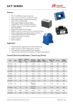 HCT SERIES Features • • • • • • • • • • • DC, AC Hall Effect Current Transducers Open Loop and Closed Loop operation Modes Wide range of primary current measurement s, from 5 A up to 1200 A RMS. Wide range of frequencies Band Width, Typically from 0 up to 50,100 and 200 kHz. Useful to measure Current spikes, overshoots and ringing effects. Bipolar and Unipolar Power Supply Different ways for connection, PTH or standard connector Output voltage signals typically for Open Loop Ones, Current signal outputs for closed loop ones Customized outputs Possibilities UL94V-0 material RoHS compliant Application • • • • General Industrial applications for current Monitoring Current measure on input stage batteries inverters UPS Applications (Uniterrumpibles Power Supplies) General using in Switched Power Supplies, for digital control systems General Electrical specifications. Closed Loop Devices Nominal Measuring (A Current (A Current RMS) DC) Secondary Supply Accuracy ( Linearity (See Mounting See Note 1) Note 2) Output Signal Voltage (V) Isolation (V AC 50Hz) Code Family HCT-25A05 A05 25 ±50 ± 25 mA ±15 ±0.5% 0,20% PCB 2500 HCT-35A05 A05 35 ±70 ± 35 mA ±15 ±0.5% 0,20% PCB 2500 HCT-100LP LP 100 ±300 ± 50 mA ±12-18 ±0.5% 0,10% PCB 3000 HCT-200LP LP 200 ±600 ± 100 mA ±12-18 ±0.5% 0,10% PCB 3000 HCT-50AP AP 50 ± 150 ± 50mA ± 12-18 ± 0,5% 0,10% PCB 3000 HCT-100AP AP 100 ± 300 ± 50mA ± 12-18 ±0,5% 0,10% PCB 3000 HCT-200AP AP 200 ± 600 ±100mA ± 12-18 ±0,5% 0,10% PCB 3000 HCT-300LTP LTP 300 ±900 ± 150 mA ±12-18 ±0.5% 0,10% Connector 6000 HCT-10PX5 PX5 10 ±22 3.5V@+Inom / 1.5V@-Inom 5 ±0.5% 0,10% PCB 3000 HCT-30PX5 PX5 30 ±66 3.5V@+Inom / 1.5V@-Inom 5 ±0.5% 0,10% PCB 3000 HCT-1000SH SH 1000 ±3000 ± 200 mA ±15-24 ±0.1% 0,10% Connector 4000 HCT-2000LF LF 2000 ±5000 ± 400 mA ±15-24 ±0.2% 0,10% Connector 4000 Specification is subjected to change without prior notice PREMO 2010 Page 1 HCT SERIES Notes (1) Accuracy levels at Nominal current, measured at room temperature over a 1 Ohm, non-inductive precision burden resistor ( for all the model except PX5 ones). (2)Typical linearity response, measuring from 10% to 100% of nominal current (3) Individual data sheet for each transducer available on Premo Website. All data are related to room temperature, 25ºC ± 2 ºC. General Electrical specifications. Open Loop Devices Code Nominal Current (A RMS) Measuring Secondary Current (A Output Signal DC) HCT-100BP1 HCT-200BP1 HCT-600BP1 HCT-100BP2 HCT-200BP2 HCT-600BP2 100 200 600 100 200 600 ±300 ±600 ±1000 ±300 ±600 ±1000 ±4V ±4V ±4V ±4V ±4V ±4V ±15 ±15 ±15 ±15 ±15 ±15 ±1% ±1% ±1% ±1% ±1% ±1% HCT-50BP5 50 ±100 3.5V@+Inom / 1.5V@-Inom 5 HCT-100BP5 100 ±200 3.5V@+Inom / 1.5V@-Inom HCT-500F 500 ±1200 HCT-800F 800 HCT-1000F Supply Voltage (V) Accuracy (See Linearity ( Note 1) See Note 2) Mounting Isolation (V AC 50Hz) <1% <1% <1% <1% <1% <1% PCB PCB PCB PCB PCB PCB 2500 2500 2500 2500 2500 2500 ±1% <1% PCB 3000 5 ±1% <1% PCB 3000 ±4V ±15 ±1% < 1% Connector 5000 ±1600 ±4V ±15 ±1% < 1% Connector 5000 1000 ±2000 ±4V ±15 ±1% < 1% Connector 5000 HCT-100N 100 ±300 ±4V ±15 ±1% < 1% Connector 3000 HCT-300N 300 ±900 ±4V ±15 ±1% <1% Connector 3000 HCT-1000K 1000 ±2000 ±4V ±15 ±1% < 1% Connector 6000 HCT-1200K 1200 ±2500 ±4V ±15 ±1% <1% Connector 6000 HCT-50LB 50 ±150 ±4V ±15 ±1% < 1% Connector 2500 HCT-100LB 100 ±200 ±4V ±15 ±1% <1% Connector 2500 Notes (1)Accuracy levels at Nominal current, measured at room temperature over a 10 kOhm burden resistor . (2)Typical linearity response, measuring from 10% to 100% of nominal current (3) Individual data sheet for each transducer available on Premo Website. All data are related to room temperature 25ºC ± 2 ºC. Recommended installation Diagrams. Closed Loop Devices Open Loop Devices VCC + Vcc + HCT Vout HCT 0V M Rb - -VCC Vout R >10k - Vcc GND Specification is subjected to change without prior notice PREMO 2010 Page 2 HCT SERIES Typical Accuracy Vs Primary Current Range and Output transfer function. In the graphs showed as per below accuracy levels reached with each family are presented. The curves present the typical average values. Ideal transfer function input current vs output signals are presented as well. A05 FAMILY A05 Output Transfer Function Relative Error A05 Family 800 Output V oltage (mV) % Er ror of Measure 2 1,5 1 0,5 0 0 50 100 150 600 400 200 HCT-25A05 0 -200 HCT-35A05 -400 -600 -800 200 -200 -150 -100 -50 % of N ominal Current 0 50 100 150 200 % of Nominal Current Data at 25ºC. Burden resistor used 10 Ohm ± 0.2 %. Vcc ± 15V LP FAMILY LP Output Transfer Function Relative Error LP Family 4 3 Output V oltage (V) % Er ror of Measure 2 1,5 1 0,5 2 HCT-100LP 1 0 -1 -2 HCT-200LP -3 0 0 50 100 150 200 250 -4 300 -300 -200 -100 % of N ominal Current 0 100 200 300 200 300 % of Nominal Current Data at 25ºC. Burden resistor used 10 Ohm ± 0.2 %. Vcc ± 15V AP FAMILY AP Output Transfer Function Relative Error AP Family 4 3 Output V oltage (V) % Er ror of Measure 2 1,5 1 0,5 2 HCT-50 &100AP 1 0 -1 -2 HCT-200AP -3 0 0 50 100 150 200 250 300 % of N ominal Current -4 -300 -200 -100 0 100 % of Nominal Current Data at 25ºC. Burden resistor used 10 Ohm ± 0.2 %. Vcc ± 15V Specification is subjected to change without prior notice PREMO 2010 Page 3 HCT SERIES LTP FAMILY LTP Output Transfer Function Relative Error LTP Family Output V oltage (V) % Er ror of Measure 2 1,5 1 0,5 0 0 50 100 150 200 250 300 5 4 3 2 1 0 -1 -2 -3 -4 -5 -300 -200 % of N ominal Current -100 0 100 200 300 % of Nominal Current Data at 25ºC. Burden resistor used 10 Ohm ± 0.2 %. Vcc ± 15V PX5 FAMILY Relative Error PX5 Family PX5 Output Transfer Function 1,75 Output V oltage (V) % Er ror of Measure 2 1,5 1,25 1 0,75 0,5 0,25 0 0 20 40 60 80 100 120 140 5 4,5 4 3,5 3 2,5 2 1,5 1 0,5 0 -150 -100 % of N ominal Current -50 0 50 100 150 % of Nominal Current Data at 25ºC. Vcc = 5 V LF & 