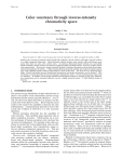 Tan et al. Vol. 21, No. 3 / March 2004 / J. Opt. Soc. Am. A 321 Color constancy through inverse-intensity chromaticity space Robby T. Tan Department of Computer Science, The University of Tokyo, 4-6-1 Komaba, Meguro-ku, Tokyo, 153-8505, Japan Ko Nishino Department of Computer Science, Columbia University, 1214 Amsterdam Avenue, MC 0401 New York, New York 10027 Katsushi Ikeuchi Department of Computer Science, The University of Tokyo, 4-6-1 Komaba, Meguro-ku, Tokyo, 153-8505, Japan Received April 21, 2003; revised manuscript received September 15, 2003; accepted November 4, 2003 Existing color constancy methods cannot handle both uniformly colored surfaces and highly textured surfaces in a single integrated framework. Statistics-based methods require many surface colors and become error prone when there are only a few surface colors. In contrast, dichromatic-based methods can successfully handle uniformly colored surfaces but cannot be applied to highly textured surfaces, since they require precise color segmentation. We present a single integrated method to estimate illumination chromaticity from singlecolored and multicolored surfaces. Unlike existing dichromatic-based methods, the proposed method requires only rough highlight regions without segmenting the colors inside them. We show that, by analyzing highlights, a direct correlation between illumination chromaticity and image chromaticity can be obtained. This correlation is clearly described in ‘‘inverse-intensity chromaticity space,’’ a novel two-dimensional space that we introduce. In addition, when Hough transform and histogram analysis is utilized in this space, illumination chromaticity can be estimated robustly, even for a highly textured surface. © 2004 Optical Society of America OCIS codes: 150.0150, 150.2950. 1. INTRODUCTION The spectral energy distribution of light reflected from an object is the product of the illumination spectral energy distribution and the surface spectral reflectance. As a result, the color of an object observed in an image is not the actual color of the object’s surface. Recovering the actual surface color requires the capability to discount the color of illumination. A computational approach to recover the actual color of objects is referred to as a color constancy algorithm. Human perception inherently has the capability of color constancy. This capability plays important roles in object recognition processes. Unfortunately, up to now, the mechanism of human perception color constancy has not been well understood. For machine vision, color constancy is essential for various applications, such as colorbased object recognition, color reproduction, image retrieval, reflection components separation, etc. This has motivated researchers in the field of machine vision to develop various color constancy methods. Previous work. Finlayson and Schaefer1 categorized color constancy methods into two classes: statisticsbased and physics-based methods. Statistics-based methods utilize the relationship between color distributions and statistical knowledge of common lights and surfaces.2–8 One drawback of these methods is that they 1084-7529/2004/030321-14$15.00 require many colors to be observed on the target surfaces. On the other hand, physics-based methods,9–13 whose algorithms are based on understanding the physical process of reflected light, can successfully deal with fewer surface colors, even to the extreme of a single surface color.1,14 In addition, based on the surface type of the input image, physics-based methods can be divided into two groups: diffuse-based and dichromatic-based methods. Diffusebased methods assume that input images have only diffuse reflection, while dichromatic-based methods assume that both diffuse and specular reflections occur in the images. Geusebroek et al.15,16 proposed a physical basis of color constancy by considering the spectral and spatial derivatives of the Lambertian image formation model. Andersen and Granum17 provided an analysis on image chromaticity under two illumination colors for dichromatic surfaces. Since our aim is to develop an algorithm that is able to handle both single and multiple surface colors, we will concentrate our discussion in this section on existing physics-based methods, particularly dichromaticbased methods. Methods in dichromatic-based color constancy rely on the dichromatic reflection model proposed by Shafer.18 Klinker et al.19,20 introduced a method to estimate illumination color from a uniform colored surface by extracting a T-shape color distribution in RGB space. However, in © 2004 Optical Society of America 322 J. Opt. Soc. Am. A / Vol. 21, No. 3 / March 2004 real images, it becomes quite difficult to extract the T shape as a result of noise, thereby making the final estimate unreliable. Lee11 introduced a method to estimate illumination chromaticity using highlights of at least two surface colors. The estimation is accomplished by finding an intersection of two or more dichromatic lines in chromaticity space. While this simple approach based on the physics of reflected light provides a handy method for color constancy, it suffers from a few drawbacks. First, to create the dichromatic line for each surface color from highlights, one needs to segment the surface colors beneath the highlights. This color segmentation is difficult when the target object is highly textured. Second, nearly parallel dichromatic lines caused by similar surface colors can make the intersection sensitive to noise. Consequently, for real images, which usually suffer from noise, the estimation for similar surface colors becomes unstable. Third, the method does not deal with uniformly colored surfaces. Parallel to this, several methods have been proposed in the literature.8,21,22 Recently, three methods have been proposed that extend Lee’s algorithm12: Lehmann and Palm23 developed a more robust technique to identify the dichromatic lines in chromat