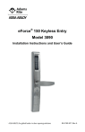 eForce® 150 Keyless Entry Model 3090 Installation Instructions and User’s Guide 1 80-0180-307, Rev A 2 80-0180-307, Rev A TABLE OF CONTENTS TABLE OF CONTENTS ............................................................................ 3 INSTALLATION ......................................................................................... 5 Important Notes ..................................................................................... 5 Tools and Equipment Needed............................................................... 5 Supplied Parts ....................................................................................... 6 Preparing the Door ................................................................................ 6 Preparing the Spindle ............................................................................ 8 Configuring the Model 3090 for Lock Series ......................................... 9 Handing the eForce 150...................................................................... 11 Installing the Mortise Cylinder ............................................................. 12 Mounting the eForce 150 .................................................................... 14 Installing the eForce 150 Batteries ..................................................... 15 SETTING UP AND USING THE eFORCE 150....................................... 16 General Information ............................................................................ 16 Programming Information.................................................................... 17 Speed Mode ........................................................................................ 17 User Code Descriptions ...................................................................... 18 Features and Options Descriptions ..................................................... 19 Programming the User Codes............................................................. 20 Master Code .................................................................................... 20 Reset Master Code ......................................................................... 21 Emergency Code ............................................................................ 21 Supervisor Code.............................................................................. 22 Lockout Code .................................................................................. 23 3 80-0180-307, Rev A Passage Code................................................................................. 24 Normal User Codes ......................................................................... 24 One Time User Codes .................................................................... 25 Programming Features and Options ................................................... 26 Delete All User Codes ..................................................................... 26 Delete Supervisor, Lockout, Passage, or a Single Normal User Code ................................................................................................ 26 Delete a Block of Normal User Codes ............................................ 27 Reset All Features to Default Values .............................................. 28 Set Audible Keypad Feedback ........................................................ 28 Set Visual Keypad Feedback .......................................................... 29 Set Number of Successive Invalid User Code Entries Accepted.... 29 Set Error Lockout Time ................................................................... 30 Set Hold-Open (Unlock) Time ......................................................... 30 Set Emergency Hold-Open (Unlock) Time...................................... 31 Replacing the eForce 150 Batteries .................................................... 31 Replacing the Mortise Cylinder ........................................................... 33 TROUBLESHOOTING ............................................................................ 37 Green light comes on, but lever will not retract latch-bolt. .............. 37 No lights come on when pushbuttons are depressed. .................... 37 No tones sound when pushbuttons are depressed......................... 37 Factory default codes not working. ................................................. 37 User codes not working................................................................... 37 Operator stays unlocked. ................................................................ 37 WARRANTY ............................................................................................ 38 eFORCE 150 USER LOG ....................................................................... 39 4 80-0180-307, Rev A INSTALLATION Important Notes The 3090-01 is designed exclusively for latching hardware including: • • • • Adams Rite 4500/4900 deadlatches Adams Rite 8000 series exit devices Yale 7200 series narrow stile exit devices Corbin Russwin ED4000 series The 3090-02 is compatible with Adams Rite MS® Series Deadbolts only! These units are not interchangeable. These instructions, and the fasteners supplied, apply to metal door applications. Other door types will need fasteners designed for the given medium. IMPORTANT: This product must be installed according to all applicable building and life safety codes! Tools and Equipment Needed The following common hand tools are needed for installation: • • • • • • • Center punch Drill gun 1/4” [6.35 mm] drill bit Phillips screwdriver Pliers Flat tip screwdriver Pencil The following additional equipment is needed: NOTE: • 5 1-1/2” cylinders require a 1/8” trim ring. Mortise Cylinder - 1” to 1-1/2” in length range with MS cam 80-0180-307, Rev A Supplied Parts NOTE 1: Figure 1 illustrates the supplied parts. NOTE 2: A cam plug is supplied for either the 3090-01 or 3090-02. Item Description Quantity 1 Mounting Bracket (Part Nu
