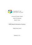 SMS Based Information Systems Pankaj kumar Jaiswal September, 2011 ABSTARCT The Short Message Service (SMS) allows text-based messages to be sent to and from mobile telephones on a GSM network. Each message has a maximum length of 160 characters. The possibility of using SMS in Africa is growing rapidly high. It is mostly used for things such as medicine awareness and warning notifications. In Mozambique health workers can support diagnosis & treatment through Bulk SMS and even in Uganda, Malawi and Benin health education messages are sent by text messages. SMSbased transactional alerts are SMS’s sent each time a change occurs in a bank account, for example, or when your credit card is used then you will get an SMS on your mobile phone. Marketing on a mobile phone has become increasingly popular ever since the rise of SMS in the early 2000s in Europe and some parts of Asia when businesses started to collect mobile phone numbers and send off wanted (or unwanted) content. Many applications need the ability to do real-time notification when events occur. Often the people who need to be kept aware of events are in a remote location. Cell phones have recently started being used in Africa for sending SMS-based information. These simple systems have already had a major impact. The reason why SMS gets through: With the massive growth and inadequate infrastructure in many countries, voice and where available IP are just not feasible unless there is massive investment to bring up the networks. SMS will get through even when the ‘network is busy’ for hours. Some of the possible services that exist are: car parking systems, M-learning, market information via SMS, automated agricultural answering system and many others. SMS messaging has already shown great potential. The FAO is using SMS messaging as a data transmission system for field workers wishing to send in agricultural reports. The Zambian farmer’s union uses SMS messages to distribute market prices. The SMS system has been more beneficiary for farmers in some part of African countries where they can send SMS through mobile and get the instant message reply for taking the decision for selling the crops at good price. A local management information system for small farmers and traders gives information on prices, trade volumes, market flows and growing conditions in local language via SMS on mobile phones. In this thesis the main finding is about in which of the respective areas the SMS system is being used and how does it help the human life to be more comfort. CERTIFICATION The undersigned certifies that he has read and hereby recommend for acceptance by the University of Eastern Finland a thesis entitled: SMS-Based Information Systems, in fulfillment of the requirements for the degree of Master of Science (MSC) in University of Eastern Finland. ………………………………. ……………………............ (Supervisor) Date ……………………………….. ……………………………… (Co-Supervisor) Date ACKNOWLEGEMENTS I am grateful to University of Eastern Finland for giving the opportunity to participate in the IMPIT program and broaden my vision and experience. I would like to sincerely thank my supervisor Mikko Malinen and co-supervisor, Professor Pasi Fränti, for his significant guidance and helpful advices to my research and work. I would also like to thank every member of the computer science department for their kind support and advices during my work. I would like to express my thanks to the service providers (TIGO and ZAIN) and Mosses Nkwendwe at Dar es Salaam Institution of Technology for accepting us and having a discussion about the study topic. I would like to express my thanks to all of my friends for their support and encouragement for good co-operation for fulfillments of my thesis I would like to denote my deepest love and gratitude to my family for their moral support and especially to my fuancy Neema Thomas laizer for her endless support and help to my studies and life. I truly appreciate all of you. Lastly, I would like to state truthful gratitude to the lecturers who taught me; especially Prof. Alexander kolesnikov, Prof. Päsi, Prof. Erkki, Dr. Mikko Vessinaho for his kind support and research and PhD Fellow Marcus . Table of contents ABSTRACT……………………...................................................................i, ii CERTIFICATION…………………………………………………………..iii ACKNOWLEDGEMENT...………………………………………………...iv TABLE OF CONTENTS…………………………………………………....v ACRONYMS AND ABBREVIATION………………………………….....vi CHAPTER ONE: INTRODUCTION…………………………………….....1 1.1) Background of the problem and definition..…………………………….1 1.2) Statement of the problem ...........................................................................8 1.3) Benefit of SMS based marketing systems………………………………..….…..8 1.4) Objectives of establishing and networking of agricultural market intelligence SMS systems………………………………………………...9 1.5) ICT, market access and its implications for rural farmers…………....10 1.6) Issues concerning SMS-based systems…………………………..……...11 1.7) SMS advertising…………………………………………………............14 CHAPTER TWO: LITERATURE REVIEW…………………………….16 2.1) Mobile marketing………….……………………………………………..16 2.1.1 Example of SMS services……………………………………….....16 2.1.2 Communication and Administrative support……........................17 2.1.3 Library Applications……………………………………………....18 2.1.4 Teaching and Learning Support……………………………….....19 2.1.5 Mobile