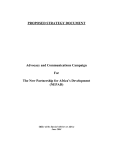 PROPOSED STRATEGY DOCUMENT Advocacy and Communications Campaign For The New Partnership for Africa’s Development (NEPAD) Office of the Special Advisor on Africa June 2004 PROPOSED STRATEGY DOCUMENT INTRODUCTION: Without a doubt, a communication campaign strategy for the support of NEPAD is starting almost two years late. This should therefore sensitize NEPAD promoters at all levels on the urgency of the assignment. And in a very determined and laudable effort to ensure the success of NEPAD, the Office of the Special Adviser for Africa has already stepped up to the plate by charting the prudent course towards a successful of advocacy and communication campaign. To achieve this, the Office’s Coordination, Advocacy and Programme Development Unit will serve as the secretariat for a proposed Advocacy Cluster within the framework of the ECA. Besides, OSAA’s readiness to fashion out a strategy document for communication and advocacy of NEPAD indicates the importance of the task of selling NEPAD to the entire target audience. A proper articulation and dissemination of NEPAD as a programme aimed at African development, cannot be overstated. While OSAA’s role would largely be as a supporter especially in initiating a global strategy and pushing for continuous monitoring and coordination, in the area of target audiences, OSAA is uniquely and strategically placed to oversee the G8 publics and media outlets especially in a year that the United States is assuming the chairmanship of the G8 group. MANDATE: This document is prepared pursuant to Resolution of the General Assembly 57/300 and the Secretary General’s Bulletin SGB/ 6/2003, which mandates the Office of Special Adviser on Africa (OSAA) to coordinate global advocacy in support of NEPAD and act as a focal point for NEPAD within the United Nations Headquarters. It is intended to become a framework for advocacy and communications campaign to support the implementation of NEPAD. The campaign is to be conducted jointly by the UN family organizations and the NEPAD Secretariat and its partners at the country, regional and global levels. This document focuses on communication and advocacy activities, that is, events, publications and forums aimed at advocating for NEPAD’s position and work. The main objective of the proposals formulated in this paper are to promote synergies and complementarities within the UN system and between the Organization and its non-UN partners, and to improve the effectiveness of communication and advocacy activities undertaken by the UN family organizations and the NEPAD Secretariat. While recognizing that there is a lot of information about NEPAD, it is felt that this is not always managed in the way that can produce the desired effects. In other words, the information on NEPAD is produced without clear and measurable goals which are not tailored to the needs of a specific target nor does it include indicators of success. The present document intends to help correct this and to promote framework for enhanced coordination among the UN system and between the UN and non-UN members because such a framework among the UN family Organizations and between these and non-UN members would enhance advocacy and communications campaign in support of NEPAD. The document is predicated on the belief that support by the stakeholders for the implementation of NEPAD is a long-term objective that will need a long-term and sustained communications campaign and this campaign will be more effective if the operators make the effort to identify clear and measurable goals, carefully select the target audiences and communicate on their needs through clear and simple messages Thus the document makes an effort to identify some of these target audiences and it provides some pointers on how the advocacy and communications campaign to support NEPAD and African issues can be organized. However, it does not go as far as proposing specific strategies for each of the identified components of the advocacy campaign but clearly enunciate what the basic communication goals ought to be at all levels. The document also provides the framework for implementation or a plan of action format containing series of activities connected with measurable goals and objectives. It is thus expected that UN family organizations can enter the campaign, and contribute with specific strategies appropriate for their respective areas of specialization tailored to the needs of each phase of the campaign. THE NEED FOR A STRATEGY: The need for a strategy for communication and advocacy cannot be overemphasized. After two years of adoption, NEPAD as a policy framework for the development of the African continent is still largely to be adequately disseminated in a way that it would resonate both in Africa and in important western capitals. A fairly common directive communication strategy would help coalesce a framework upon which operators can begin to create awareness for NEPAD and also build credibility for the programme among partners and the African people. That way the prevailing lack of knowledge about NEPAD and what the programme stands for would be reduced. A strategy would also bring together operators of NEPAD who are logistically located in various stations right from the country structures, to the regional communities, continental and global operators and partners. By so doing common communication goals would be set, with a message that would also be shared by all operators so that there would be fidelity in the messages that are going out from all the bases of NEPAD operations. This way information presented would be tailored to specific goals of the programme and specific goals of the communications campaign. A common message being disseminated at all levels of NEPAD campaigns would inspire a sense of purpose and would inspire well-coordinated NEPAD programming at al levels of implementation. Similarly a communication strategy would prepare the operators of NEPAD for