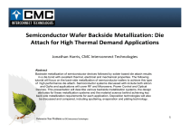 Semiconductor Wafer Backside Metallization: Die Att h f Hi h Th Attach for High Thermal Demand Applications lD d A li ti Jonathan Harris, CMC Interconnect Technologies , g Abstract Backside metallization of semiconductor devices followed by solder based die attach results in a die bond with excellent thermal, electrical and mechanical properties. The following tutorial will focus on the back-side metallization of semiconductor wafers to achieve this type of high performance die attach. Semiconductor systems discussed with include both silicon and GaAs and applications will cover RF and Microwave, Power Control and Optical Devices. This presentation will describe various backside metallization systems, the design attributes for these metallization systems and the material science behind achieving key back side metallization requirements for each application. Deposition technologies will also be discussed and compared, including sputtering, evaporation and plating technology. 1 What is Backside Metallization of SC Wafers? Wirebonds Multilayer Metallization on Wafer Backside SC Die Die Attach Package or Board Semiconductor Wafer 2 BSM is Critical for High Power pp Semiconductor Applications • Heat dissipation pathway‐ through the die attach layer into the package/board • Power densities up to 500 Watts/cm2 • Discrete Power Devices‐ IGBT and Power MOSFETs – Motor control for appliances and automotive Motor control for appliances and automotive – Power Supplies • RF Power Amplifiers‐ GaAs and Si LDMOS – Cellular Infrastructure Cellular Infrastructure – Microwave Radios – Radar • High Brightness LEDs Hi h B i ht LED – Automotive signal and head lights – Signage, illumination • Laser Diodes‐ Telecommunications 3 BSM is Critical for High Power pp Semiconductor Applications Fiber Laser Ceramic Submount TEC HBLED ‐ Diode AuSn Attach to Ceramic Laser Diode‐ Fiber Optic Telecom ‐ Diode AuSn Attach to Ceramic Submount Diode AuSn Attach to Ceramic Submount Power Semiconductor‐ Motor Control ‐ Power SC solder attached to copper pad in PCB 4 Backside Metallization Function • Thermal Thermal interface interface between the SC die and between the SC die and package • Bonding layer Bonding layer between die and die attach between die and die attach material • Electrical interface El i li f b between the SC die h SC di and package (some applications) 5 BSM Characteristics to Meet Functional Requirements • Atomic bonding between BSM and SC surface – Stable up to die attach temperature Stable up to die attach temperature – Robust adhesion through temperature cycling – Low thermal impedance interface • Effective wetting of solder die attach material to BSM to produce ff f ld d h l d a void free die attach layer – BSM surface must be free of oxide/nitride – BSM must block impurity diffusion to surface which could oxidize • Minimum Intermetallic Compound Formation when BSM Reacts with Solder Layer – IMC layers are brittle and lead to reliability issues – Ternary IMC compounds are more brittle than binary – Thin, discontinuous IMC layers are preferred • BSM layer must be low thermal resistance BSM l t b l th l it 6 Design Parameters for a BSM ‐ y y Multilayer System Semiconductor Wafer Adhesion Layer Oxidation Protection Layer y Barrier/ Wetting Layer Di Att Die Attach h Solder S ld Multifunction BSM is accomplished with a multilayer thin film M ltif ti BSM i li h d ith ltil thi fil 7 Design Parameters for a BSM ‐ Multilayer System Multilayer System BSM Layer Key Function Design Issues Adh i Adhesion Adhere to the Adh t th semiconductor surface 1. 1 2. 3. Barrier/Wetting Wet the die attach solder Wet the die attach solder 1 1. 2. 3. 4. O id i P Oxidation Protection i Protect the surface from P t t th f f oxidation prior to die attach Minimize thermal impedance. Minimize thermal impedance Bond to the SC surface without forming a thick, continuous or ternary IMC layer. Bond to an oxide free SC surface Prevent diffusion of Prevent diffusion of under ‐layer under ‐layer contaminants which could effect solder wetting. Wet the solder without forming thick, continuous or ternary IMC during die attach. Minimize thermal impedance. Low internal stress for mechanical stability. Minimize thickness to Mi i i thi k t avoid altering solder id lt i ld composition during die attach 8 Multilayer BSM Material Systems Adhesion Layer Conductivity Layer (some cases) Barrier/ Wetting Layer Oxidation Protection Die Attach Solder Ti, Ti/W, Cr Cu NiV, Ni, Ni(P), Pt Pd, Pt, Pd Co, Co Co(P), NiCo, NiCo(P) Au, Pt AuGe, AuSn, A Si PbSn AuSi, PbSn, CuAgSn 9 The Material Science of BSM Layers The Material Science of BSM Layers 1. 2. 3. 4. Surface Preparation Adhesion Layer Barrier/ Solder Wetting Layer Barrier/ Solder Wetting Layer Die Attach Solders 10 The Materials Science of BSM y p Layers: SC Surface Preparation • Goal Goal‐ Pristine Semiconductor surface Pristine Semiconductor surface – Removal of oxide layers – Removal of organic contamination – Removal of micro cracked layers from lapping • Approaches pp – Plasma clean (organics) – Sputter clean (Argon bombardment) – Chemical etch 11 The Materials Science of BSM Layers: SC Surface Preparation Effect of Oxidation on Adhesion Chemical Clean Followed by Exposure to Humidity 1. 2. 3. Si (100) cleaned with HF/ DI water Auger spectra taken after exposure to 45% humidity for 0 0- 1000 hours Auger shows growth of y and dilution SiO2 layer of Si on the surface 12 Kondo, J. Vac. Sci. Technol. A 11(2) Mar/Apr 1993 The Materials Science of BSM Layers: SC Surface Preparation Effect of Oxidation on Adhesion Preparation Effect of Oxidation on Adhesion Amount of Sputtered Ti/Ni Film Peeled Using 80 N/m 100 90 80 70 60 % 50 40 30 20 10 0 Formation of SiO2 on the Si Surface can degrade Ti adhesion 1 10 100 1000 45% Humidity Exposure Time (Hrs) 13 Kondo, J. Vac. Sci. Technol. A 11(2) Mar/Apr 1993 The Materia