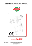 USE AND MAINTENANCE MANUAL ® GUN MOD. (Rev. 4 - 30/08/07) 3A MIX ASTURO ORIGINALI MAVES Spa Via Cascina Venina 20 B/C 20090 Assago (MI) ITALY DICHIARAZIONE DI CONFORMITÀ / DECLARATION OF CONFORMITY KONFORMITÄTERKLÄRUNG / DECLARATION DE CONFORMITÉ DECLARACIÓN DE CONFORMIDAD ASTURO ORIGINALI MAVES Spa Via Cascina Venina 20 B/C ASSAGO - ITALIA ++39 0289305416 - FAX ++39 0289305497 P.IVA / VAT (registration number) 11164500156 ® MODELLO / MODEL: 3A MIX N_ di MATRICOLA / SERIAL NUMBER ANNO DI COSTRUZIONE / YEAR OF MANUFACTURE 200 ACCESSORI IN DOTAZIONE / ACCESSORIES SUPPLIED A.O.M spa DICHIARA sotto la sua esclusiva responsabilità che la macchina a cui la presente dichiarazione si riferisce è conforme alle prescrizioni delle seguenti direttive: A.O.M spa DECLARES on its own responsibility that the machine to which this declaration refers conforms with the requirements in the following directives: DIRETTIVA 89/392/CEE MODIFICATA DALLA DIRETTIVA 91/368/CEE DALLA DIRETTIVA 93/44/CEE E DALLA DIRETTIVA 93/68/CEE (DIRETTIVA MACCHINE) DIRECTIVE 89/392/EEC AMENDED BY DIRECTIVE 91/368/EEC BY DIRECTIVE 93/44/EEC AND BY DIRECTIVE 93/68/EEC (MACHINE DIRECTIVE) La macchina è inoltre conforme alle seguenti norme / The machine also conforms with following standards: UNI EN 292/1 (november 1992) Sicurezza del macchinario, Concetti fondamentali, principi generali di progettazione.- Terminologia, metodologia di base Machine safety, Fundamental concepts, General design principles - Terminology, basic methodology. UNI EN 292/2 (november 1992) Sicurezza del macchinario - Concetti fondamentali, principi generali di progettazione - Specifiche e principi tecnici Machine safety - Fundamental concepts. General design principles - Technical specification and principles. LUOGO / PLACE: ASSAGO COGNOME - NOME / SURNAME - NAME: BRANCHINI RIZIERI POSIZIONE / POSITION: AMMINISTRATORE UNICO / SOLE DIRECTOR DATA / DATE: / / / SIGNATURE:........................................... DearCustomer, We want to thank you for choosing one of ASTURO ORIGINALI MAVES Spa products. ASTURO ORIGINALI MAVES Spa is a leading reference point in the field of painting systems and machinery. The name ASTURO ORIGINALI MAVES Spa has always meant reliability and safety and this is supported by over 70 years of experience and by our Customer satisfaction. All our components have been designed and manufactured to guarantee the best performance ever. To maintain the high quality level and lengthy reliability of our products throughout the years, always use original spare parts. ASTURO ORIGINALI MAVES Spa units have the CERTIFICATION in accordance with EUROPEAN DIRECTIVE 89/392 (Machine Directive.) We are certain to have met all safety requirements and we feel confident we have further improved working standards. Our units, in fact, have the identification in accordance with rulings. Furthermore, they are delivered with the instruction manual and the certificate with the Declaration of Conformity to European Directive 89/392 and to its various amendments. The Management ® USE AND MAINTENANCE MANUAL GENERAL CONTENTS HOW TO USE THE MANUAL................................................................................................................4 SYMBOLS USED...................................................................................................................................4 INFORMATION LETTER.................................................................................................................5 1.1 2.1 2.2 2.3 2.4 2.5 2.6 3.1 3.2 3.3 3.4 3.5 4.1 4.2 4.3 4.4 PACKAGING..............................................................................................................6 IDENTIFICATION DATA................................................................................................................6 MACHINE DESCRIPTION............................................................................................................7 TECHNICAL FEATURES...........................................................................................................8 STANDARD AND OPTIONAL COMPONENTS..........................................................................8 MACHINABLE PRODUCTS.....................................................................................................9 DIMENSIONS........................................................................................................................9 INSPECTION OF PURCHASED PRODUCT.............................................................................10 INSTALLATION CONDITIONS...................................................................................................10 HOW TO USE THE GUN............................................................................................................10 STRUCTURES TO BE ARRANGED.........................................................................................11 SAFETY PROCEDURES DURING USE..................................................................................11 PRESSURE DISCHARGE PROCEDURES..............................................................................12 ROUTINE MAINTENANCE..................................................................................................12 HOW TO USE THE SELFCLEANER..............................................................................13 TROUBLESHOOTING...................................................................................................14 WARRANTY GUN ASSEMBLING DRAWINGS HOW TO USE THE MANUAL The following manual is a document that accompanies the machine thouroughout its lifetime. It is, therefore, an integral part of the machine. Carefully read the following warnings and procedures before engaging in any activity with this machine, including handling and unloading it from its mean of transportation. SYMBOLS USED All operations which might be dangerous if not performed correctly are indicated with the following sym