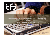 Interpolating ADCs ADCs, Folding ADCs and Oversampling Converters Tuesday uesday 16th 6t of o March, a c , 2009, 009, 9:15 9 5 – 11:00 00 Snorre Aunet, sa@ifi.uio.no Nanoelectronics Group, Dept. of Informatics Office 3432 Last time – and today, Tuesday 16th of March: L Last time: i 13.1 Integrating Converters 13.2 Successive-Approx. Converters 13.3 Algorithmic (or cyclic) A/D Converters 13.4 Flash (or parallel) converters 13.5 Two-Step A/D converters 13 8 Pipelined 13.8 Pi li d A/D C Converters t 13.9 Time-Interleaved A/D Converters T d – from Today f the th following f ll i chapters: h t 13.6 Interpolating A/D Converters 13.7 Folding A/D Converters 14 1 O 14.1 Oversampled l d converters t Interpolating ADCs. Rightmost interpol.=4 (1/4) Vreff R ---2 R Vin Over range Vr7 R Vr6 R Vr5 R Vr4 R Vr3 (2N –1) to N R R R 2 encoder N digital outputs Vr2 Vr1 Comparators • Reduced complexity compared to Flash ADCs reduced input capacitance and slightly reduced power. • In I the th mathematical th ti l subfield bfi ld off numerical i l analysis, l i interpolation i t l ti is i a method of constructing new data points within the range of a discrete set of 3 16.known mars 2010data points. Interpolating ADCs (2/4) • Uses input amplifiers behaving as linear amplifiers lifi near th their i threshold voltages, allowed to saturate for moderately large input signals • Thus ”noncritical” noncritical latches need only determine the sign of the amplifier p outputs Interpolating ADCs (3/4) • Amplifier outputs V1 and V2 as well as their interpolated values are shown lowermost (fig. (fig 13 13.24) 24) • The reference points created from interpolated p values ((for example V2a, V2b, V2c) have latches potentially triggering in order, for increasing (or decreasing) input. • For F good d linearity li it th the interpolated signals need only cross the latch threshold at the correct points Interpolating ADCs (4/4) • To achieve good linearity V1 and V2 need to be linear between their own thresholds. In figure 13.24 this linear region corresponds to 0.25 < Vin < 0.5 (horizontally) • For fast operation the delays to each of the latches must be made t equall each to h other th as much h as possible. In fig. 13.25 this is done using resistors. Example, based on Fig. 13.23 (1/2) • Vin = 0.4 V, gain of -10, 10 llogic i llevels l off 0 and 5 volts. • V4 = 5 V • V3 = 5 V • V2 = 3.5 35V • V1 = 1.0 V Example – interpolating ADC (2/2) 16. mars 2010 8 Folding A/D Converters (13.7) b1 2-bit MSB A/D converter Vr ef = 1 V Folding block V1 1 (Volts) Folding block 0 V2 V3 V4 Vr = -1-- , -5---, ---9---, 13 ------ 16 16 16 16 4 ----16 1 (Volts) 12 --16 -8-16 V2 Latch Digital logic Vin i Threshold b3 3 ----16 b 4 7 --16 V3 11 -----16 15 -----16 Vin Threshold Latch 2 -----16 2 6 10 14 Vr = ----, ------, --- , ------ 16 16 16 16 Folding block Threshold 0 Vr = --3---, ---7---, 11 ------, 15 --- 16 16 16 16 Folding block V1 Latch 4 8 12 16 V r = ------, ------, --- , ----- 16 16 16 16 Vin Folding block responses b2 6 ---16 10 -----16 14 -----16 V4 Vin Threshold Latch 1 --16 5 -----16 9 ----16 13 ---16 Vin • The number of latches is reduced compared to the interpolating ADC, and even more from FLASH • The figure shows a 4 bit converter with folding rate of 4 • A group of LSBs are found separately from a group of MSBs. • The MSB converter determines whether the input signal, Vin, is in one of four voltage regions (between 0 and ¼, ¼ and ½ , ½ and ¾ , or ¾ and 1) • V1 to t V4 produce d a thermometer code for each of the four MSB regions Similar to folding block responses on previous slide.. • • • • • • • 16. mars 2010 Bipolar folder outputs Ex: Input 1.05: F1 > threshold=0 -> ”1” F2 > threshold=0 -> ”1” F3 > threshold=0 th h ld 0 -> > ”1” F4 < threshold=0 -> ”0” Thermometer code produced for each of the four MSB regions g ((between 0 and ¼, ¼ and ½ , ½ and ¾ , or ¾ and 1 for previous slide) • (in certain respects related to interpolation in Fig 13.24) 10 Folding block with a folding rate of four • Input Input-output output response for the cross-coupled differential pair is shown lowermost • Vout is low ifif, and only ifif, both Va and Vb are low, otherwise o e se high g • The output from a folding block is at a much higher frequency than the input signal, limiting the practical folding rate rate. • Differential solutions in practice Folding and Interpolating ADC b1 2-bit MSB A/D converter Folding-block responses b 2 V = 1V ref V 1 V4 R 1 (Volts) V1 Threshold Latch Vin 0 0 4 -----16 R V in Folding block V2 V2 Latch 3 7 11 15 V = ----- , ------ , ------, ------ r 16 16 16 16 R V 3 Latch Digital logic 3 -----16 b4 7 -----16 11 -----16 15 -----16 V3 2 -----16 6 -----16 10 -----16 Vin 14 -----16 Threshold Latch V V4 4 V in Threshold V4 V4 1 5 9 13 Vr = ------ , ------ , ------, ------ 16 16 16 16 Threshold b3 R Folding block 1 (Volts) 12 -----16 --8---16 ---1--16 5 -----16 9 -----16 13 -----16 Vin • By introducing interpolation the number interpolation, of folding blocks is reduced • Input capacitance is reduced (if both folding and d iinterpolating l i iis combined) • Folding-rate Folding rate of four and interpolate-by-two • (Literature references on page 523) Interpolating and folding and interpolating ADCs Resolution Sampling rate ENOB Power dissip. Supply voltage architecture reference 8 bit 100 MHz 6.5 bit@5V, 7.1 bit@8V 1.2W@5V 5 or 8 V interpolating Steyaert , Roovers, Craninckx, CICC 1993 CICC 1993 5 bit 5 GHz 4 bit at 5GHz 113 mW@1V 1 V interpolating Wang, Liu, VLSI‐DAT ’2007 2007 6 bit 200 MHz 5.35 bit 35 mW@3.3V 3.3V folding and interpolating Yin, Wang, Liu, ICSICT, 2008 6 bit 200 MHz 5.5 bit 78.8 mW@2.5V 2.5V folding and interpolating Silva, Fernandes, ISCAS, 2003 ISCAS, 2003 16. mars 2010 13 Oversampling converters (chapter 14 in ”J & M”) •F For high hi h resolution, l ti llow-to-medium-speed t di d applications like 