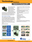 Technology Solutions System in Package (SiP) Semiconductor industry demands for higher levels of integration and lower costs coupled with a growing awareness of complete system configuration have continued to drive the popularity of System in Package (SiP) solutions. Amkor's SiP technology is an ideal solution in markets that demand smaller size with increased functionality. By assembling, testing and shipping more than one million SiP devices per day, Amkor Technology has a proven track record as the industry leader in SiP design, assembly and test. Contact us today and let us add you to our growing list of customers who have been successful with System in Package technology. What is System in Package? System-in-Package technology is more than just an IC package containing multiple die. A SiP is characterized by any combination of one or more ICs of different functionality, which may include passive components and/or MEMS assembled into a single package that performs as a system or sub-system. Using wirebonding or flip chip technology or a combination of both for the ICs, the SiP can contain components that are traditionally found on a PC board. Amkor's emphasis is on functional integration and size reduction by using different package form factors and interconnect technologies, including: • SiP Solutions (side by side, POSSUM™, stacked die, package on package (PoP), package in package (PiP), cavity, face-to-face (F2F) and others) • Surface mount discrete passive (any common format including 01005 size) • Integrated passive devices (IPD), either glass or silicon (Si) type • Passives embedded inside or patterned on the substrate • Die embedded in the package substrate • Surface acoustic wave (SAW)/bulk acoustic wave (BAW) filters, crystals, oscillators, antennas • Sputtering conformal shielding and compartmental conformal shielding • Core and coreless substrate • Recessed and cavity substrate • Doubled side mold • Double-sided assembly (POSSUM™) • Strip grinding fine pitch ultra-thin package • Different ICs integrations (Silicon, GaAs, SiGe) • Pre-packaged ICs • Connectors • Mechanical parts The power of SiP technology is the ability to bring together many IC and package assembly and test techniques to create highly integrated products with optimized cost, size and performance. SiP Module Design Options Visit Amkor Technology online for locations and to view the most current product information. TS101N Rev Date: 11/15 Questions? Contact us: marketing@amkor.com Technology Solutions System in Package (SiP) Total System in Package Solutions In a SiP approach, one must consider not only the traditional elements of package assembly, but also design aspects relative to the overall system functional requirements and manufacturing process, as well as supply chain management and test. System design becomes paramount to the overall success of developing an effective SiP product. Early in the overall system design, the customer and Amkor discuss and agree upon all elements of the system requirements to ensure design success. With this in mind, Amkor has significantly expanded its design capability to combine traditional layout expertise with digital and RF circuit design and system modeling. Amkor can also translate a customer's reference designs for use in SiP development. Working closely with the customer, Amkor can model circuits electrically, mechanically and thermally, which reduces design iterations and minimizes time-tomarket. Manufacturing Excellence Amkor’s “Center of Excellence” for substrate-based SiP technology is located in our largest volume manufacturing facility in K4 Kwangju, South Korea. The large-scale manufacturing capabilities in this factory can achieve significant volume production support with very short cycle times. The manufacturing equipment is the latest advanced technology that supports high speed, high accuracy chip and component placement. Amkor’s SiP design rules are the most advanced in the industry and are available to customers through a web portal access system. Amkor production lines have full automation, in-line inspection, RFID control and other process control methods to ensure the highest yields and quality while minimizing any potential loss of bill of material (BOM) components. Amkor SiP factories are equipped with the latest generation surface mount equipment to provide these attributes: 1. Ultra-high-speed SMT placement machines which have leadingedge component placement accuracy – best quality and lowest cost. 2. Flexible placement machines which are better suited for odd-form component placement. 3. Capable of placing any common component format available in tape and reel format down to and including the smallest 01005 size. 4. Capable of mounting bumped die directly from wafer tape. 5. Support for solder paste stencil printing, flux stencil printing, flux jetting or flux dipping processes. 6. Automated 100% in-line optical inspection of solder paste to reduce BOM component loss. 7. Support for all common RoHS/Green compliant solder alloys. After modeling, Amkor supports Engineering Build Requests (EBRs) on dedicated rapid-turn “New Product Introduction” lines. These lines are exactly the same as the high volume manufacturing lines so transfer to production is seamless and efficient. In the RF market sector, Amkor often needs to support a large number of rapid-turn EBRs to facilitate RF tuning of the parts. Fast turn is critical to product success and time-to-market, our experts work closely with our customer’s to facilitate this collaborative process. Supply chain considerations play a major factor in the success of SiP product realization and impact both design and manufacturing. Amkor has expanded its traditional supply chain expertise into passive components, and other parts not traditionally found in the package assembly environment. Amkor can manage the supply chain to ensure successful SiP deve