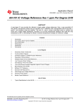 Application Report SNOA589C – June 1976 – Revised May 2013 AN-161 IC Voltage Reference Has 1 ppm Per Degree Drift ..................................................................................................................................................... ABSTRACT A new linear IC now provides the ultimate in highly stable voltage references. Now, a new monolithic IC the LM199, out-performs zeners and can provide a 6.9 V reference with a temperature drift of less than 1 ppm/C° and excellent long term stability. This new IC, uses a unique subsurface zener to achieve low noise and a highly stable breakdown. Included is an on-chip temperature stabilizer that holds the chip temperature at 90°C, eliminating the effects of ambient temperature changes on reference voltage. 1 2 3 4 5 6 Contents Introduction .................................................................................................................. 2 Sub Surface Zener Improves Stability .................................................................................... 2 Circuit Description ........................................................................................................... 3 Performance ................................................................................................................. 4 Applications .................................................................................................................. 7 Conclusions ................................................................................................................ 11 1 Subsurface Zener Construction ........................................................................................... 2 2 Functional Block Diagram .................................................................................................. 3 3 Schematic Diagram of LM199 Precision Reference.................................................................... 4 4 Polysulfone Thermal Shield................................................................................................ 5 5 Wideband Noise of the LM199 Reference ............................................................................... 5 6 Low Frequency Noise Voltage ............................................................................................ 6 7 Fast Warmup Time of the LM199 ......................................................................................... 6 8 The LM199 Shows Excellent Regulation Against Current Changes List of Figures 9 10 11 12 13 14 ................................................ Basic Biasing of the LM199................................................................................................ Buffered 10 V Reference................................................................................................... Standard Cell Replacement ............................................................................................... Wide Range Input Voltage Reference .................................................................................. Precision Power Supply .................................................................................................. Bipolar Output Reference ................................................................................................ 7 8 9 9 10 10 10 List of Tables 1 Typical Specifications for the LM199 ..................................................................................... 6 All trademarks are the property of their respective owners. SNOA589C – June 1976 – Revised May 2013 Submit Documentation Feedback AN-161 IC Voltage Reference Has 1 ppm Per Degree Drift Copyright © 1976–2013, Texas Instruments Incorporated 1 Introduction 1 www.ti.com Introduction The planar monolithic IC offers superior performance compared to conventional reference diodes. For example, active circuitry buffers the reverse current to the zener giving a dynamic impedance of 0.5 Ω and allows the LM199 to operate over a 0.5 mA to 10 mA current range with no change in performance. The low dynamic impedance, coupled with low operating current significantly simplifies the current drive circuitry needed for operation. Since the temperature coefficient is independent of operating current, usually a resistor is all that is needed. Previously, the task of providing a stable, low temperature coefficient reference voltage was left to a discrete zener diode. However, these diodes often presented significant problems. For example, ordinary zeners can show many millivolts change if there is a temperature gradient across the package due to the zener and temperature compensation diode not being at the same temperature. A 1°C difference may cause a 2 mV shift in reference voltage. Because the on-chip temperature stabilizer maintains constant die temperature, the IC reference is free of voltage shifts due to temperature gradients. Further, the temperature stabilizer, as well as eliminating drift, allows exceptionally fast warm-up over conventional diodes. Also, the LM199 is insensitive to stress on the leads—another source of error with ordinary glass diodes. Finally, the LM199 shows virtually no hysteresis in reference voltage when subject to temperature cycling over a wide temperature range. Temperature cycling the LM199 between 25°C, 150°C and back to 25°C causes less than 50 μV change in reference voltage. Standard reference diodes exhibit shifts of 1 mV to 5 mV under the same conditions. Figure 1. Subsurface Zener Construction 2 Sub Surface Zener Improves Stability Previously, breakdown references made in monolithic IC's usually used the emitter-base junction of an NPN transistor as a zener diode. Unfortunately, this junction breaks down at the surface of the silicon and is therefore susceptible to surface effects. The breakdown is noisy, and cannot give long-term stabilities much better than about 0.3%. Further, a surface zener is especially sensitive to contamination 