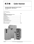 Automatic and Non-Automatic Transfer Switches Free Standing 600 – 4000 Amperes Technical Data Supersedes TD.15A.11.T.E pages 1 – 12, dated March 2001 Description Page Automatic and Non-Automatic Transfer Switches Free Standing 600 – 4000 Amperes Introduction . . . . . . . . . . . . . . . . . . . . . . . . . . . . . . . . . . . . . . . . . . . . . . . . . . . . . Design Highlights . . . . . . . . . . . . . . . . . . . . . . . . . . . . . . . . . . . . . . . . . . . . . . . . Typical Applications . . . . . . . . . . . . . . . . . . . . . . . . . . . . . . . . . . . . . . . . . . . . . . Basic Switch Components . . . . . . . . . . . . . . . . . . . . . . . . . . . . . . . . . . . . . . . . . Mini-SPB Switches . . . . . . . . . . . . . . . . . . . . . . . . . . . . . . . . . . . . . . . . . . . . . . . SPB Fixed Mount Switches . . . . . . . . . . . . . . . . . . . . . . . . . . . . . . . . . . . . . . . . SPB Drawout Switches . . . . . . . . . . . . . . . . . . . . . . . . . . . . . . . . . . . . . . . . . . . . Transfer Switch Withstand Ratings . . . . . . . . . . . . . . . . . . . . . . . . . . . . . . . . . . Power and Transformer Panels . . . . . . . . . . . . . . . . . . . . . . . . . . . . . . . . . . . . . Logic. . . . . . . . . . . . . . . . . . . . . . . . . . . . . . . . . . . . . . . . . . . . . . . . . . . . . . . . . . . Switch and Feature Selection . . . . . . . . . . . . . . . . . . . . . . . . . . . . . . . . . . . . . . Dimensions and Weights . . . . . . . . . . . . . . . . . . . . . . . . . . . . . . . . . . . . . . . . . . 2 2 3 3 4 4 4 4 5 6 7-10 10-11 TD01601001E For more information visit: www.cutler-hammer.eaton.com Technical Data Page 2 Effective: January 2003 Automatic and Non-Automatic Transfer Switches Free Standing 600 – 4000 Amperes Introduction Eaton’s Cutler-Hammer SPB Transfer Switches are designed for a variety of standby power applications for critical loads. They monitor both normal and standby power sources. In the event of a primary power source interruption, these switches will automatically transfer the load circuits to the standby power source. Once primary power has been restored, the process is automatically reversed. The SPB family of transfer switches covers applications ranging from 600 to 4000 amperes through 600 Vac, in Automatic or Non-Automatic configurations, open or closed transition, standard or service entrance. They are designed for applications where total system coordination must be accomplished while achieving a high level of Withstand, Interrupting and Closing performance. Drawout construction is available for applications, such as critical life support systems, where preventive maintenance, inspection and testing must be accomplished while maintaining continuity of power to the load. Cutler-Hammer SPB Transfer Switches meet or exceed all industry standards for endurance, reliability and performance. They are listed under Underwriters Laboratories ULT 1008 Standard for Transfer Switch Equipment. With certain options, they also comply with emergency and standby system requirements as defined in NFPA 99 for health care facilities. Design Highlights SPB Transfer Switch Family ■ Mini-SPB fixed mount 600 – 1200 amperes. ■ SPB fixed mount 800 – 4000 amperes. ■ SPB drawout 800-4000 amperes. ■ ■ Cutler-Hammer SPB Transfer Switches offer the utmost in flexibility, reliability and value. These switches must exceed many national and international standards. They are designed and built in accordance with the following: UL 1008 UL 489 Standard for Safety for Automatic Transfer Switches Standard for Circuit Breakers and Molded Case Switches NECT Articles Code Sections 517, 700, Applicable 701, 702 Switch Equipment NFPA 110 Emergency and Standby Power Systems NFPA 99 Health Care Facilities EGSA 100S Standard for Transfer Switches NEMAT ICS10 Standard for Transfer Switch Equipment UBCT Uniform Building Code for Seismic Zone 4 ISOT 9000 International Organization for Standardization CBC California Building Code IBC International Building Code BOCAT Building Officials Code Administrators. For more information visit: www.cutler-hammer.eaton.com ■ ■ ■ ■ ■ ■ ■ ■ ■ ■ ■ ■ ■ ■ ■ ■ ■ UL 1008 listed. Freestanding. SPB insulated case devices. Fastest switching times available (<5 cycles). High withstand ratings. Full 60-cycle short time withstand capability. Safe manual transfer under load. Multi-tap voltage selection plug. Integral service entrance capability. Integral overcurrent protection capability. Drawout capability. Programmable microprocessor controller with keypad entry and display. Communications capable. Durable powder-coated steel enclosures. ❑ All NEMA 1 and NEMA 12 ❑ NEMA 3R 600 – 2000 A Seismic Zone 4 Qualified (BOCA, CBC, IBC, UBC). American Bureau of Shipping qualified. ISO 9001 designed. ISO 9002 manufactured. ISO 14001 manufacturing facility. TD01601001E Automatic and Non-Automatic Transfer Switches Free Standing 600 – 4000 Amperes Technical Data Effective: January 2003 Page 3 Typical Applications Utility — Generator Generator — Generator Service Entrance Equipment Transfer switches are traditionally applied between a utility and a generator set for emergency and standby power systems. Transfer switches are sometimes applied between two generator sets for prime power use, often in remote installations. In such applications, source power is periodically alternated between the generator sets to equally share run time between the two. Often, it is desirable to apply the transfer switch as a service equipment device thereby eliminating the need for separate service disconnects and overcurrent protective devices. This switch is particularly adaptable to wastewater and water treatment plants, pumping stations, industrial plants, telecommunications facilities and other installations where all the loads are critical in nature and need to be backed up by an alternate power source. 