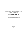 ELECTRICAL ENGINEERING DEPARTMENT REPORT FORMATS University of Wisconsin – Platteville Sixth Edition 2015 1 TABLE OF CONTENTS Introduction . . . . . . . . . . . . . . . . . . . . . . . . . . . . . . . . . . . . . . . . . . . . . . . . . . . . . . . . . . . . . . . . . . . . . . . 2 Formal Reports . . . . . . . . . . . . . . . . . . . . . . . . . . . . . . . . . . . . . . . . . . . . . . . . . . . . . . . . . . . . . . . . . . . . . 3 Informal Reports . . . . . . . . . . . . . . . . . . . . . . . . . . . . . . . . . . . . . . . . . . . . . . . . . . . . . . . . . . . . . . . . . . . . 5 IEEE-Format Reports . . . . . . . . . . . . . . . . . . . . . . . . . . . . . . . . . . . . . . . . . . . . . . . . . . . . . . . . . . . . . . . . 7 General Information . . . . . . . . . . . . . . . . . . . . . . . . . . . . . . . . . . . . . . . . . . . . . . . . . . . . . . . . . . . . . . . . 8 Common Grammatical Errors . . . . . . . . . . . . . . . . . . . . . . . . . . . . . . . . . . . . . . . . . . . . . . . . . . . . . . . . . 13 First edition released August 2009. Second edition, released August 2010, added format and grammar details from Turabian. Third edition, released March 2011, elaborated on figure and table numbering and figure and table citing, and updated the links to the IEEE Style Manual and the IEEE Author Digital Toolbox. Fourth edition, released August 2011, added information on equation formatting and numbering, and updated the URLs of IEEE format guidelines. Fifth edition, released June 2012, simplified the citation of URLs and class notes, and clarified the citation of figures and tables in appendices and attachments. Sixth edition, released February 2015, updated links to templates. 2 Introduction Technical reports are written for two different audiences: 1. Managers, who want to know (in as few words as possible, and without searching the entire report for the information): a. What was done and why; b. Whether or not the project was successful (e.g., were the project goals achieved); c. Whether or not cost and time constraints were met, and by how much; d. Anything else important enough to call to the attention of management. 2. Engineers, scientists, and technicians, who want to know (in sufficient detail so that they can duplicate the work): a. How it was done (including how unexpected problems were overcome); b. How the circuit/system/product performs its intended function. 3 Formal Reports A formal report contains the following: 1. Title Page: includes the title of the project/report, to whom the report is submitted, by whom it is prepared, the date it is written (not the date the report is due!), and the abstract. (An example title page is shown on the next page.) 2. Abstract: a short paragraph indicating what the project was and what solution was found. 3. Table of Contents: contains page numbers of the titles and subtitles of different sections of the report. 4. Introduction: a brief description of the problem, how it was approached, and what procedure was used to solve it. It may also give the reader some information on what was done in the sections following the introduction (for longer reports). 5. Development: describes the details of the methods, procedures, techniques, etc., used in solving the problem. This section usually has subsections such as model development, calculations, experimental procedure, applications, etc. 6. Discussion: a discussion of the findings and any discrepancies. 7. Conclusion and Suggestions: This section is a brief summary of what the findings were and what the significance of the work is. If it is a research project, it also contains suggestions about future research areas. 8. References: This is a list of the books, reports, papers, Internet sources, and computer software that were used to complete the project and write the report. All references listed must be cited in the report; if no references are cited, don’t list any. References are listed in the same order in which they were first cited. 9. Appendices: Any method or tool which is not the primary concern of the research or project but is used in the project can be put into an appendix. Listings of computer code developed and used to solve a problem usually go in an appendix unless the purpose of the project is the development of the program itself (in which case the listing belongs in the body of the report). If the output of a computer program (e.g., SPICE or POWERWORLD output) is not discussed in the body of the report, then that output should not be placed in the appendix. Appendices are numbered (or lettered) and are attached to the end of the report in numerical (or alphabetical) order. The order must be the same as the order in which the appendices were first cited in the report. All appendices must be cited by number (or letter) in the text of the report. Click here to download a formal-report template in MS Word format. The title is 16- to 18-point bold font in all capitals. FUSION REACTOR DESIGN All other material on the title page is in the same font as used for the body of the report. For group reports, list authors alphabetically by last name. Orville Klutz Harvey Mudslinger EE 4450: Power Systems May 12, 2008 The word Abstract is in bold font. Abstract: A fusion reactor was designed, built, and tested. Helium-3 was used for fuel because another design group cornered the market on deuterium in Platteville. The reaction was contained by the magnetic field from a 6-T magnet borrowed from the MRI machine at the Southwest Medical Center. The calculated output-power level was 22.3 MW, but the measured output power was only 2.5 MW for five minutes, after which the reactor overheated and melted through the floor of the Power Laboratory. That’s why the reactor was unavailable for project checkoff. The authors believe that the lava flow that erupted from the Power Laboratory and covered the UW-Platteville campus is sufficient proof that the reactor (1) was actually built