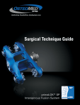 Surgical Technique Guide Description The OsteoMed Spine PrimaLOK™ SP Interspinous Fusion System is intended to provide immobilization and stabilization of spinal segments as an adjunct to fusion of the thoracic, lumbar and/or sacral spine. PrimaLOK SP is a bilateral locking plate system which attaches to the posterior non-cervical spine at the spinous processes. It is available in various heights and widths to accommodate differing anatomic requirements. Surgical procedures appropriate for use with PrimaLOK SP include, but are not limited to: • Supplemental fixation for Anterior Lumbar Interbody Fusion (ALIF), Transforaminal Lumbar Interbody Fusion (TLIF), Lateral Lumbar Interbody Fusion (LLIF), Posterior Lumbar Interbody Fusion (PLIF), Posterior Lateral Fusion (PLF) and lumbar facet screw procedures. • Supplemental fixation for failed fusion revision and hybrid constructs Indications for Use The PrimaLOK SP Interspinous Fusion System is a posterior, non-pedicle supplemental fixation device, intended for use in the non-cervical spine (T1-S1). It is intended for plate fixation/attachment to the spinous process for the purpose of achieving supplemental fusion in the following conditions: degenerative disc disease (defined as back pain of discogenic origin with degeneration of the disc confirmed by history and radiographic studies), spondylolisthesis, trauma (i.e., fracture or dislocation), and/or tumor. The PrimaLOK SP Interspinous Fusion System is intended for use at one level, with bone graft material, and not intended for stand-alone use. For additional information, warnings and contraindications, please refer to the Product Insert. TABLE OF CONTENTS Product Labeling Description Indications for Use Inside Cover Design Rationale Surgical Technique Rethinking Fixation 1 Design Features and Clinical Benefits 2 Access and Preparation Patient Positioning 3 Distraction 4 Rasping 5 Sizing 5 Sterile Packaging 6 Bone Graft 6 Inserting the Implant General Notes and Cautions 7 Technique 1 8 Technique 2 10 Technique 3 13 Removing the Implant Product Information Removal 16 Implant Anatomy 17 Implant Catalog 17 Instruments 18 Access Instruments 18 Preparation Instruments 18 Insertion Instruments 19 DESIGN RATIONALE RETHINKING FIXATION Rethinking lumbar fixation in a fresh new way inspired the design of the OsteoMed Spine PrimaLOK™ SP Interspinous Fusion System. PrimaLOK SP is a next generation posterior lumbar spinous process fixation device. Patent-pending polyaxial technology provides for optimal placement and enhanced fixation to accommodate anatomic variations with minimal disruption to anatomy. These unique features, combined with easy-to-use instrument options for a variety of surgical approaches, result in a streamlined fixation solution tailored to the needs of surgeons and patients. Taper locking feature delivers easy-tosecure locking force Ample graft window with anterior floor for supplemental bone graft placement 1 Polyaxial plate and locking grips conform to unique bony anatomy and maximize surface contact area for secure fixation www.osteomed.com DESIGN FEATURES Full Polyaxial Design • 4 independent grips/feet • Multi-directional polyaxial plate • 45 degrees of combined grip/plate range of motion Gripping Spikes • 4 grips that independently orient to anatomy • Total of 28 conical spikes (7 per grip) • 1.6mm spike length Locking Mechanism • 6 Morse taper locks • Provisional and final locking steps • 300 pounds of compressive force applied to the implant at final lock Graft Window • Integrated window contains approximately .5 2+cc of graft material • Anterior window floor Implant Sizes and Sterile Packaging • 7 sizes from 4mm to 18mm • Central post comes in 2 sizes: 25mm standard, 30mm optional • Implants supplied in double peel-pack sterile package that serves as implant loading caddy and allows for placement of the inner tray into the sterile field www.osteomed.com CLINICAL BENEFITS • Accommodates natural variations in anatomy and challenging anatomy • Enables ideal anterior placement where bone quality is best at spinous process/lamina junction • Ideal for placement at L5-S1 • Greater load distribution across each spike provides enhanced fixation while minimizing disruption to spinous process (SP) and reducing fracture risk • Optimal length and number of spikes designed to minimize force concentrations and avoid SP fracture, especially where SP thickness varies • Ability to reposition if necessary before final locking • Locking features designed to minimize risk of implant malfunctions • Generous graft window can be easily packed with bone graft for supplemental SP fusion • Window floor adds stability and enhances graft containment • Multiple sizes accommodate variations in patient anatomy and surgical requirements • Sterile packaging maintains implant quality and enhances O.R. speed and ease-of-use 2 SURGICAL TECHNIQUE ACCESS AND PREPARATION Patient Positioning Position the patient in a prone position on a radiolucent table. Ensure adequate clearance around the surgical table for movement of the fluoroscopic C-arm. Identify the spinous process at the desired level through manual palpation and intraoperative imaging. Make a midline incision approximately 3-5 cm in length to expose the spinous processes at the operative level. Elevate the paraspinous musculature and adjoining soft tissue to expose the spinous processes and lamina. Removal of the supraspinous ligament is recommended to allow for sizing, distraction, and placement of the implant. Removing excess soft tissue and osteophytes on the lateral aspects of the spinous processes may be necessary to allow for optimal placement and fixation of the implant grips to the spinous processes. Caution: If performing a decompression, be careful to avoid removing excessive bone that may compromise the integrity of the spinous processes at the operative level. 3 www.osteomed.com ACCESS