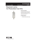 BUSSMANN Technical Data 10201 Effective January 2016 Supersedes September 2015 SERIES Bussmann series XL Photovoltaic fuse links Product description Eaton’s Bussmann series XL package fuse links are specifically designed to protect and isolate photovoltaic array combiners and disconnects. These fuse links are capable of interrupting low overcurrents associated with faulted PV systems (reverse current, multi-array fault). Standard features • Global accreditations • Compatible with Eaton’s Bussmann series PV XL bases range (see data sheet 10066) Technical Data 10201 Effective January 2016 Catalogue symbol 1000 V d.c.: Bladed PV-(amp rating)A-(size)XL Bolted PV-(amp rating)A-(size)XL-B Bolted PV-(amp rating)A-2XL-3B1 1500 V d.c: Bladed PV-(amp rating)A-(size)XL-15 Bolted PV-(amp rating)A-(size)XL-B-15 Bolted PV-(amp rating)A-2XL-3B-151 Fuse size • 01XL, 1XL, 2XL and 3L Technical data Rated voltage: 1000, 1100, 1200, 1500 V d.c. Rated current: 50 to 600 A Breaking capacity: • 1000 V d.c. • Size 01 and 3: 50kA • • Size 1 and 2: 33kA 1500 V d.c. : 30kA Time constant: 1-3 mS Class of operation: gPV and UL PV fuse links Minimum interrupting rating: 2 x In Standards/Approvals • IEC 60269-6 • UL 2579 (file number E335324) • RoHS compliant Microswitches • • For bladed fuse links • 170H0235 or 170H0237 for 01XL • 170H0236 or 170H0238 for 1XL, 2XL and 3L For bolted fuse links • 170H0069 for all sizes Fuse holders (ordered separately) • SB1XL-S (suitable for size 01 and 1XL) • SB2XL-S (suitable for 2XL) • SB3L-S (suitable for 3L) Packaging • MOQ: 1 1 PV-*A-2XL-3B and PV-*A-2XL-3B-15 have revised bolting patterns, which are identical to size 3L bolting pattern. This allows utilisation of both size 2XL and size 3L fuse links without changing the dimensional layout of the inverter, combiners and disconnects. 2 EATON www.eaton.com Bussmann series XL Photovoltaic fuse links Bussmann series XL Photovoltaic fuse links Technical Data 10201 Effective January 2016 Table 1. Technical data 1000 V d.c. Energy integrals Watts loss I2t (A2S) Catalogue numbers Bladed Bolted Fuse size Current (amps) Voltage (V d.c.) Prearcing Total at 1000V 0.8In In PV-63A-01XL PV-80A-01XL PV-100A-01XL PV-125A-01XL PV-160A-01XL PV-200A-1XL PV-160A-2XL PV-200A-2XL PV-250A-2XL PV-315A-2XL PV-355A-2XL PV-63A-01XL-B PV-80A-01XL-B PV-100A-01XL-B PV-125A-01XL-B PV-160A-01XL-B PV-200A-1XL-B PV-160A-2XL-B PV-200A-2XL-B PV-250A-2XL-B PV-315A-2XL-B PV-355A-2XL-B PV-160A-2XL-3B1 PV-200A-2XL-3B1 PV-250A-2XL-3B1 PV-315A-2XL-3B1 PV-355A-2XL-3B1 PV-350A-3L-B PV-400A-3L-B PV-500A-3L-B PV-600A-3L-B 01 01 01 01 01 1 2 2 2 2 2 2 2 2 2 2 3 3 3 3 63 80 100 125 160 200 160 200 250 315 355 160 200 250 315 355 350 400 500 600 1000 1000 1000 1000 1000 1000 1000 1000 1000 1000 1000 1000 1000 1000 1000 1000 1000 1000 1000 1000 260 490 870 1930 3900 9400 2780 4950 9450 16600 26000 2780 4950 9450 16600 26000 31000 44500 85000 137000 1900 3600 6300 13900 28100 27260 21000 37000 70000 123000 192000 21000 37000 70000 123000 192000 161200 231400 442000 712400 13 17 18 20 22 31 25 28 34 40 42 25 28 34 40 42 40 48 50 80 24 29 32 40 44 60 44 50 60 66 68 44 50 60 66 68 65 82 85 108 PV-350A-3L PV-400A-3L PV-500A-3L PV-600A-3L Table 2. Technical data 1500 V d.c. Catalogue numbers Bladed Bolted Fuse size Current (amps) PV-50A-01XL-15 PV-63A-01XL-15 PV-80A-01XL-15 PV-100A-01XL-15 PV-125A-01XL-15 PV-160A-01XL-12 PV-100A-1XL-15 PV-125A-1XL-15 PV-160A-1XL-15 PV-200A-1XL-15 PV-125A-2XL-15 PV-160A-2XL-15 PV-200A-2XL-15 PV-250A-2XL-15 PV-50A-01XL-B-15 PV-63A-01XL-B-15 PV-80A-01XL-B-15 PV-100A-01XL-B-15 PV-125A-01XL-B-15 PV-160A-01XL-B-15 PV-100A-1XL-B-15 PV-125A-1XL-B-15 PV-160A-1XL-B-15 PV-200A-1XL-B-15 PV-125A-2XL-B-15 PV-160A-2XL-B-15 PV-200A-2XL-B-15 PV-250A-2XL-B-15 PV-125A-2XL-3B-151 PV-160A-2XL-3B-151 PV-200A-2XL-3B-151 PV-250A-2XL-3B-151 PV-250A-3L-B-15 PV-315A-3L-B-15 PV-355A-3L-B-15 PV-400A-3L-B-15 01 01 01 01 01 01 1 1 1 1 2 2 2 2 2 2 2 2 3 3 3 3 50 63 80 100 125 160 100 125 160 200 125 160 200 250 125 160 200 250 250 315 355 400 PV-250A-3L-15 PV-315A-3L-15 PV-355A-3L-15 PV-400A-3L-15 Energy integrals I2t (A2S) Watts loss Voltage (Vdc) Prearcing Total at 1500V 0.8In In 1500 1500 1500 1500 1500 1200 1500 1500 1500 1500 1500 1500 1500 1500 1500 1500 1500 1500 1500 1500 1500 1500 175 362 565 1100 2200 5000 1250 1950 4200 9400 2200 5000 8800 16600 2200 5000 8800 16600 22300 38000 44500 58000 1000 2250 3300 6600 10500 24000 6000 9360 20160 45120 15000 32000 51000 85000 15000 32000 51000 85000 92000 160000 184000 240000 14 15 19 22 23 26 24 25 30 31 25 29 32 40 25 29 32 40 32 36 44 49 25 26 35 40 42 52 43 52 58 61 44 48 57 70 44 48 57 70 50 66 80 91 1 PV-*A-2XL-3B and PV-*A-2XL-3B-15 have revised bolting patterns, which are identical to size 3L bolting pattern. This allows utilisation of both size 2XL and size 3L fuse links without changing the dimensional layout of the inverter, combiners and disconnects. EATON www.eaton.com 3 Technical Data 10201 Bussmann series XL Photovoltaic fuse links Effective January 2016 Dimensions - mm Bladed - size 01XL 127 3 Top indicator 46.5 MAX 6 189 3 46.5 MAX 8.9±0.3 129 3 21.3 40.4±0.3 20 MIN 120 3 Bladed - size 1XL 123,5±3 120±3 20 128±3 6 EATON www.eaton.com 52.0 MAX 52.0 MAX 189±3 4 40.8 MAX 20 MIN. TOP INDICATOR Technical Data 10201 Bussmann series XL Photovoltaic fuse links Effective January 2016 Dimensions - mm Bladed - size 2XL 123.0 3.0 Top indicator 117.0 3.0 16.5 MAX 25 MIN 61 MAX 48±0.8 20.0 130 MAX 6 205.0 3.0 60 MAX Bladed - size 3L 122.0±2.0 118.0±2.0 22.0 127.0±3.0 6.0 205.0±2.0 CL 5 EATON www.eaton.com 75.0 MAX CL 18.0 MAX 32 MIN 60.8 MAX TOP INDICATOR 75.0 MAX Bussmann series XL Photovoltaic fuse links Technical Data 10201 Effective January 2016 Dimensions - mm Bolted - size 01XL MAX 60.0 45.0±1.5 6.0 Adapter 131 MAX 45.0±1.5 10.4±0.3 20±0.3 187,2±2.0 149,8±1.6 163,8±2.0 Bolted - size 1XL EATON www.eaton.com 6 Technical Data 10201 Bussmann series XL Photovoltaic fus