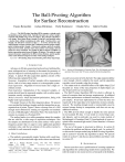1 The Ball-Pivoting Algorithm for Surface Reconstruction Fausto Bernardini Joshua Mittleman Holly Rushmeier Cláudio Silva Gabriel Taubin Abstract—The Ball-Pivoting Algorithm (BPA) computes a triangle mesh interpolating a given point cloud. Typically the points are surface samples acquired with multiple range scans of an object. The principle of the BPA is very simple: Three points form a triangle if a ball of a user-specified radius touches them without containing any other point. Starting with a seed triangle, the ball pivots around an edge (i.e. it revolves around the edge while keeping in contact with the edge’s endpoints) until it touches another point, forming another triangle. The process continues until all reachable edges have been tried, and then starts from another seed triangle, until all points have been considered. We applied the BPA to datasets of millions of points representing actual scans of complex 3D objects. The relatively small amount of memory required by the BPA, its time efficiency, and the quality of the results obtained compare favorably with existing techniques. Keywords—3D scanning, shape reconstruction, point cloud, range image. I. I NTRODUCTION Advances in 3D data-acquisition hardware have facilitated the more widespread use of scanning to document the geometry of physical objects for archival purposes or as a step in new product design. A typical 3D data acquisition pipeline consists of the following steps (adapted from [1]): Scanning: Acquisition of surface samples with a measurement device, such as a laser range scanner or a stereographic system. Data registration: Alignment of several scans into a single coordinate system. Data integration: Interpolation of the measured samples, or points derived from the measured samples, with a surface representation, usually a triangle mesh. Model conversion: Mesh decimation/optimization, fitting with higher-order representations etc. This paper focuses on the data integration phase. We present a new method for finding a triangle mesh that interpolates an unorganized set of points. Figure 1 shows a closeup view of a 14M triangle mesh obtained by running our algorithm on hundreds of scans of Michelangelo’s Florentine Pietà. The model took 30 minutes to compute on a Pentium II PC. The method makes two mild assumptions about the samples that are valid for a wide range of acquisition techniques: that the samples are distributed over the entire surface with a spatial frequency greater than or equal to some application-specified minimum value, and that an estimate of the surface normal is available for each measured sample. A. Main Contributions The method is conceptually simple. Starting with a seed triangle, it pivots a ball around each edge on the current mesh boundIBM T. J. Watson Research Center, P.O. Box 704, Yorktown Heights, NY 10598. email: fausto, mittle, holly, taubin @watson.ibm.com Claudio Silva’s current address: AT&T Labs-Research, Shannon Laboratory, 180 Park Avenue, Florham Park, NJ 07932-0971. csilva@research.att.com g f Fig. 1. Section of Michelangelo’s Florentine Pietà. This 14M triangle mesh was generated from more than 700 scans using the ball pivoting algorithm. ary until a new point is hit by the ball. The edge and point define a new triangle, which is added to the mesh, and the algorithm considers a new boundary edge for pivoting. The output mesh is a manifold subset of an alpha-shape [2] of the point set. Some of the nice properties of alpha-shapes can also be proved for our reconstruction. The Ball Pivoting Algorithm (BPA for short) is efficient in terms of execution time and storage requirements. It exhibited linear time performance on datasets consisting of millions of input samples. It has been implemented in a form that does not require all of the input data to be loaded into memory simultaneously. The resulting triangle mesh is incrementally saved to external storage during its computation, and does not use any additional memory. The BPA proved robust enough to handle the noise present in real scanned 3D data. It was tested on several large scanned datasets, and in particular was used to create models of Michelangelo’s Florentine Pietà [3] from hundreds of scans acquired with a structured light sensor (Visual Interface’s Virtuoso ShapeCamera). The rest of the paper is structured as follows: In section II we define the problem and discuss related work. In section III we discuss the concepts underlying the Ball-Pivoting Algorithm, and in section IV describe the algorithm in detail. We present results in section V, and discuss open problems and future work in section VI. II. BACKGROUND Recent years have seen a proliferation of scanning equipment and algorithms for synthesizing models from scanned data. We refer the reader to two recent reviews of research in the field [4], 2 [5]. In this section we focus on the role interpolating meshing schemes can play in scanning objects, and why they have not been used in practical scanning systems. A. Interpolating Meshes in Scanning Systems We define the scanning problem: Given an object, find a continuous representation of the object surface that captures features of a length scale 2d or larger. The value of d is dictated by the application. Capturing features of scale 2d requires sampling the surface with a spatial resolution of d or less. The surface may consist of large areas that can be well approximated by much sparser meshes; however in the absence of a priori information we need to begin with a sampling resolution of d or less to guarantee that no feature is missed. We consider acquisition systems that produce sets of range images, i.e. arrays of depths, each of which covers a subset of the full surface. Because they are height fields with regular sampling, individual range images are easily meshed. The individual meshes can be used to compute an estimated surface normal for each sample point. An ideal acquisition system would r