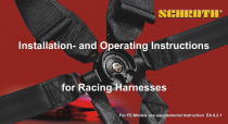 Installation- and Operating Instructions for Racing Harnesses For FE-Models see supplemental Instruction EA 8.2.1 CONTENT WARNINGS AND SEVERALS 1 WAIVER and General Information Rules and Regulations HOMOLOGATIONS Definitions Homologations The asm® Safety System Racing Harness Models ANCHORAGE LOCATIONS AND GEOMETRIES - 3 RESTRAINT INSTALLATION 33 - 56 - 2 3 Initial Harness Adjustment during Installation Wrap systems and Installations 34 33 - 40 4 - 16 5 7 9 4 - 7 - 8 - 16 17 - 28 Belt routing 17 What happens during a frontal impact? 18 - 20 Lap-, Shoulder- and Anti-sub strap routing 21 - 24 24 - 28 Specifics for 5-Point, 6-Point, Formula and HYBRID Models IMPORTANT INFORMATION ABOUT BOLTS AND TORQUES 29 - 32 Bolts and Torques Creating a new Attachment Point About Seats 29 30 - 30 - 31 32 “Flexi Belt™” 41 Double bar [Lap Belt] 42 Bracket and End Loop Installations 43 - 56 OPERATION 57 - 64 Wearing your Racing Harness safe How to release your Racing Harness 57 - 63 64 CARE AND MAINTENANCE 65 - 67 Examples of Wrong Installations ACCESSORIES AND SPARE PARTS / PATENTS / COPYRIGHTS - 67 68 - 70 T H I S M AN U AL C O N T AI N S I M P O R T AN T I N F O R M AT I O N THIS MANUAL CONTAINS IMPORTANT INFORMATION SHOWN AS S H O W N AS WARNINGS deal with important issues about installation, use, misuse or modification of the SCHROTH racing harness. SAFETY INSTRUCTIONS contain important hints to help you to install, use and maintain the SCROTH Racing Harness properly and effectively Ignoring these Warnings will significantly reduce the performance of the racing harness system. This can result in serious personal injury or death during an accident. Always read carefully and follow the information in this manual, especially those highlighted as above. -1- ABOUT THE IMPORTANCE OF THIS MANUAL ! SCHROTH has attempted to make this racing harness manual extensive and comprehensive. We have created it to help the reader understand racing harness installation, use and maintenance, and how it relates to safety in motorsports. Intensive research and experience in motorsports has led us to prepare up-to-date instructions for optimized anchor point locations and racing harness design features. The SCHROTH development of new racing harness configurations should be considered when defining anchorage locations. What was considered acceptable in the early and mid-1990s has changed and evolved as the result of currently available data. Therefore, we ask the drivers, mechanics, teams and race car manufacturers to read and heed the information in this manual carefully. Safe and effective HANS® use also depends on HANS® specific restraint routing and anchor point locations. This harness belt, when properly installed and used according to applicable instructions can minimise injury. The ability of any restraint system to minimise or prevent injuries is directly related to the type and severity of accident. No restraint system can prevent injury or death in every accident. PROFI and HYBRID racing harness belts are NOT designed to be installed into street legal vehicles, and DO NOT meet federal and state vehicle safety regulations. They are designed and tested to be used exclusively in race cars and only in on-track events. Only PROFI-FE asm® models are intent for Rally sport and street legal use and carry either the ECE-R 16 approval label for Europe or sets forth the following language for the USA: “meets the applicable provisions of FMVSS 209”. It will also carry the FIA homologation label. “This article is sold without warranty, express or implied, including but not limited to the implied warranties of merchantability and fitness for a particular purpose, all of which are specifically disclaimed, and no warranty or representation is made as to this product’s capability to protect the user from any injury or death. Racing is dangerous! The user assumes the risk “The sanctioning body regulating the motorsport series in which you are participating may have additional information specific to your chassis. All information in this document is based upon the best knowledge as of June 2004.” -2- R ULES AND Always heed all WARNING and SAFETY INSTRUCTION boxes. Always read and heed all instructions in this manual carefully. Failure to follow WARNING, SAFETY INSTRUCTIONS and all other instructions could result in severe personal injuries and death. R EGUL ATION S This manual contains important information about installation and use of your new harness belt. Read this manual thoroughly and understand the content before attempting installation. Knowledge gained from extensive testing and accident analysis has increased significantly over the past years so it is important to read and follow the instructions given in this manual, even if you have installed harness belts previously. These instructions represent state-of-the-art knowledge at the time of issuance of this manual, the date of which is set forth on its cover. All instructions are in accordance with current FIA, NASCAR, CART, SCCA and other sanctioning body regulations, as individually indicated in the text. Deviating from these instructions may result in rejection from participation in motorsport events. Regulations may change with short notice and may not be incorporated into these instructions at the date of purchase. Keep yourself up-dated about the latest regulations for the motorsport in which you are participating. Latest information can also be obtained from the SCHROTH website www.schroth.com I N T E ND E D U SE , D E FI NI TI O NS AND L ABE LL I NG PROFI and HYBRID racing harnesses, except for PROFI-FE models, and are not approved or intended for use on public roads or off-road. They are designed and approved only for closed circuit race tracks. For legal street use, SCHROTH offers special United States Department of Transportation approved models (FE-models). NEVER use unapproved PROFI and HYBRID racing harnesses on public roads or off-road. Th