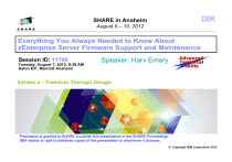 SHARE in Anaheim August 5 – 10, 2012 Everything You Always Needed to Know About zEnterprise Server Firmware Support and Maintenance Session ID: 11786 Tuesday, August 7, 2012, 9:30 AM Salon E/F, Marriott Anaheim Speaker: Harv Emery Permission is granted to SHARE to publish this presentation in the SHARE Proceedings. IBM retains its right to distribute copies of this presentation to whomever it chooses. ©2011 IBM Corporation © Copyright IBM Corporation 2012 IBM System z Firmware Support and Maintenance Trademarks The following are trademarks of the International Business Machines Corporation in the United States, other countries, or both. Not all common law marks used by IBM are listed on this page. Failure of a mark to appear does not mean that IBM does not use the mark nor does it mean that the product is not actively marketed or is not significant within its relevant market. Those trademarks followed by ® are registered trademarks of IBM in the United States; all others are trademarks or common law marks of IBM in the United States. For a complete list of IBM Trademarks, see www.ibm.com/legal/copytrade.shtml: *BladeCenter®, DB2®, e business(logo)®, DataPower®, ESCON, eServer, FICON, IBM®, IBM (logo)®, MVS, OS/390®, POWER6®, POWER6+, POWER7, Power Architecture®, S/390®, System p, System p5, System x, System z, System z9®, System z10®, WebSphere®, X-Architecture®, zEnterprise®, z9®, z10, z/Architecture®, z/OS®, z/VM®, z/VSE, zSeries® The following are trademarks or registered trademarks of other companies. Adobe, the Adobe logo, PostScript, and the PostScript logo are either registered trademarks or trademarks of Adobe Systems Incorporated in the United States, and/or other countries. Cell Broadband Engine is a trademark of Sony Computer Entertainment, Inc. in the United States, other countries, or both and is used under license therefrom. Java and all Java-based trademarks are trademarks of Sun Microsystems, Inc. in the United States, other countries, or both. Microsoft, Windows, Windows NT, and the Windows logo are trademarks of Microsoft Corporation in the United States, other countries, or both. Intel, Intel logo, Intel Inside, Intel Inside logo, Intel Centrino, Intel Centrino logo, Celeron, Intel Xeon, Intel SpeedStep, Itanium, and Pentium are trademarks or registered trademarks of Intel Corporation or its subsidiaries in the United States and other countries. UNIX is a registered trademark of The Open Group in the United States and other countries. Linux is a registered trademark of Linus Torvalds in the United States, other countries, or both. ITIL is a registered trademark, and a registered community trademark of the Office of Government Commerce, and is registered in the U.S. Patent and Trademark Office. IT Infrastructure Library is a registered trademark of the Central Computer and Telecommunications Agency, which is now part of the Office of Government Commerce. * All other products may be trademarks or registered trademarks of their respective companies. Notes: Performance is in Internal Throughput Rate (ITR) ratio based on measurements and projections using standard IBM benchmarks in a controlled environment. The actual throughput that any user will experience will vary depending upon considerations such as the amount of multiprogramming in the user's job stream, the I/O configuration, the storage configuration, and the workload processed. Therefore, no assurance can be given that an individual user will achieve throughput improvements equivalent to the performance ratios stated here. IBM hardware products are manufactured Sync new parts, or new and serviceable used parts. Regardless, our warranty terms apply. All customer examples cited or described in this presentation are presented as illustrations of the manner in which some customers have used IBM products and the results they may have achieved. Actual environmental costs and performance characteristics will vary depending on individual customer configurations and conditions. This publication was produced in the United States. IBM may not offer the products, services or features discussed in this document in other countries, and the information may be subject to change without notice. Consult your local IBM business contact for information on the product or services available in your area. All statements regarding IBM's future direction and intent are subject to change or withdrawal without notice, and represent goals and objectives only. Information about non-IBM products is obtained Sync the manufacturers of those products or their published announcements. IBM has not tested those products and cannot confirm the performance, compatibility, or any other claims related to non-IBM products. Questions on the capabilities of non-IBM products should be addressed to the suppliers of those products. Prices subject to change without notice. Contact your IBM representative or Business Partner for the most current pricing in your geography. 2 SHARE 119 in Anaheim August 7, 2012 © Copyright IBM Corporation 2012 IBM System z Firmware Support and Maintenance What is System z Firmware and How is it Released? System z firmware is Licensed Internal Code (LIC) including microcode, millicode and just plain code that runs in various system components including the HMC and SE Firmware is released in sets called “Drivers” that define a specific machine level of function and feature support that usually corresponds to an announcement letter. Driver level must be upgraded to a higher level to get newly announced support 3 Machine Machine Type Driver Release Date Current Support SE, HMC LIC Version z114 GA, z196 GA2 2818, 2817 93G 9/2011 Full 2.11.1 z196 GA 2817 86E 9/2010 Reduced 2.11.0 z10 BC GA2, EC GA3 2098, 2097 79F 12/2009 Full 2.10.2 z10 BC GA, EC GA2 2098, 2097 76D 10/2008 None 2.10.1 z10 EC GA 2097 73G 2/2008 None 2.10.0 z9 BC GA2,9 EC GA3 2096, 2094 67L 5/2007 Full 2.9.2 z9 BC GA, EC GA2 2096, 2094 64X 4