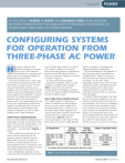 Feature POWER IN THIS ARTICLE ROBERT V. WHITE AND ANDREAS STIEDL FROM EMERSON NETWORK POWER REVIEW TWO MAIN WAYS OF PROVIDING THE REQUISITE DC POWER FROM THREE-PHASE AC POWER SOURCES CONFIGURING SYSTEMS FOR OPERATION FROM THREE-PHASE AC POWER H igh power computing and networking systems are not new. What is new is that more and more of these systems are requiring more power than can be easily provided by a single-phase ac power feed. This article reviews the two main ways of providing the requisite dc power from three-phase ac power sources. The first uses true three-phase ac-input power supplies, while the second, more common method, uses three single-phase ac-input power supplies with paralleled dc outputs and with their inputs wired to present a balanced load to the three-phase ac power source. This method allows the use of low cost single-phase ac input power supplies, but demands that a choice be made between simple hardware with complex installation, or more complex hardware with simple installation. THREE-PHASE CONFIGURATIONS There are many different configurations of three-phase ac power sources around the world. The two main configurations – the delta connection and the wye, or star, connection – are illustrated in Figures 1 and 2. Delta configurations generally do not have a neutral connection and the protective earth is separate from the phase leads. There are a number of variations, including phases that are centre-tapped to form a neutral line, and open delta configurations where only two of the three phases are powered. Wye configurations typically include a neutral line (N) connected to the common www.electronicsworld.co.uk point (3 phase plus neutral for a total of four wires). In addition, the common point of the three phases is connected to protective earth (PE) ground to form a five-wire connection (3 phases, N, and PE) as shown in Figure 2. As well as the numerous phase configuration variations, there is a wide variation in available mains voltages. Table 1 shows the most common configurations of three-phase ac power that are of interest to OEM manufacturers serving the global market. TRUE THREE-PHASE POWER SUPPLIES The simplest means of configuring a system to operate from three-phase ac power is to use a power supply with a true three-phase input. In this case, we are talking about power supplies with active power factor correction of the input currents and not a simple six pulse rectifier input. Figure 3 shows a conceptual diagram of the type of threephase input ac-dc power supply typically used in computing, networking and telecommunications applications. One key advantage to this approach is that the input power connections are straightforward – Phase A connects to one input terminal, Phase B to another and Phase C to the third. Other advantages include the fact that the input currents are always well balanced across the three phases and it is easy to do configure systems for operation from redundant ac power feeds, as well as for N+N redundancy. In spite of these advantages, true threephase input power supplies are not very common, primarily due to their high cost and complexity. One source of complexity is the control scheme needed to control the six switches to ensure that sinusoidal input currents are maintained on all three phases. For single-phase input ac-dc power supplies there are many simple and low-cost control ICs, some with a price as low as $0.15 in high volumes. These devices are easy to use and do not require Table 1: Typical three-phase ac power configurations Electronics World - April 08 ❙ 25 POWER Feature Figure 1: Three-phase delta connection without Fi neutral1wire Thand separate h d lt protective earth connection advanced control or programming knowledge to use them effectively. Unfortunately, no such ICs exist today for three-phase input power supplies. Most controllers for three-phase input power supplies are DSP-based solutions that cost at least $2.00. Another consideration is component cost. Looking at Figure 3, we see that VCAP, the voltage at the output of the power factor correction stage, is sqrt (2) x Vphase-to-phase. For operation from the120/208Vac wye configuration that is common in North America, this is not a problem, because VCAP would only need to be a little more than 300Vdc. However, for operation from the 230/400Vac that is common in much of the rest of the world, VCAP must be 600Vdc or more for proper operation of the power factor correction. This is a problem because the capacitors, MOSFETs and other components rated for operation above 600V are not commonly used in the industry and, therefore, incur a cost penalty. This cost penalty is compounded by the fact that high power equipment needing three-phase input is often produced in relatively low volumes – from a few hundred to a few thousand systems per year. Another disadvantage is the loss of output power capability when power from a single input phase is lost. In this case, the power supply is effectively operating from a single phase. The output power that can be delivered to the load is reduced to one third the normal value. This is true of any arrangement of power 26 ❙ April 08 - Electronics World Figure 2: Three-phase wye connection with neutral and protective earth wires supplies that operate with a delta input. These disadvantages – mainly the extra complexity and higher cost – have led system OEMs to generally adopt another approach to power systems from threephase ac power. With the need for higher power supplies increasing, ways to use a true three-phase input power supply without requiring higher voltage rated components are being investigated. There is little or nothing that can be done about the need for higher voltage components in the ac-dc conversion stage. The output voltage needs to be greater than the peak of the input voltage for the power factor correction stage to work properly. However, two circuit techniques are used to design t