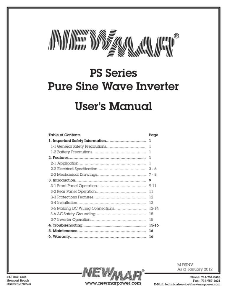 PS Series Pure Sine Wave Inverter User’s Manual Table of Contents Page 1. Important Safety Information………………………...... 1 1-1 General Safety Precautions………………………….. 1 1-2 Battery Precautions…………………………………..... 1 2. Features…………………………………………………...... 1 2-1 Application…………………………………………….... 1 2-2 Electrical Specification………………………………... 3 - 6 2-3 Mechanical Drawings……………………………….... 7 - 8 3. Introduction……………………………………………....... 9 3-1 Front Panel Operation……………………………….... 9-11 3-2 Rear Panel Operation………………………………..... 11 3-3 Protections Features………………………………….... 12 3-4 Installation……………………………………………..... 12 3-5 Making DC Wiring Connections…………………….. 12-14 3-6 AC Safety Grounding………………………………….. 15 3-7 Inverter Operation……………………………………... 15 4. Troubleshooting......................................................... 15-16 5. Maintenance……………………………………………..... 16 6. Warranty…………………………………………………..... 16 M-PSINV As of January 2012 P.O. Box 1306 Newport Beach California 92663 www.newmarpower.com Phone: 714-751-0488 Fax: 714-957-1621 E-Mail: technicalservice@newmarpower.com WARNING! Before using the Inverter, read and save the safety instructions. 1. Important Safety Instructions 1-1. General Safety Precautions 1-1-1. Do not expose the Inverter to rain, snow, spray, bilge or dust. To reduce risk of hazard, do not cover or obstruct the ventilation openings. Do not install the Inverter in a zero-clearance compartment. Overheating may result. 1-1-2. To avoid a risk of fire and electronic shock, make sure that existing wiring is in good electrical condition and not undersized. Do not operate the Inverter with damaged or substandard Wiring. 1-1-3. There are some components in the inverter can cause arcs and sparks. To prevent from fire or explosion, do not put batteries, flammable materials, or anything should be ignition–protected around the inverter. 1-2. Precautions When Working with Batteries 1-2-1. If battery acid contacts skin or clothing, you shall wash it out with soap and water immediately. If battery acid contacts your eyes, you shall wash it out with cold running water for at least 20 minutes and get medical attention immediately. 1-2-2. Never smoke or make a spark or flame in the vicinity of the battery or the engine. 1-2-3. Do not drop a metal tool on the battery. The resulting spark or short-circuit on the battery of other electrical part may cause an explosion. 1-2-4. Remove personal metal items such as rings, bracelets, necklaces, and watches when operating with a lead-acid batteries. Doing so may cause short circuit and very high temperature, which can melt metal items and even burn you. 2. Features • Pure sine wave output (THD < 3%) • Output frequency: 50/60Hz switch selections • Input & output fully isolated design • Power Saving Mode to conserve energy • High efficiency 89~94% • Driving highly reactive & capacitive loads at start moment • Tri-Color indicators show input voltage & output load level • Loading controlled cooling fan • Advanced microprocessor • Protection: Input low voltage Overload Short circuit • Low battery alarm Input over voltage Over temperature 2-1. Application 2-1-1. Power tools – circular saws, drills, grinders, sanders, buffers, weed and hedge trimmers, air compressors, etc. 2-1-2. Office equipment – computers, printers, monitors, facsimile machines, scanner, etc. Pg. 1 P.O. Box 1306 Newport Beach California 92663 www.newmarpower.com Phone: 714-751-0488 Fax: 714-957-1621 E-Mail: technicalservice@newmarpower.com 2-1-3. Household appliances – vacuum cleaners, fans, fluorescent and incandescent lights, shavers, sewing machines. 2-1-4. Kitchen appliances – coffee makers, blenders, ice markers, toasters, etc. 2-1-5. Industrial equipment – metal halide lamp, high – pressure sodium lamp, etc. 2-1-6. Home entertainment electronics – television, VCRs, video games, stereos, musical instruments, satellite equipment, etc. 2-2 Electrical Specifications Specification Model No. Model 12-700PS 24-700PS 48-700PS 12-700FPS Continuous Output Power 700W Maximum Output Power 770W Surge Rating (Max.) 24-700FPS 48-700FPS 254V 48V 1400W Input Voltage 12V Output Voltage 24V 48V 12V 100 / 110 / 120V +/-5% Frequency (Switch Selections) 220 / 230 / 240 +/-3% 50 / 60Hz +/- 0.05% Output Waveform Pure Sine Wave (THD <3%) Efficiency (full load) Max. 89.0% 91.0% 92.0% 91.0% 93.0% 94.0% No Load Current Draw (Max.) 1.25A 0.64A 0.31A 1.20A 0.60A 0.28A Stand-By Current Draw (Max.) 0.25A 0.15A 0.08A 0.25A 0.15A 0.08A 10.5 - 15 21.0 - 30 42 - 60 10.5 - 15 21.0 - 30 42 - 60 *1 Input Voltage Regulation (VDC) Input Level Indicator Red / Orange / Green LED Load Level Indicator Failure Indicator Protection Red LED Overload, Short Circuit, Reverse Polarity (Fuse), Over/Under Input Voltage, Over Temperature Remote Control Unit CR-8 Safety Certification EMC UL458 EN60950-1 FCC Class A EN55022: 1997 EN55024: 1997 EN61000-3-2: 1998 EN61000-3-3: 1998 Operating Temperature Range 0 - 40 ºC Storage Temperature Range Cooling Dimensions e-mark e13 022694 -30 to 70 ºC Loading controlled cooling fan 13.39” D x 7.17” W x 3.46” H Weight 8.8 Lbs. Note: The specifications are subject to change without notice. Pg. 2 P.O. Box 1306 Newport Beach California 92663 www.newmarpower.com Phone: 714-751-0488 Fax: 714-957-1621 E-Mail: technicalservice@newmarpower.com Specification Model No. Model 12-1000PS 24-1000PS 48-1000PS 12-1000FPS 24-1000FPS Continuous Output Power 1000W Maximum Output Power 1100W Surge Rating (Max.) 48-1000FPS 2