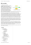 PID controller - Wikipedia, the free encyclopedia 29/08/2010 23:18 PID controller From Wikipedia, the free encyclopedia A proportional–integral–derivative controller (PID controller) is a generic control loop feedback mechanism (controller) widely used in industrial control systems – a PID is the most commonly used feedback controller. A PID controller calculates an "error" value as the difference between a measured process variable and a desired setpoint. The controller attempts to minimize the error by adjusting the process control A block diagram of a PID controller inputs. In the absence of knowledge of the underlying process, a PID controller is the best controller. [1] However, for best performance, the PID parameters used in the calculation must be tuned according to the nature of the system – while the design is generic, the parameters depend on the specific system. The PID controller calculation (algorithm) involves three separate parameters, and is accordingly sometimes called three-term control: the proportional, the integral and derivative values, denoted P, I, and D. The proportional value determines the reaction to the current error, the integral value determines the reaction based on the sum of recent errors, and the derivative value determines the reaction based on the rate at which the error has been changing. The weighted sum of these three actions is used to adjust the process via a control element such as the position of a control valve or the power supply of a heating element. Heuristically, these values can be interpreted in terms of time: P depends on the present error, I on the accumulation of past errors, and D is a prediction of future errors, based on current rate of change. [2] By tuning the three constants in the PID controller algorithm, the controller can provide control action designed for specific process requirements. The response of the controller can be described in terms of the responsiveness of the controller to an error, the degree to which the controller overshoots the setpoint and the degree of system oscillation. Note that the use of the PID algorithm for control does not guarantee optimal control of the system or system stability. Some applications may require using only one or two modes to provide the appropriate system control. This is achieved by setting the gain of undesired control outputs to zero. A PID controller will be called a PI, PD, P or I controller in the absence of the respective control actions. PI controllers are fairly common, since derivative action is sensitive to measurement noise, whereas the absence of an integral value may prevent the system from reaching its target value due to the control action. Note: Due to the diversity of the field of control theory and application, many naming conventions for the relevant variables are in common use. Contents 1 Control loop basics 2 PID controller theory 2.1 Proportional term 2.1.1 Droop 2.2 Integral term 2.3 Derivative term 2.4 Summary 3 Loop tuning 3.1 Stability 3.2 Optimum behavior 3.3 Overview of methods 3.4 Manual tuning 3.5 Ziegler–Nichols method 3.6 PID tuning software 4 Modifications to the PID algorithm 5 History 5.1 Minorsky's work 6 Limitations of PID control 6.1 Linearity 6.2 Noise in derivative 7 Improvements 7.1 Feed-forward http://en.wikipedia.org/wiki/PID_controller Page 1 of 12 PID controller - Wikipedia, the free encyclopedia 29/08/2010 23:18 7.2 Other improvements 8 Cascade control 9 Physical implementation of PID control 10 Alternative nomenclature and PID forms 10.1 Ideal versus standard PID form 10.2 Laplace form of the PID controller 10.3 Series/interacting form 10.4 Discrete implementation 10.5 Pseudocode 11 See also 12 References 13 External links 13.1 PID tutorials 13.2 Special topics and PID control applications Control loop basics Further information: Control loop A familiar example of a control loop is the action taken when adjusting hot and cold faucet valves to maintain the faucet water at the desired temperature. This typically involves the mixing of two process streams, the hot and cold water. The person touches the water to sense or measure its temperature. Based on this feedback they perform a control action to adjust the hot and cold water valves until the process temperature stabilizes at the desired value. Sensing water temperature is analogous to taking a measurement of the process value or process variable (PV). The desired temperature is called the setpoint (SP). The input to the process (the water valve position) is called the manipulated variable (MV). The difference between the temperature measurement and the setpoint is the error (e), that quantifies whether the water is too hot or too cold and by how much. After measuring the temperature (PV), and then calculating the error, the controller decides when to change the tap position (MV) and by how much. When the controller first turns the valve on, they may turn the hot valve only slightly if warm water is desired, or they may open the valve all the way if very hot water is desired. This is an example of a simple proportional control. In the event that hot water does not arrive quickly, the controller may try to speed-up the process by opening up the hot water valve more-and-more as time goes by. This is an example of an integral control. By using only the proportional and integral control methods, it is possible that in some systems the water temperature may oscillate between hot and cold, because the controller is adjusting the valves too quickly and over-compensating or overshooting the setpoint. In the interest of achieving a gradual convergence at the desired temperature (SP), the controller may wish to damp the anticipated future oscillations. So in order to compensate for this effect, the controller may elect to temper their adjustments. This can be thought of as a derivative control method. Making a change that is too large when the error is small is equivalent to a high 