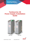 Tambourine 20 Power Supply Installation Guide 480VAC Model June 2014 (Ver. 1.501) 230VAC Model www.elmomc.com Notice This guide is delivered subject to the following conditions and restrictions: • This guide contains proprietary information belonging to Elmo Motion Control Ltd. Such information is supplied solely for the purpose of assisting users of the Tambourine 20 power supply in its installation. • The text and graphics included in this manual are for the purpose of illustration and reference only. The specifications on which they are based are subject to change without notice. • Information in this document is subject to change without notice. Document no. MAN-TAMIG (Ver. 1.501) Copyright 2014 Elmo Motion Control Ltd. All rights reserved. Catalog Number Table of Contents |Warnings|www.elmomc.com Revision History Version Release Date Changes/Remarks 1.0 February 2011 Initial Release 1.1 July 2011 Replaced figure on Section 3.4.7 1.2 Sep 2011 Addition of Warnings and Cautions sections, Electrical and Mechanical specifications, and Mounting conditions. 1.3 Jan 2012 Added two tables to section 1.1 regarding remnant charge after power off. 1.4 July 2012 Changes to overvoltage and shunt on pages 8, 11 1.401 February 2013 AC Input frequency Range added 1.402 February 2013 AC Input frequency changed to 20 to 500 Hz 1.500 March 2014 Added Section 3.5: Heat Dissipation New document template 1.501 June 2014 Table of Contents Document update |Warnings|www.elmomc.com Table of Contents MAN-TAMIG (Ver. 1.501) Chapter 1: 1.1 1.2 1.3 1.4 1.5 Warnings .................................................................................................................... 7 Cautions ...................................................................................................................... 7 Directives and Standards ............................................................................................ 8 CE Mark Conformance................................................................................................ 8 Warranty Information ................................................................................................ 8 Chapter 2: 2.1 2.2 2.3 3.2 3.3 3.4 3.5 Product Description .....................................................................................9 Standard Features ....................................................................................................10 Fault Protection ........................................................................................................10 Technical Specifications............................................................................................10 2.3.1 Dimensions ................................................................................................11 2.3.1.1 Housing of the 36 VAC up to 230 VAC Models .........................11 2.3.1.2 Housing of 420 VAC up to 480 VAC Models .............................11 2.3.2 Electrical and Mechanical Specifications ...................................................12 2.3.3 Shunt Regulator .........................................................................................13 Chapter 3: 3.1 Operating Safely..........................................................................................6 Installation ................................................................................................ 14 Before You Begin ......................................................................................................14 3.1.1 Site Requirements .....................................................................................14 3.1.2 Hardware Requirements ...........................................................................14 3.1.2.1 AC Input Requirements ............................................................14 3.1.2.2 Recommended Wire Cross-Sections (All Models) ....................14 Unpacking the Components .....................................................................................15 Connectors ...............................................................................................................16 3.3.1 Connector Types for 36 VAC up to 230 VAC Models .................................16 3.3.2 Connector Types for 420 VAC up to 480 VAC Models ...............................17 3.3.3 Main AC Input Power Connector Pinout ...................................................18 3.3.4 4x DC-Output Connector Pinout................................................................19 Mounting and Wiring the Tambourine 20 ...............................................................20 3.4.1 Mounting ...................................................................................................20 3.4.2 Wiring Guidelines ......................................................................................20 3.4.3 AC Power Source .......................................................................................21 3.4.4 Direct-to-Mains (No Isolation Transformer) Wiring Diagrams ..................22 3.4.5 Isolated AC Supplies (with an Isolation Transformer) Wiring Diagrams ...24 3.4.6 Connecting the Main Power Cable ............................................................26 3.4.7 Connecting the DC Output Cable ..............................................................27 3.4.8 DC-Link Shared Connection .......................................................................28 Heat Dissipation .......................................................................................................29 3.5.1 Tambourine 20 Thermal Data....................................................................29 3.5.2 Heat Dissipation Data ................................................................................29 3.5.3 How to Use the Charts...............................................................................30 Table of Contents |Warnings|www.elmomc.com 4 Table of Contents MAN-TAMIG (Ver. 1.501) Chapte