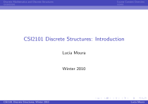 Discrete Mathematics and Discrete Structures Course Content Overview CSI2101 Discrete Structures: Introduction Lucia Moura Winter 2010 CSI2101 Discrete Structures, Winter 2010 Lucia Moura Discrete Mathematics and Discrete Structures Course Content Overview Why Discrete Mathematics ? Discrete Mathematics is essential to Computer Science! The various aspects of discrete mathematics form the foundation for: CSI2101 Discrete Structures, Winter 2010 Lucia Moura Discrete Mathematics and Discrete Structures Course Content Overview Why Discrete Mathematics ? Discrete Mathematics is essential to Computer Science! The various aspects of discrete mathematics form the foundation for: I modelling computing structures CSI2101 Discrete Structures, Winter 2010 Lucia Moura Discrete Mathematics and Discrete Structures Course Content Overview Why Discrete Mathematics ? Discrete Mathematics is essential to Computer Science! The various aspects of discrete mathematics form the foundation for: I I modelling computing structures designing programs and algorithms CSI2101 Discrete Structures, Winter 2010 Lucia Moura Discrete Mathematics and Discrete Structures Course Content Overview Why Discrete Mathematics ? Discrete Mathematics is essential to Computer Science! The various aspects of discrete mathematics form the foundation for: I I I modelling computing structures designing programs and algorithms reasoning about programs and algorithms CSI2101 Discrete Structures, Winter 2010 Lucia Moura Discrete Mathematics and Discrete Structures Course Content Overview Why Discrete Mathematics ? Discrete Mathematics is essential to Computer Science! The various aspects of discrete mathematics form the foundation for: I I I I modelling computing structures designing programs and algorithms reasoning about programs and algorithms solving real-world problems using the computer CSI2101 Discrete Structures, Winter 2010 Lucia Moura Discrete Mathematics and Discrete Structures Course Content Overview Why Discrete Mathematics ? Discrete Mathematics is essential to Computer Science! The various aspects of discrete mathematics form the foundation for: I I I I I modelling computing structures designing programs and algorithms reasoning about programs and algorithms solving real-world problems using the computer in particular, solving problems in information technology, i.e. problems involving computers, communication, information. CSI2101 Discrete Structures, Winter 2010 Lucia Moura Discrete Mathematics and Discrete Structures Course Content Overview Why Discrete Mathematics ? Discrete Mathematics is essential to Computer Science! The various aspects of discrete mathematics form the foundation for: I I I I I modelling computing structures designing programs and algorithms reasoning about programs and algorithms solving real-world problems using the computer in particular, solving problems in information technology, i.e. problems involving computers, communication, information. Aspects of discrete mathematics: CSI2101 Discrete Structures, Winter 2010 (David J. Hunter, Essential of Discrete Mathematics, 2009) Lucia Moura Discrete Mathematics and Discrete Structures Course Content Overview Why Discrete Mathematics ? Discrete Mathematics is essential to Computer Science! The various aspects of discrete mathematics form the foundation for: I I I I I modelling computing structures designing programs and algorithms reasoning about programs and algorithms solving real-world problems using the computer in particular, solving problems in information technology, i.e. problems involving computers, communication, information. Aspects of discrete mathematics: 1 (David J. Hunter, Essential of Discrete Mathematics, 2009) logical thinking CSI2101 Discrete Structures, Winter 2010 Lucia Moura Discrete Mathematics and Discrete Structures Course Content Overview Why Discrete Mathematics ? Discrete Mathematics is essential to Computer Science! The various aspects of discrete mathematics form the foundation for: I I I I I modelling computing structures designing programs and algorithms reasoning about programs and algorithms solving real-world problems using the computer in particular, solving problems in information technology, i.e. problems involving computers, communication, information. Aspects of discrete mathematics: 1 2 (David J. Hunter, Essential of Discrete Mathematics, 2009) logical thinking relational thinking CSI2101 Discrete Structures, Winter 2010 Lucia Moura Discrete Mathematics and Discrete Structures Course Content Overview Why Discrete Mathematics ? Discrete Mathematics is essential to Computer Science! The various aspects of discrete mathematics form the foundation for: I I I I I modelling computing structures designing programs and algorithms reasoning about programs and algorithms solving real-world problems using the computer in particular, solving problems in information technology, i.e. problems involving computers, communication, information. Aspects of discrete mathematics: 1 2 3 (David J. Hunter, Essential of Discrete Mathematics, 2009) logical thinking relational thinking recursive thinking CSI2101 Discrete Structures, Winter 2010 Lucia Moura Discrete Mathematics and Discrete Structures Course Content Overview Why Discrete Mathematics ? Discrete Mathematics is essential to Computer Science! The various aspects of discrete mathematics form the foundation for: I I I I I modelling computing structures designing programs and algorithms reasoning about programs and algorithms solving real-world problems using the computer in particular, solving problems in information technology, i.e. problems involving computers, communication, information. Aspects of discrete mathematics: 1 2 3 4 (David J. Hunter, Essential of Discrete Mathematics, 2009) logical thinking relational thinking recursive thinking quantitative thinking (counting) CSI2101 Discrete Structures, Winter 2010 Lucia Moura Discrete Mathematics and Discrete Structures Course C