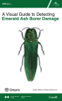 cfs.nrcan.gc.ca A Visual Guide to Detecting Emerald Ash Borer Damage Ontario Ministry of Natural Resources Library and Archives Canada Cataloguing in Publication A visual guide to detecting emerald ash borer damage / Peter de Groot ... [et al.]. Issued also in French under title: Guide visuel pour la détection des dommages causés par l’agrile du frêne. ISBN 0-662-43152-9 Cat. no.: Fo124-6/2006E 1. Ash (Plants)--Diseases and pests--Identification. 2. Emerald ash borer. I. De Groot, P. (Peter) II. Great Lakes Forestry Centre SB608.A77V57 2006 634.9’7387 C2006-980112-6 Copies of this publication are available at no charge from: Canadian Forest Service, Great Lakes Forestry Centre 1219 Queen Street East, Sault Ste. Marie, Ontario, P6A 2E5 (705) 949-9461 © Her Majesty the Queen in Right of Canada 2006 Cover photo by: Klaus Bolte, Natural Resources Canada A Visual Guide to Detecting Emerald Ash Borer Damage Prepared by Peter de Groot1, William D. Biggs1, D. Barry Lyons1, Taylor Scarr2, Ed Czerwinski3, Hugh J. Evans1, Wayne Ingram2, and Ken Marchant4 1 Natural Resources Canada, Canadian Forest Service, Great Lakes Forestry Centre, 1219 Queen St. E, Sault Ste. Marie, Ontario, P6A 2E5 2 Ontario Ministry of Natural Resources, Forest Management Branch, Forest Health and Silviculture Section, Suite 400, 70 Foster Dr., Sault Ste Marie, Ontario, P6A 6V5 3 Ontario Ministry of Natural Resources, Forest Management Branch, Forest Health and Silviculture Section, 300 Water St, Box 7000, Peterborough, Ontario, K9J 8M5 4 Canadian Food Inspection Agency, Ontario Area, Network specialist - Emerald ash borer, 174 Stone Road West,Guelph, Ontario, N1G 4S9 TABLE OF CONTENTS INTRODUCTION.................................................................1 HOW TO USE THIS GUIDE...............................................2 INSECT LIFE STAGES...........................................................3 Adult............................................................................................. 3 Egg................................................................................................. 3 Larva............................................................................................. 4 Pupa............................................................................................... 4 SIGNS AND SYMPTOMS....................................................5 Insect Signs.................................................................................. 5 Larval gallery.................................................................................. 5 Exit hole.......................................................................................... 7 Leaf notch....................................................................................... 7 Other signs.................................................................................. 8 Tree Symptoms........................................................................... 9 Epicormic shoots........................................................................... 9 Bark deformities............................................................................ 10 Yellow foliage, dead branches, and thin tree crowns........... 11 Heavy seed production................................................................ 11 Trees in decline........................................................................... 12 Tree 1................................................................................12 Tree 2................................................................................13 Tree 3................................................................................14 Tree 4................................................................................15 WHAT CAN I DO TO HELP?............................................16 WHOM DO I CONTACT..................................................16 INTRODUCTION The emerald ash borer (Agrilus planipennis Fairmaire) is a shiny emerald green beetle that kills living ash trees. Ash (genus Fraxinus) is found throughout many of the forests in eastern North America and it is a commonly planted street and landscape tree. The beetle arrived in North America from Asia and was first noticed in 2002 in Detroit, Michigan, and in Windsor, Ontario. It was present in these areas for a number of years before being discovered, and has also been detected in southwestern Ontario, Michigan, Ohio, and Indiana. It is likely that this beetle will spread by natural means and through movement of ash products such as firewood, nursery stock, and logs. The beetle is a very serious pest and already has killed millions of trees. The earliest possible detection of this insect is essential to help reduce its spread and damage. This guidebook will help people interested in tree care to detect trees that have been attacked and damaged by the emerald ash borer. Ideally, it is best to find beetles in an area before they harm or kill trees. Unfortunately, this is not easy, and for now, we can only rely on the visual signs and symptoms as a guide to detect damage by the emerald ash borer. 1 HOW TO USE THIS GUIDE The guidebook has three sections. You can start anywhere. The blue section is about the emerald ash borer itself and provides pictures and a brief description of the insect’s life stages. The green section is about the damage done to trees by the beetles. This section shows pictures of the various signs of physical damage to a tree by actions of the insect and includes larval galleries, exit holes from a tree, and feeding notches in leaves. The section also includes the symptoms expressed by the tree in response to insect attack. This is what you will likely see first and includes premature yellowing of foliage, dead branches, thinning crowns, bark cracks, and/or unusual shoots growing along the stem of the tree. We also show pictures of bark damaged by woodpeckers and squirrels, which feed on the insects. In the last part o