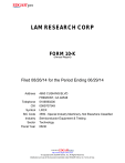LAM RESEARCH CORP FORM 10-K (Annual Report) Filed 08/26/14 for the Period Ending 06/29/14 Address Telephone CIK Symbol SIC Code Industry Sector Fiscal Year 4650 CUSHING BLVD FREMONT, CA 94538 5106590200 0000707549 LRCX 3559 - Special Industry Machinery, Not Elsewhere Classified Semiconductor Equipment & Testing Technology 06/30 http://www.edgar-online.com © Copyright 2016, EDGAR Online, Inc. All Rights Reserved. Distribution and use of this document restricted under EDGAR Online, Inc. Terms of Use. Table of Contents UNITED STATES SECURITIES AND EXCHANGE COMMISSION WASHINGTON, D.C. 20549 FORM 10-K (Mark One) ANNUAL REPORT PURSUANT TO SECTION 13 OR 15(d) OF THE SECURITIES EXCHANGE ACT OF 1934 For the fiscal year ended June 29, 2014 OR TRANSITION REPORT PURSUANT TO SECTION 13 OR 15(d) OF THE SECURITIES EXCHANGE ACT OF 1934 For the transition period from to . Commission file number: 0-12933 LAM RESEARCH CORPORATION (Exact name of registrant as specified in its charter) Delaware 94-2634797 (State or other jurisdiction of incorporation or organization) (I.R.S. Employer Identification No.) 4650 Cushing Parkway Fremont, California 94538 (Address of principal executive offices) (Zip code) Registrant’s telephone number, including area code: (510) 572-0200 Securities registered pursuant to Section 12(b) of the Act: Title of class Name of exchange on which registered Common Stock, Par Value $0.001 Per Share The NASDAQ Stock Market LLC (NASDAQ Global Select Market) Securities registered pursuant to Section 12(g) of the Act: None (Title of class) Indicate by check mark if the registrant is a well-known seasoned issuer, as defined in Rule 405 of the Securities Yes No Indicate by check mark if the registrant is not required to file reports pursuant to Section 13 or Section 15(d) of the Act. Yes No Indicate by check mark whether the registrant (1) has filed all reports required to be filed by Section 13 or 15(d) of the Securities Exchange Act of 1934 during the preceding 12 months (or for such shorter period that the registrant was required to file such reports), and (2) has been subject to such filing requirements for the past 90 days. Yes No Indicate by check mark whether the registrant has submitted electronically and posted on its corporate Web site, if any, every Interactive Data File required to be submitted and posted pursuant to Rule 405 of Regulation S-T during the preceding 12 months (or for such shorter period that the registrant was required to submit and post such files). Yes No Indicate by check mark if disclosure of delinquent filers pursuant to Item 405 of Regulation S-K is not contained herein, and will not be contained, to the best of registrant’s knowledge, in definitive proxy or information statements incorporated by reference in Part III of this Form 10-K or any amendment to this Form 10-K. Indicate by check mark whether the registrant is a large accelerated filer, an accelerated filer, a non-accelerated filer, or a smaller reporting company. See the definitions of “large accelerated filer,” “accelerated filer” and “smaller reporting company” in Rule 12b-2 of the Exchange Act. (Check one): Large accelerated filer Accelerated filer Act. Non-accelerated filer (Do not check if a smaller reporting company) Smaller reporting company Indicate by check mark whether the registrant is a shell company (as defined in Rule 12b-2 of the Exchange Act). Yes No The aggregate market value of the Registrant’s Common Stock, $0.001 par value, held by non-affiliates of the Registrant, as of December 29, 2013, the last business day of the most recently completed second fiscal quarter with respect to the fiscal year covered by this Form 10-K, was $6,184,276,734. Common Stock held by each officer and director and by each person who owns 5% or more of the outstanding Common Stock has been excluded from this computation in that such persons may be deemed to be affiliates. This determination of affiliate status is not necessarily a conclusive determination of such status for other purposes. As of August 20, 2014, the Registrant had 162,075,237 outstanding shares of Common Stock. Documents Incorporated by Reference Parts of the Registrant’s Proxy Statement for the Annual Meeting of Stockholders expected to be held on or about November 6, 2014 are incorporated by reference into Part III of this Form 10-K. (However, the Reports of the Audit Committee and Compensation Committee are expressly not incorporated by reference herein.) Table of Contents LAM RESEARCH CORPORATION 2014 ANNUAL REPORT ON FORM 10-K TABLE OF CONTENTS Page Part I. Item 1. Item 1A. Item 1B. Item 2. Item 3. Item 4. Part II. Item 5. Item 6. Item 7. Item 7A. Item 8. Item 9. Item 9A. Item 9B. Part III. Item 10. Item 11. Item 12. Item 13. Item 14. Part IV. Item 15. Signatures Exhibit Index Business Risk Factors Unresolved Staff Comments Properties Legal Proceedings Mine Safety Disclosures 3 14 26 26 26 26 Market for the Registrant’s Common Equity, Related Stockholder Matters and Issuer Purchases of Equity Securities Selected Financial Data Management’s Discussion and Analysis of Financial Condition and Results of Operations Quantitative and Qualitative Disclosures about Market Risk Financial Statements and Supplementary Data Changes in and Disagreements with Accountants on Accounting and Financial Disclosure Controls and Procedures Other Information 27 30 32 45 47 47 48 48 Directors, Executive Officers, and Corporate Governance Executive Compensation Security Ownership of Certain Beneficial Owners and Management and Related Stockholder Matters Certain Relationships and Related Transactions, and Director Independence Principal Accounting Fees and Services 49 49 49 49 49 Exhibits and Financial Statement Schedules 50 96 99 2 Table of Contents PART I CAUTIONARY STATEMENT REGARDING FORWARD-LOOKING STATEMENTS With the exception of historical facts, the statements contained in this discussion are forward-looking statements, which ar