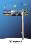 TM MAGNETIC LEVEL INDICATOR ® Worldwide Level and Flow SolutionsSM Vector™ is a rugged, reliable and costeffective Magnetic Level Indicator (MLI). Suitable for a variety of installations, Vector has many basic features and is precisionengineered and manufactured to ensure a long service life. MLIs are widely used to replace highmaintenance sight and gauge glass indicators and are increasingly used in new applications. Optional switches and transmitters are available to provide various output signals for level control. TM • Feedwater heaters • Blowdown flash tanks • Hot wells • Oil/water separators • Vacuum tower bottoms • Flash drums • Alkylation units • Surge tanks • Propane vessels • Gas chillers • Storage tanks • Deaerators ...and many others 2 Principle of Operation A float travels up and down in a chamber that is mounted to a liquidcontaining vessel. The float contains a magnetic assembly that interacts with an externally-mounted visual indicator. As the float follows the liquid surface or liquid-liquid interface, the magnetic field causes highly contrasting flags in the visual indicator to rotate. The result is a clearly defined representation of the liquid level in the vessel. Features • Rugged, industrial-grade construction • Field adjustable visual indicator for convenient viewing • Continuous measuring range up to 500 cm (197”) • Compatible with electronic point switches and continuous level transmitters • Media specific gravity as low as 0.55 • Shatter-resistant viewing window • Single magnet per flag to enhance float coupling effect and self-alignment The Vector™ float contains high-strength alloy magnets that facilitate a strong coupling with the externally-mounted visual indication, as well as any switches or transmitters. Every float is manufactured specifically for each application. Process pressure, temperature, and media specific gravity are all factored into the custom design. The Vector™ high-visibility visual indicator is constructed with quality materials and engineered for reliable performance. Each flag contains an alloy magnet that maximizes coupling with the float. The flags are mechanically limited to a half-rotation, which eliminates the possibility of over-rotation common with other magnetic level indicators. 3 Model: Digit: 4 M 1 2 1 3 4 5 6 7 8 9 10 11 12 3 Mounting Configuration & Chamber Construction 7 8 11 17 18 19 20 21 22 23 24 Connection Orientation Chamber Top Chamber Bottom A Side / Side Welded End Plate Threaded Plug (NPT) B Side / Side Threaded Plug (NPT) Welded End Plate 1 Side / Side Welded End Plate Flange 2 Side / Side Flange Welded End Plate Chamber/Flange Rating A 150# B 300# Material of Construction A 316/316L Stainless Steel Chamber B 316/316L Stainless Steel Chamber with Carbon Steel Fittings & Flanges C 304/304L Stainless Steel Chamber D 304/304L Stainless Steel Chamber with Carbon Steel Fittings & Flanges 1 PVC plastic 2 CPVC plastic Option A Option B Option 1 Option 2 Construction Grade A Industrial PED (digit 5 = A, B, C or D) 1 Industrial non-PED (digit 5 = 1 or 2) Chamber Flange Type N No Chamber Flange (digit 3 = A or B) A Raised Face Slip-On Flange (digit 3 = 1 or 2) P Full Face Socket Flange (for PVC and CPVC material only) Process Connection Type A 9 Process Connection Size A 1/2” M Male Threaded (NPT), up to 1-1/2” B 3/4” R C 1” D 1-1/2” E 2” (machined to 1” size) Raised Face Flange, Slip-On Style Butt Weld, up to 1-1/2” Van Stone Flange (PVC / CPVC only) Gasket Style for Chamber Flange (if applicable) N None (digit 3 = A or B) A Flexible Graphite Ring (digit 3 = 1 or 2) P EPDM Rubber (digit 5 = 1 or 2) 8 Process Connection Type Chamber Bolting Material N None (digit 3 = A or B) S Carbon steel zinc plating A-193 Gr. B7 / A-194 Gr. 2H (digit 3 = 1 or 2 and digit 5 = A or C) M Carbon steel A-193 Gr. B7 / A-194 Gr. 2H (digit 3 = 1 or 2 and digit 5 = B or D) RFSO Flange Option A 4 25 Mounting Configuration & Chamber Construction M Metric (cm) 1 10 16 Vector™ Magnetic Level Indicator Unit of Measure for Center-to-Center 6 15 3 2 5 14 Product Name 4 4 13 Threaded NPT Option M Buttweld Option R Model: Digit: 1 19 2 3 4 5 6 7 8 9 10 11 12‒13 Measuring Scale 16 12 13 14 15 16 17 18 19 1 20 14‒15 Vent Size & Type NN None 21 22 23 24 25 Drain Size & Type NN None 11 1/2” NPT with Hex Plug 11 1/2” NPT with Hex Plug 21 3/4” NPT with Hex Plug 21 3/4” NPT with Hex Plug Chamber Modification for Mounting of Optional Transmitter ➀ N No transmitter added 1 Jupiter Transmitter Top Mount without Offset, max 110 °C (230 °F) 2 Jupiter Transmitter Top Mount Offset, High Temperature Bend 3 Jupiter Transmitter Bottom Mount Offset, High Temperature Bend ➀ Vector can be combined with various externally-mounted accessories, including switches and transmitters. If SIL enhanced Jupiter transmitter is required then use model Atlas with float diagnostics indicator instead of model Vector. Refer to pages 6 & 7 for additional information regarding accessories. INSTRUMENTS Option N INSTRUMENTS Option 1 INSTRUMENTS INSTRUMENTS 17 Insulation Options N None (Plastic Flags, max: 110 °C (230 °F) / Metal Flags, max: 190 °C (375 °F)) Y Pad for Indicator Only V Indicator & Jupiter Pad ➀: 190 °C (375 °F) < T ≤ 260 °C (500 °F) ➀➁: 110 °C (230 °F) < T ≤ 260 °C (500 °F) A Insulation Blanket for Chamber ➀: Optional up to 260°C (500°F) ➀ Only available in combination with metal flags. ➁ Only available in combination with digit 16 = 2 or 3. 18 19 INSTRUMENTS INSTRUMENTS Option 2 23‒25 INSTRUMENTS Option 3 20‒22 Center-to-Center & VIL Measurement Type & Indication Style Interface level Total level 2 Yellow / Black Plastic Flags 6 Yellow / Black Plastic Flags 3 Red / White Plastic Flags (standard) 7 Red / White Plastic Flags 4 Red / Silver Metal Flags 8 Red / Silver Metal Flags Measuring Scale N None 1 Feet / Inches 2 Meters / Centimeters 3 Running Inches 4 Percent 