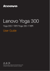 Lenovo Yoga 300 Yoga 300-11IBY/Yoga 300-11IBR User Guide lmn Read the safety notices and important tips in the included manuals before using your computer. Notes • Before using the product, be sure to read Lenovo Safety and General Information Guide first. • Some instructions in this guide may assume that you are using Windows® 8.1. If you are using another Windows operating system, some operations may be slightly different. If you are using other operating systems, some operations may not apply to you. • The features described in this guide are common to most models. Some features may not be available on your computer or your computer may include features that are not described in this user guide. • The illustrations in this manual may differ from the actual product. Please refer to the actual product. Regulatory Notice • For details, refer to Guides & Manuals at http://support.lenovo.com. First Edition (February 2015) © Copyright Lenovo 2015. LIMITED AND RESTRICTED RIGHTS NOTICE: If data or software is delivered pursuant to a General Services Administration “GSA” contract, use, reproduction, or disclosure is subject to restrictions set forth in Contract No. GS-35F-05925. Contents Chapter 1. Getting to know your computer ......................................... 1 Top view ...................................................................................................................... 1 Left-side view ............................................................................................................. 8 Right-side view .........................................................................................................13 Bottom view ..............................................................................................................16 Chapter 2. Starting to use Windows 8.1 ............................................ 17 Configuring the operating system for the first time ...........................................17 Operating system interfaces ...................................................................................17 The charms ................................................................................................................18 Putting the computer to sleep or shutting it down ............................................. 21 Touch screen operation ........................................................................................... 24 Connecting to a wireless network .........................................................................28 Help and support .....................................................................................................29 Chapter 3. Lenovo OneKey Recovery system .................................. 30 Chapter 4. Troubleshooting ................................................................ 32 Frequently asked questions ....................................................................................32 Troubleshooting .......................................................................................................37 Trademarks ........................................................................................... 40 i Chapter 1. Getting to know your computer Top view --------------------------------------------------------------------------------------------------ba e c d Note: The dashed areas indicate parts that are not visible externally. Attention: • When closing the display panel, be careful not to leave pens or any other objects in between the display panel and the keyboard. Otherwise, the display panel may be damaged. 1 Chapter 1. Getting to know your computer Use the camera for video communication. a Integrated camera (on select models) b Built-in microphones Capture sound which can be used for video conferencing, voice narration, or audio recording. c Multi-touch screen The LCD display with LED backlight provides brilliant visual output. Multi-touch function is available on this display. d Touch pad The touch pad functions as a conventional mouse. Touch pad: To move the pointer on the screen, slide your fingertip over the pad in the direction in which you want the pointer to move. Touch pad buttons: The functions of the left/right side correspond to those of the left/right mouse button on a conventional mouse. Note: You can enable/disable the touch pad by pressing F6 ( e Wireless LAN antennas 2 ). Connect to a wireless LAN adapter to send and receive wireless radio signals. Chapter 1. Getting to know your computer Using the keyboard Hotkeys You can access certain system settings quickly by pressing the appropriate hotkeys. : Mutes/unmutes the sound. : Enables/disables Airplane mode. : Decreases the volume level. : Displays all currently active apps. : Increases the volume level. : Turns on/off the backlight of the LCD screen. : Closes the currently active window. : Toggles the display between the computer and an external device. : Refreshes the desktop or the currently active window. : Decreases display brightness. : Enables/disables the touch pad. : Increases display brightness. Note: If you changed the Hotkey Mode from Enabled to Disabled in the BIOS setup utility, you will need to press the Fn key in combination with the appropriate hotkey. 3 Chapter 1. Getting to know your computer Function key combinations Through the use of the function keys, you can change operational features instantly. To use this function, press and hold Fn a; then press one of the function keys b. a b The following describes the features of each function key. Fn + PgUp: Activates the Home function. Fn + PgDn: 4 Activates the End function. Chapter 1. Getting to know your computer Positioning the display panel The display panel can be opened to any angle up to 360 degrees. Notebook Mode Suitable for tasks that require a keyboard and mouse (such as creating documents, writing e-mails, and so on). 5 Chapter 1. Getting to know your computer Stand Mode (Theater Mode) Suitable for tas