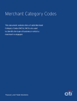 Merchant Category Codes This document contains lists of valid Merchant Category Codes (MCCs). MCCs are used to identify the type of business in which a merchant is engaged. Treasury and Trade Solutions Merchant Category Codes | Table of Contents Table of Contents Overview............................................................................................2 About This Manual..........................................................................2 General Merchant Category Codes MCCs 0001–1499 (Agricultural Services)......................... 3 MCCs 1500–2999 (Contracted Services).......................... 3 MCCs 4000–4799 (Transportation Services)................. 4 MCCs 4800–4999 (Utility Services).................................. 5 MCCs 5000–5599 (Retail Outlet Services)...................... 5 MCCs 5600–5699 (Clothing Stores).................................. 7 MCCs 5700–7299 (Miscellaneous Stores)........................ 8 MCCs 7300–7999 (Business Services).............................. 11 MCCs 8000–8999 (Professional Services and Membership Organizations)......................................... 13 MCCs 9000–9999 (Government Services)...................... 14 Travel and Entertainment (T&E) Merchant Category Codes MCCs 3000–3299 (Airlines)................................................. 15 MCCs 3300–3499 (Car Rental)........................................... 25 MCCs 3500–3999 (Lodging)................................................ 26 Figures 1-1. Payment Brand Abbreviations................................... 2 2-1. Agricultural Services MCCs ....................................... 3 3-1. Contracted Services MCCs......................................... 3 4-1. Transportation Services MCCs.................................. 4 5-1. Utility Services MCCs................................................... 5 6-1. Retail Outlet Services MCCs....................................... 5 7-1. Clothing Stores MCCs................................................... 7 8-1. Miscellaneous Stores MCCs........................................ 8 9-1. Business Services MCCs.............................................. 11 10-1. Professional Services and Membership Organizations MCCs..................................................... 13 11-1. Government Services MCCs....................................... 14 12-1. Airline MCCs................................................................... 15 13-1. Car Rental MCCs............................................................ 25 14-1. Lodging MCCs................................................................ 26 Merchant Category Codes | Overview Overview Payment brands use merchant category codes (MCCs) to classify merchants and businesses by the type of goods or services provided. Payment brands, issuers and acquirers can use MCCs to categorize, track and restrict transactions. MCCs can be used for tax reporting, interchange promotion and gathering information about cardholder purchasing behavior. Often, MCCs are recognized by all payment brands; however, not all codes are recognized by all brands. Payment brands frequently add, eliminate or change the codes with regularly-scheduled enhancements. About This Manual This manual lists MCCs, the descriptions of the codes, and the payment brand(s) for which the codes are valid. The descriptions can differ slightly between payment brands. The following table has information about the abbreviation used for each payment brand. Payment Brand Abbreviation Visa V MasterCard M TSYS TSYS (This code is present on TSYS systems; however, other payment brands may no longer support the code.) Figure 1-1. Payment Brand Abbreviations 2 Merchant Category Codes | General Merchant Category Codes General Merchant Category Codes MCCs 0001–1499 (Agricultural Services) The following table includes a list of MCCs in the range 0001–1499 and the description for each code. MCC Description Valid Payment Brand(s) 0742 Veterinary Services V, M 0763 Agricultural Cooperatives V, M 0780 Horticultural and Landscaping Services V, M Figure 2-1. Agricultural Services MCCs MCCs 1500–2999 (Contracted Services) The following table includes a list of MCCs in the range 1500–2999 and the description for each code. MCC Description Valid Payment Brand(s) 1520 General Contractors–Residential and Commercial V, M 1711 Air Conditioning, Heating and Plumbing Contractors V, M 1731 Electrical Contractors V, M 1740 Insulation, Masonry, Plastering, Stonework and Tile Setting Contractors V, M 1750 Carpentry Contractors V, M 1761 Roofing and Siding, Sheet Metal Work Contractors V, M 1771 Concrete Work Contractors V, M 1799 Contractors, Special Trade Contractors–not elsewhere classified V, M 2741 Miscellaneous Publishing and Printing V, M 2791 Typesetting, Plate Making and Related Services V, M 2842 Sanitation, Polishing and Specialty Cleaning Preparations V, M Figure 3-1. Contracted Services MCCs 3 Merchant Category Codes | General Merchant Category Codes MCCs 4000–4799 (Transportation Services) The following table includes a list of MCCs in the range 4000–4799 and the description for each code. MCC Description Valid Payment Brand(s) 4011 Railroads–Freight V, M 4111 Transportation–Suburban and Local Commuter Passenger, including Ferries V, M 4112 Passenger Railways V, M 4119 Ambulance Services V, M 4121 Taxicabs and Limousines V, M 4131 Bus Lines V, M 4214 Motor Freight Carriers,Trucking–Local/Long Distance, Moving and Storage Companies, Local Delivery V, M 4215 Courier Services–Air and Ground, Freight Forwarders V, M 4225 Public Warehousing–Farm Products, Refrigerated Goods, Household Goods Storage V, M 4411 Cruise Lines V, M 4457 Boat Leases and Boat Rentals V, M 4468 Marinas, Marine Service/Supplies V, M 4511 Air Carriers, Airlines–not elsewhere classified V, M 4582 Airports, Airport Terminals, Flying Fields V, M 4722 Travel Agencies and Tour Operators V, M 4723 Package Tour Operators (Germany 