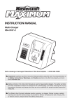 INSTRUCTION MANUAL Multi-Charger 054-3107-2 Parts missing or damaged? Questions? Toll-free Helpline – 1-800-689-9928 Important: Carefully read this Instruction Manual before using this tool. Pay close attention to all Safety Instructions, Warnings, and Caution sections. Use this tool properly, and only for its intended use. afety symbols in this Instruction Manual are used to flag possible dangers. The safety symbols S and their explanations require the operator’s full understanding. The safety warnings do not, by themselves, eliminate any danger, and they are not a substitute for proper accident prevention measures. his Safety Alert Symbol indicates caution, warning, or danger. Failure to obey a safety T warning can result in serious injury to yourself or others. To reduce the risk of injury, fire, or electric shock, always follow the safety precautions. TABLE OF CONTENTS Specifications. . . . . . . . . . . . . . . . . . . . . . . . . . . . . . . . . . . . . . . . . . . . . . . . . . . . . . . . . Rules for Safe Operation. . . . . . . . . . . . . . . . . . . . . . . . . . . . . . . . . . . . . . . . . . . . . . . . . Description . . . . . . . . . . . . . . . . . . . . . . . . . . . . . . . . . . . . . . . . . . . . . . . . . . . . . . . . . . . Operation . . . . . . . . . . . . . . . . . . . . . . . . . . . . . . . . . . . . . . . . . . . . . . . . . . . . . . . . . . . . Troubleshooting. . . . . . . . . . . . . . . . . . . . . . . . . . . . . . . . . . . . . . . . . . . . . . . . . . . . . . . . Maintenance. . . . . . . . . . . . . . . . . . . . . . . . . . . . . . . . . . . . . . . . . . . . . . . . . . . . . . . . . . Exploded View & Parts List. . . . . . . . . . . . . . . . . . . . . . . . . . . . . . . . . . . . . . . . . . . . . . . Warranty . . . . . . . . . . . . . . . . . . . . . . . . . . . . . . . . . . . . . . . . . . . . . . . . . . . . . . . . . . . . . Page 2 Page 2 Page 4 Page 5 Page 7 Page 7 Page 8 Page 9 SPECIFICATIONS Charger Input 120 V ~ 60 Hz AC only Compatible batteries 054-2962-0 054-1254-2 054-3105-6 054-3104-8 054-3106-4 Charger Weight 1 lb 11 oz (0.77 kg) Optimum Charging Temperature Ni-Cd: 50° to 86°F (10° to 30°C) Li-ion: 32° to 104°F (0° to 40°C) SAFETY RULES Before operating this charger, carefully read this Operating Manual and all of the labels affixed to the tool. Keep this manual in a safe place for future reference. IMPORTANT This charger should be serviced only by a qualified service technician. READ ALL INSTRUCTIONS CAREFULLY SAVE THESE INSTRUCTIONS GENERAL SAFETY RULES WORK AREA SAFETY • Keep the work area clean and well lit. Cluttered benches and dark areas invite accidents. • Do not operate power tools in an explosive environment, such as in the presence of flammable liquids, gases, or dust. Power tools create sparks, which may ignite the dust or fumes. • Keep bystanders, children, and visitors away when operating power tools. Distractions can cause the operator to lose control. ELECTRICAL SAFETY • The plug on the power cord must match the outlet. Page 2 054-3107-2 Multi-Charger_R12-08 • Do not alter the plug in any way. Do not use an adaptor plug with a grounded power tool. Using unaltered plugs and proper outlets reduces the risk of electric shock. • Avoid bodily contact with grounded surfaces, such as pipes, radiators, ranges, and refrigerators. There is an increased risk of electric shock if the operator’s body is grounded. • Do not expose power tools to rain or wet conditions. Water entering a power tool will increase the risk of electric shock. • Do not abuse the power cord. Never use the cord to carry the tool or to pull the plug out of an outlet. Keep the cord away from heat, oil, sharp edges, and moving parts. Damaged or entangled cords increase the risk of electric shock. • Use an outdoor extension cord that is suitable for outdoor use when operating a power tool outdoors. Using the proper extension cord reduces the risk of electric shock. SERVICE • This battery charger should be serviced by a qualified service technician, using identical replacement parts. This will ensure that the safety of the charger is maintained. SPECIFIC SAFETY RULES FOR THE CHARGER ѥѥWARNING: To reduce the risk of electric shock or damage to the charger and the battery, charge only recommend rechargeable batteries as specifically designated on your charger. Other types of batteries may burst, causing personal injury or damage. • For indoor use only. • Dry location use only. • Risk of fire and electric shock. • Risk of injury. • Charge only with Mastercraft® Maximum Batteries (054-3105-6,054-2962-0, 054-1254-2, 054-3104-8, 054-3106-4). Other types of battery packs may burst, causing injury to persons and damage. • Before using the battery charger, carefully read all instructions and cautionary markings in this manual, on the battery charger, on the battery, and on the tool that is powered by the battery, in order to prevent misuse of the products and possible injury or damage. • Do not use the charger outdoors, and do not expose it to wet or damp conditions. Water entering the charger will increase the risk of electric shock. • The use of any attachment that is not recommended or sold by the manufacturer of the battery charger may result in a risk of fire, electric shock, or personal injury. Following this rule will reduce the risk of electric shock, fire, and serious personal injury. • Do not abuse the cord or the charger. Do not use the cord to carry the charger or to disconnect the charger from the outlet. Doing so may cause damage to the cord or the charger, which may create an electric shock hazard. Replace a damaged cord immediately. • Verify that the cord is positioned so that it will not be stepped on, tripped over, come into contact with sharp edges or moving parts, or otherwise be subjected to damage or stress. This will reduce the risk of accidental falls, which could cause injury and damage to t