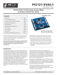 ® PI2121-EVAL1 Cool-ORing ™ Series PI2121-EVAL1 Full-Function Active ORing Evaluation Board User Guide Contents Cool-ORing™ Series Introduction . . . . . . . . . . . . . . . . . . . . . . . . . . . . . . Page 1 PI2121 Product Description . . . . . . . . . . . . . . . . . . Page 2 Evaluation Board Terminal Description . . . . . . . . Page 2 Evaluation Board Schematic . . . . . . . . . . . . . . . . . Page 3 Bill of Materials . . . . . . . . . . . . . . . . . . . . . . . . . . . Page 3 Evaluation Board Configuration . . . . . . . . . . . . . . Page 4 Test Procedure . . . . . . . . . . . . . . . . . . . . . . . . . . . . Page 4 Thermal Images . . . . . . . . . . . . . . . . . . . . . . . . . . . Page 9 PCB Layouts . . . . . . . . . . . . . . . . . . . . . . . . . . . . . Page 10 Evaluation Board Mechanical Drawing . . . . . . . Page 11 The PI2121-EVAL1 Evaluation Board is intended to acquaint the user with the benefits and features of the Cool-ORingTM PI2121 full function Active ORing solution. It is not designed to be installed in end-use equipment. Please read this document before setting up the PI2121-EVAL1 Evaluation Board and refer to the PI2121 product data sheet for device specifications, functional description and characteristics. PI2121-EVAL1 Evaluation Board featuring the Cool-ORing PI2121 Full-Function Active ORing Solution. During operation, the power devices and surrounding structures can be operated safely at high temperatures. • Remove power and use caution when connecting and disconnecting test probes and interface lines to avoid inadvertent short circuits and contact with hot surfaces. • When testing electronic products always use approved safety glasses. Follow good laboratory practice and procedures. Introduction The PI2121-EVAL1 allows the user to test the basic principle and operational characteristics of an Active ORing function in a redundant power architecture, while also experiencing the benefits and value of the PI2121 solution versus conventional Active ORing solutions. The PI2121-EVAL1 evaluation board is configured to receive two independent power source inputs, per a typical redundant power architecture, through two Active ORing channels that are combined to form a redundant power output. Each channel is capable of up to 24 A, and is suitable for redundant bus voltages up to 5 V. For high current Active ORing, above 24 A, the two channels provided on the evaluation board can be paralleled in a master/slave configuration and OR'd with a second evaluation board. Picor Corporation • www.picorpower.com The PI2121-EVAL1 evaluation board is designed with optimized PCB layout and component placement to represent a realistic high density final design for an embedded Active ORing solution for ≤ 5V bus applications requiring up to 24 A. This evaluation board is intended as an easy and simple way to test the electrical and thermal performance of the PI2121 Full-Function Active ORing solution. Both dynamic and steady state testing of the PI2121 can be completed on the PI2121-EVAL1 evaluation board, in addition to using the key features of the product. Dynamic testing can be completed under a variety of system level fault conditions to check for response time to faults. This document provides basic instructions for initial start-up and configuration of the evaluation board. Further information on the functionality of the PI2121 can be found in the PI2121 product data sheet. PI2121-EVAL1 User Guide Rev 1.1 Page 1 of 12 Cool-ORingTM PI2121 Product Description The Cool-ORing PI2121 is a complete full-function Active ORing solution with a high-speed ORing MOSFET controller and a very low on-state resistance MOSFET designed for use in redundant power system architectures. The PI2121 CoolORing solution is offered in an extremely small, thermally enhanced 5 mm x 7 mm LGA package and can be used in low voltage (≤ 5 Vbus) high side Active ORing applications. The PI2121 enables extremely low power loss with fast dynamic response to fault conditions, critical for high availability systems. A master / slave feature allows the paralleling of PI2121 solutions for high current Active ORing requirements. The PI2121, with its 1.5 mΩ internal MOSFET provides very high efficiency and low power loss during steady state operation, while achieving high-speed turn-off of the internal MOSFET during input power source fault conditions that cause reverse current flow. The PI2121 provides an active low fault flag output to the system during excessive forward current, light load, reverse current, over-voltage, under-voltage, and over-temperature fault conditions. A temperature sensing function indicates a fault if the maximum junction temperature exceeds 160°C. The under-voltage and over-voltage thresholds are programmable via an external resistor divider. Figure 1 shows a photo of the PI2121-EVAL1 evaluation board, with two PI2121 used to form the two Active ORing channels. The board is built with two identical Active ORing circuits with options and features that enable the user to fully explore the capabilities of the PI2121 Cool-ORing solution. Terminals Rating Vin1, Vin2 Vaux1, Vaux2, (R7 = R14 = 10 Ω) see Vaux section 8V / 24 A -0.3 to 17.3 V / 40 mA SL -0.3 to 8.0 V / 10 mA FT -0.3 to 17.3 V / 10 mA Figure 1 – PI2121-EVAL1 Evaluation Board (1.8" x 1.8") Terminal Vin1 Vaux1 Rtn1 Gnd SL1 SL2 Vin2 Vaux2 Rtn2 FT1 FT2 Vout Description Power Source Input #1 or bus input designed to accommodate up to 24 A continuous current. Auxiliary Input Voltage #1 to supply PI2121 (SiP1) VC power. Vaux1 should be equal to Vin1 plus 5 V or higher. See details in Auxiliary Power Supply (Vaux) section of the PI2121 data sheet. Vaux1 Return Connection: Connected to Ground plane Vin & Vout Return Connection: Three Gnd connections are available and are connected to a common point, the Ground plane. Input supplies Vin1 & Vin2 and the output load at Vout should all be connected to their respective local