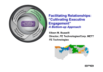Facilitating Relationships: “Cultivating Executive Engagement” A Bottom-up Approach Eileen M. Buzzelli Director, FE Technologies/Corp. METT FE Technologies Key Messages of Presentation Successful Executive engagement can occur when collaborative R&D is: Clearly linked to business GOALS Delivering measurable results/benefits from APPLYING technology COMMUNICATED in ongoing organizational dialogue Supported by PROCESSES and TOOLS to engage executives in understanding VALUE Not a buy-in, but a BELIEF . . . 2 Copyright © 2005 Electric Power Research Institute, Inc. All rights reserved. Who is FirstEnergy? » 5th largest IOU — $12.5B annual revenues, $33B in assets, 4.4 million customers » 20 generating plants (13,600 MW) » 135,000 T&D miles within 2 RTOs (MISO, PJM) » 13,800 employees in electric utility operations and over 2,100 employees in mechanical contracting operations Integrated 3 Regional Copyright © 2005 Electric Power Research Institute, Inc. All rights reserved. Retail Corp. Regulated T&D Operations Ohio Edison Company Pennsylvania Power Company Pennsylvania Electric Company The Cleveland Electric Illuminating Company The Toledo Edison Company Metropolitan Edison Company Jersey Central Power & Light Company FirstEnergy Solutions Corp. FirstEnergy Generation Corp. Commodity Operations Retail Sales FirstEnergy Nuclear Operating Company FirstEnergy Service Company Includes the following Shared-Services Organizations: • Corp. Finance • Legal • IT • Supply Chain • Business Development • First Communications, LLC FirstEnergy Ventures Corp. American Transmission Systems Incorporated FirstEnergy Facilities Services Group, LLC MYR Group Inc. FirstEnergy Telecom Services, Inc. Includes the following Plants: • Davis-Besse • Perry • Beaver Valley Technology Strategy addresses the DIVERSE needs of FirstEnergy Operating Companies & Subsidiaries 4 Copyright © 2005 Electric Power Research Institute, Inc. All rights reserved. FirstEnergy Technologies Group Retail Technologies & Tech Transfer Research Organizations Technology Sourcing Knowledge Management Energy Products Energy Management Facilities Services Commodity Operations Director FE Technologies Energy Delivery Technologies Transmission Operations Distribution Operations Customer Services Customer Call Center Demand Response Programs Energy Supply Technologies Fossil Generation Nuclear Generation Environmental Fuel Cell Strategy PA Demand Response Programs PJM/MISO DR Committees Interconnections NJ Clean Energy Programs Strategic Technologies Venture Capital Funds Direct Investments Business Analysis Long-term Regulatory Issues FET FET Mission Mission FE FE Technologies Technologies is is responsible responsible for for identifying, identifying, and and facilitating facilitating the the application application of of emerging emerging technologies technologies that that could could materially materially enhance enhance the the strategies strategies of of our our businesses businesses through through product product and and service service innovation innovation opportunities opportunities and and operational operational enhancements enhancements in in delivery delivery and and energy energy supply supply operations. operations. Driven Driven by by and and aligned aligned with with the the business business unit unit objectives, objectives, FE FE Technologies Technologies will will be be an an integral integral partner partner to to provide provide strategic strategic technology technology solutions, solutions, drawing drawing from from our our existing existing technology technology investments investments and and future future additions additions to to the the portfolio, portfolio, to to meet meet both both near-term near-term business business unit unit priorities priorities and and long-term long-term corporate corporate objectives. objectives. 5 Copyright © 2005 Electric Power Research Institute, Inc. All rights reserved. FirstEnergy Technologies Group Key Roles in assisting Business Units Business Unit Focus Tool Kit Technology Watch / Screen Due Diligence Experience Development Education / Communication Technology Access 6 DISCOVER Business Unit needs in order to provide appropriate solutions Enhance Business Unit’s “tool kit” as a resource to DISCOVER technology to address business needs DECIDE what new technologies help to fulfill Business Unit needs DECIDE which technologies to pursue based on technical criteria & detailed evaluations DEVELOP focused pilot projects associated with promising technologies DEPLOY learnings, serving as technical resource for what's on the horizon, and who the major players are DEPLOY knowledge management database that Business Units can access in the future Copyright © 2005 Electric Power Research Institute, Inc. All rights reserved. Six Six Key Key Elements Elements of of technology management management to to produce produce results: results: Technology Management Process Apply Results through Discipline 1. 1. 2. 2. 3. 3. 4. 4. 5. 5. 6. 6. Technology Technology Strategy Strategy Executive Executive Commitment Commitment Resource Resource Commitment Commitment Process Process Management Management Relationship Relationship Management Management Communications Communications Technology Strategy Align technology strategies with business objectives Make technology an integral part of business planning Executive Commitment Establish top-bottom senior-management leadership and participation Make technology acquisition planning & delivery process integral to business unit and corporate management process Establish cross-functional teams to implement technology initiatives Communicate technology development process to all stakeholders Resource Commitment 7 Implement highly visible technology acquisition organization Ensure accountability of technology strategies to deliver business results Fund technology acquisition endeavors sufficiently and continuously Copyright © 20